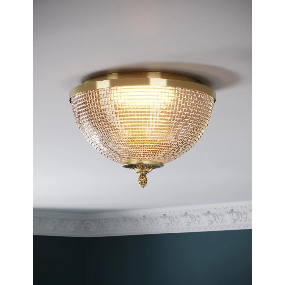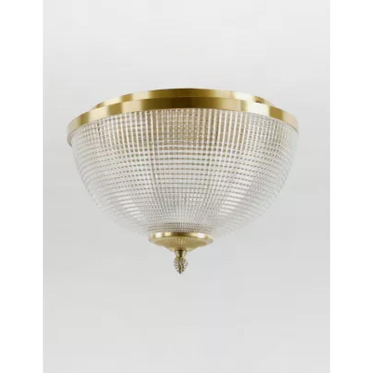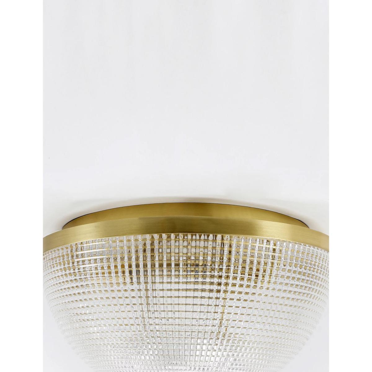 Bring a touch of art deco glamour to your home with the Eliza flush light. Textured glass creates a beautiful refractive glow when lit, while antique brass accents give a shimmering finish. It comes with a chain detail that can be adapted in length.