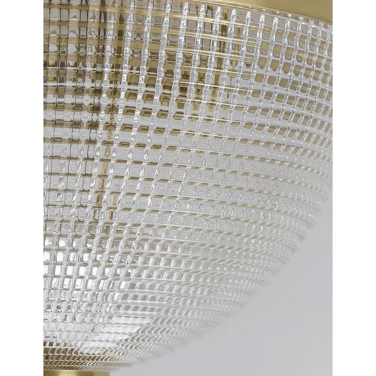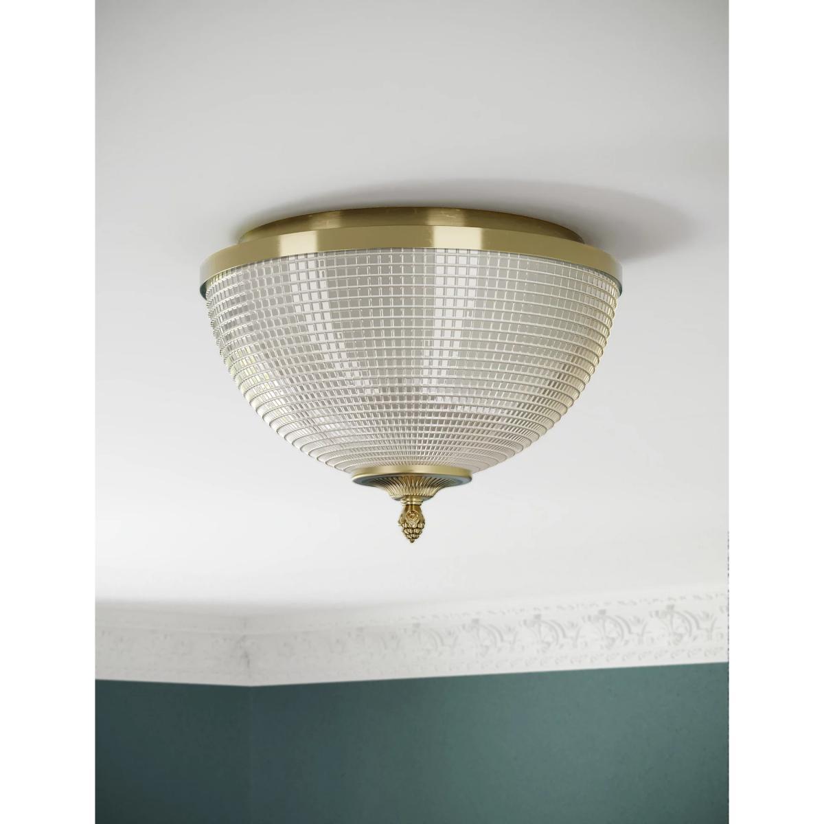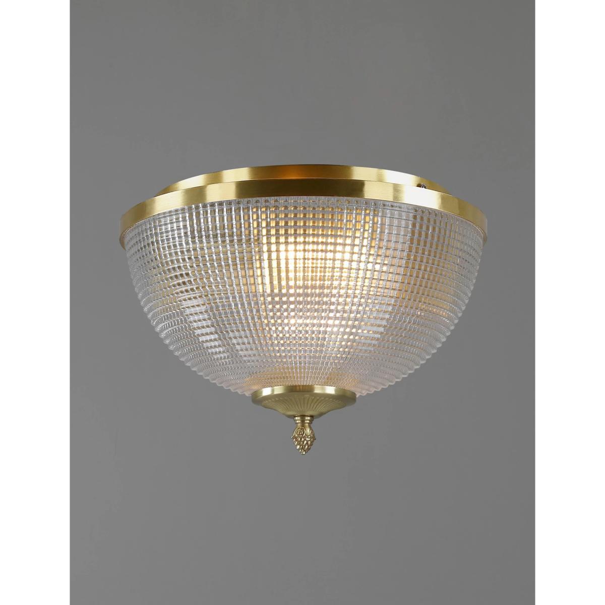 Bring a touch of art deco glamour to your home with the Eliza flush light. Textured glass creates a beautiful refractive glow when lit, while antique brass accents give a shimmering finish. It comes with a chain detail that can be adapted in length.