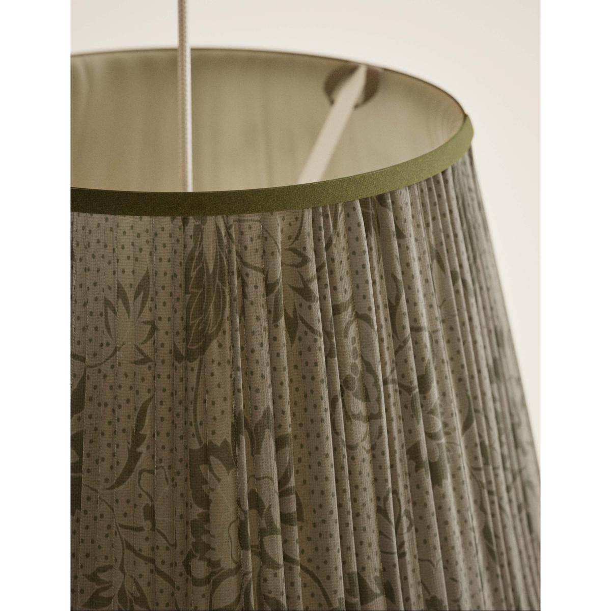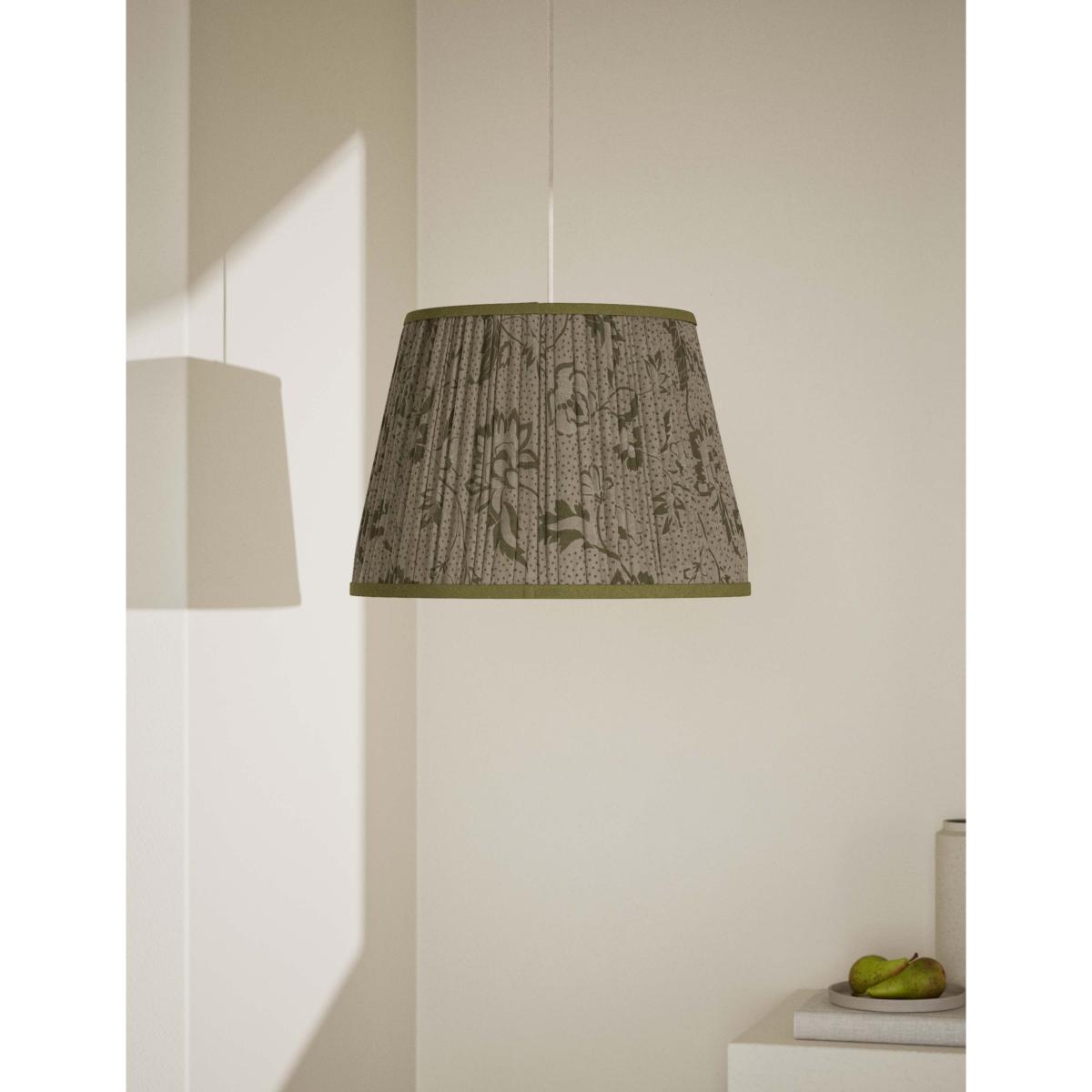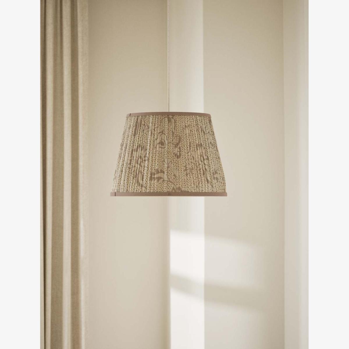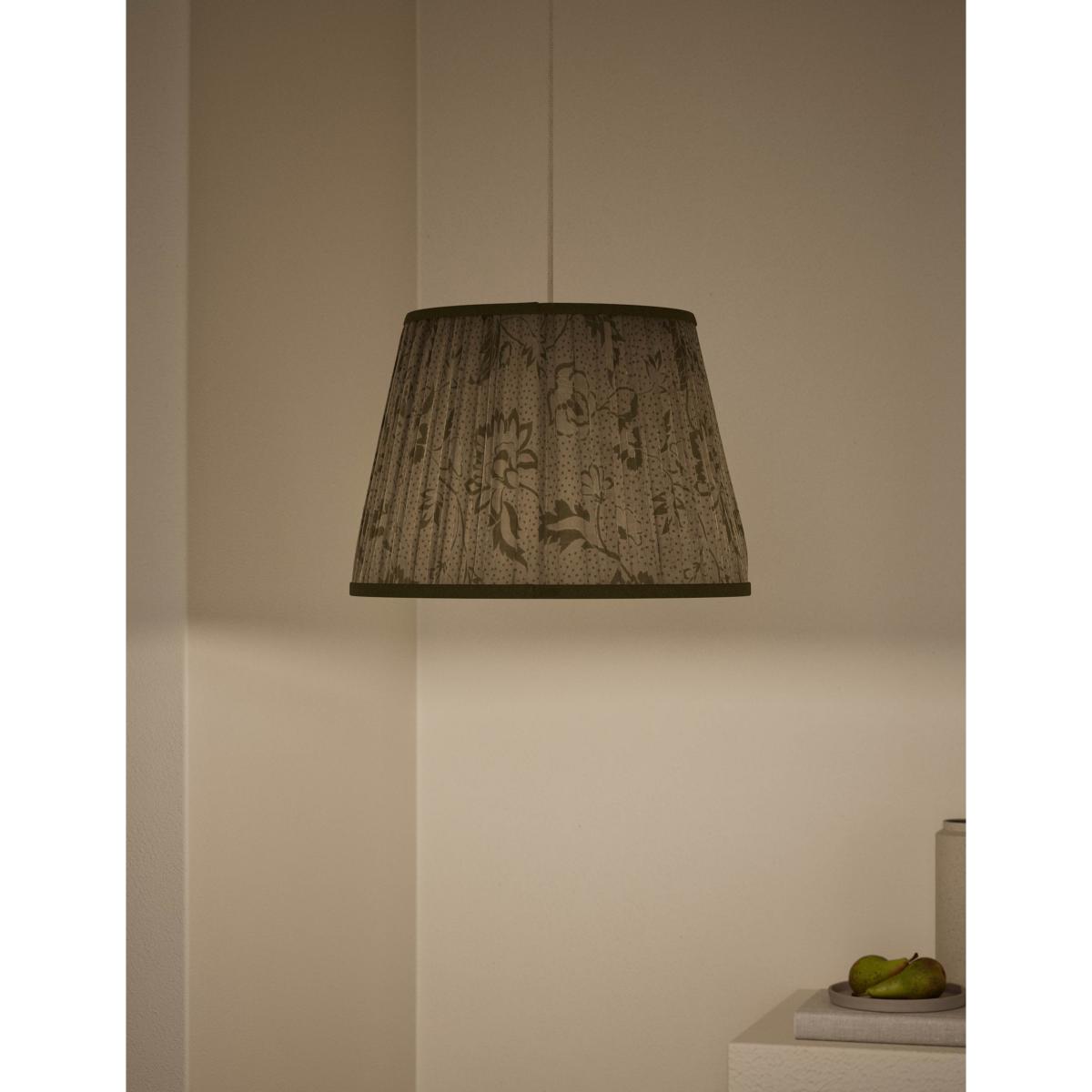 I really like this fabric floral pleated shade because of its subtle, natural tone and delicate texture, making it a versatile choice across a variety of interiors. It works particularly well in cosy living rooms or bedrooms with neutral or light colour schemes, enhancing a calm, inviting atmosphere. To style it effectively, consider pairing with classic or vintage-inspired lamp bases, and keep other textiles in the space simple to let the shade’s soft pattern be a focal point. Practical tips include hanging it at a height that optimises both ambient and task lighting, and mixing it with other natural or textured materials for a layered, cohesive look.
