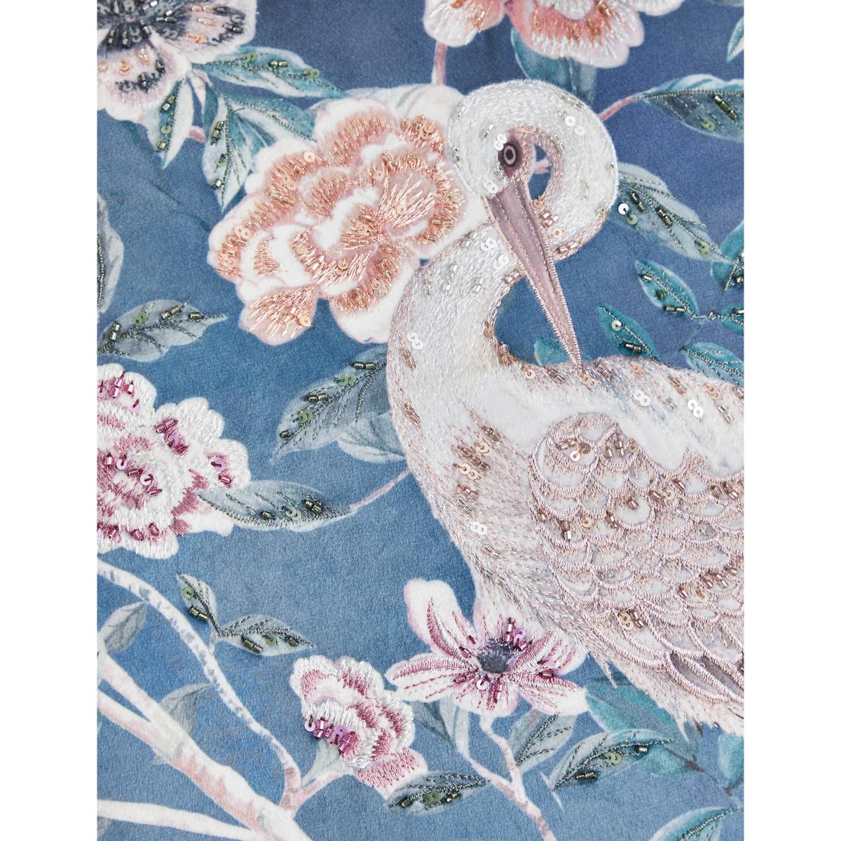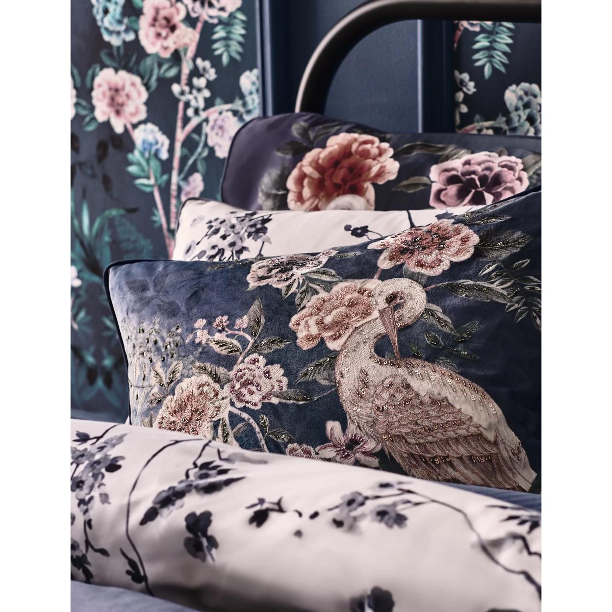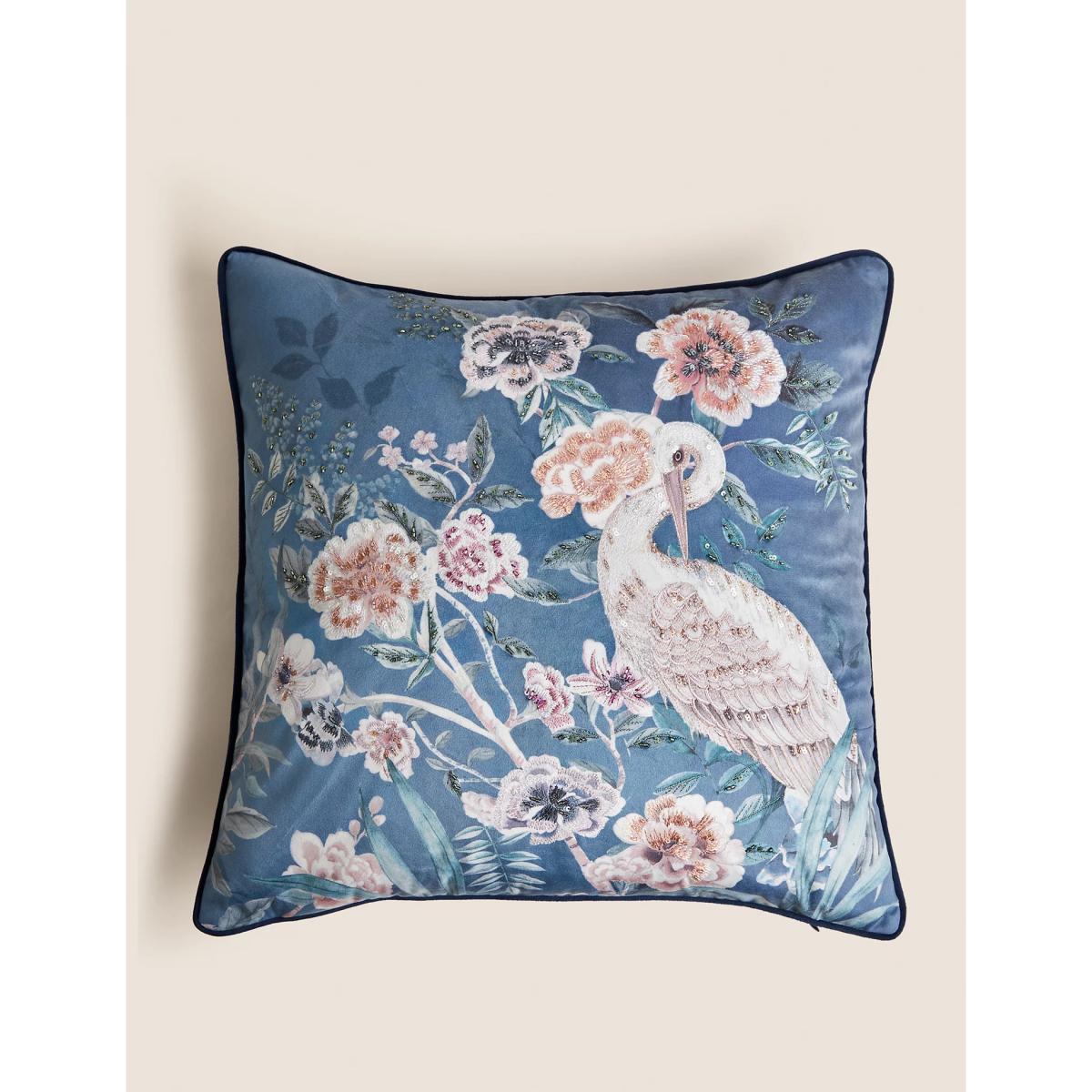 Complete your interior in eye-catching style with this statement square cushion. The hand-drawn design is a reimagining of one from the M&S archives, depicting an elegant crane among blossoming florals. Embroidery and embellishments add pretty detail, while piped edging offers a premium finish. This medium-sized cushion has a feather filling for a luxuriously comfortable feel.