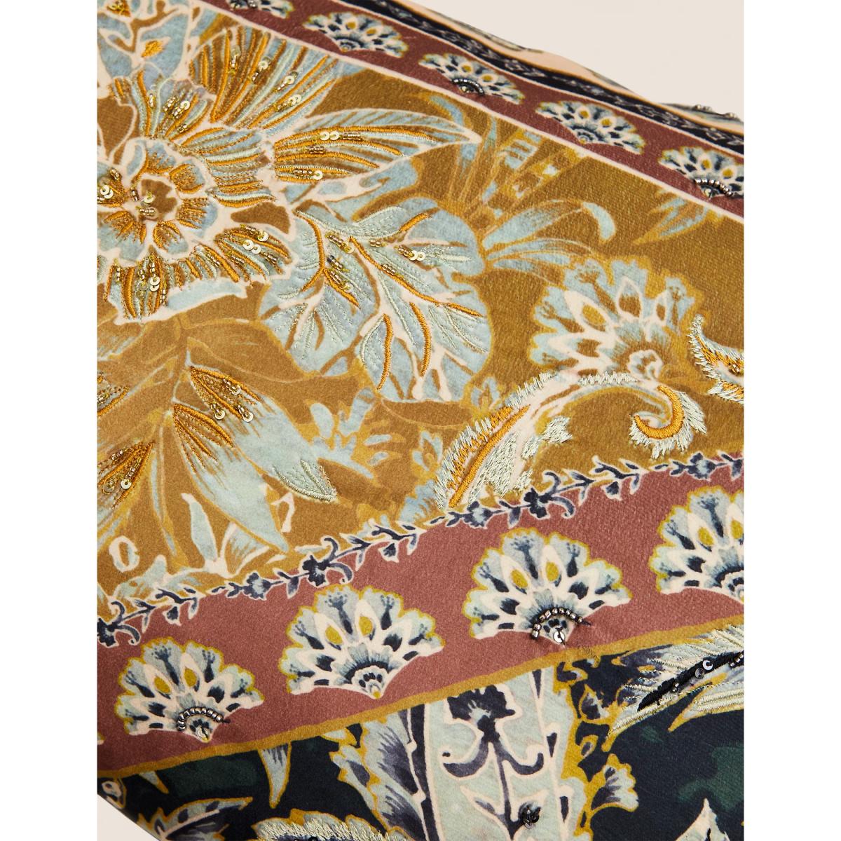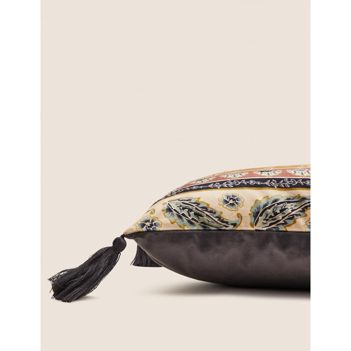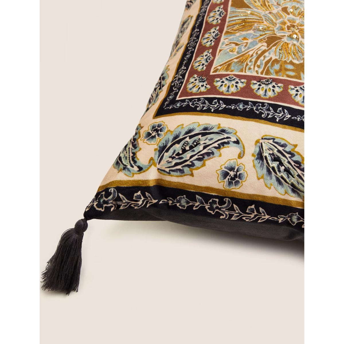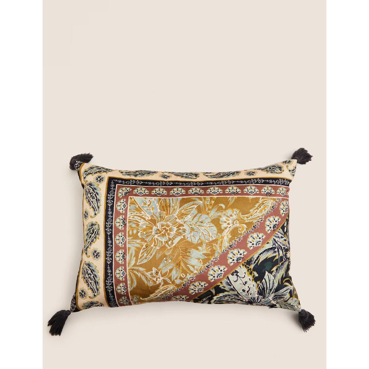 Bring extra opulence to your interior with this luxurious feather-filled bolster cushion. Its patchwork design is embellished with sequinned embroidery and silky tassels at the corners.