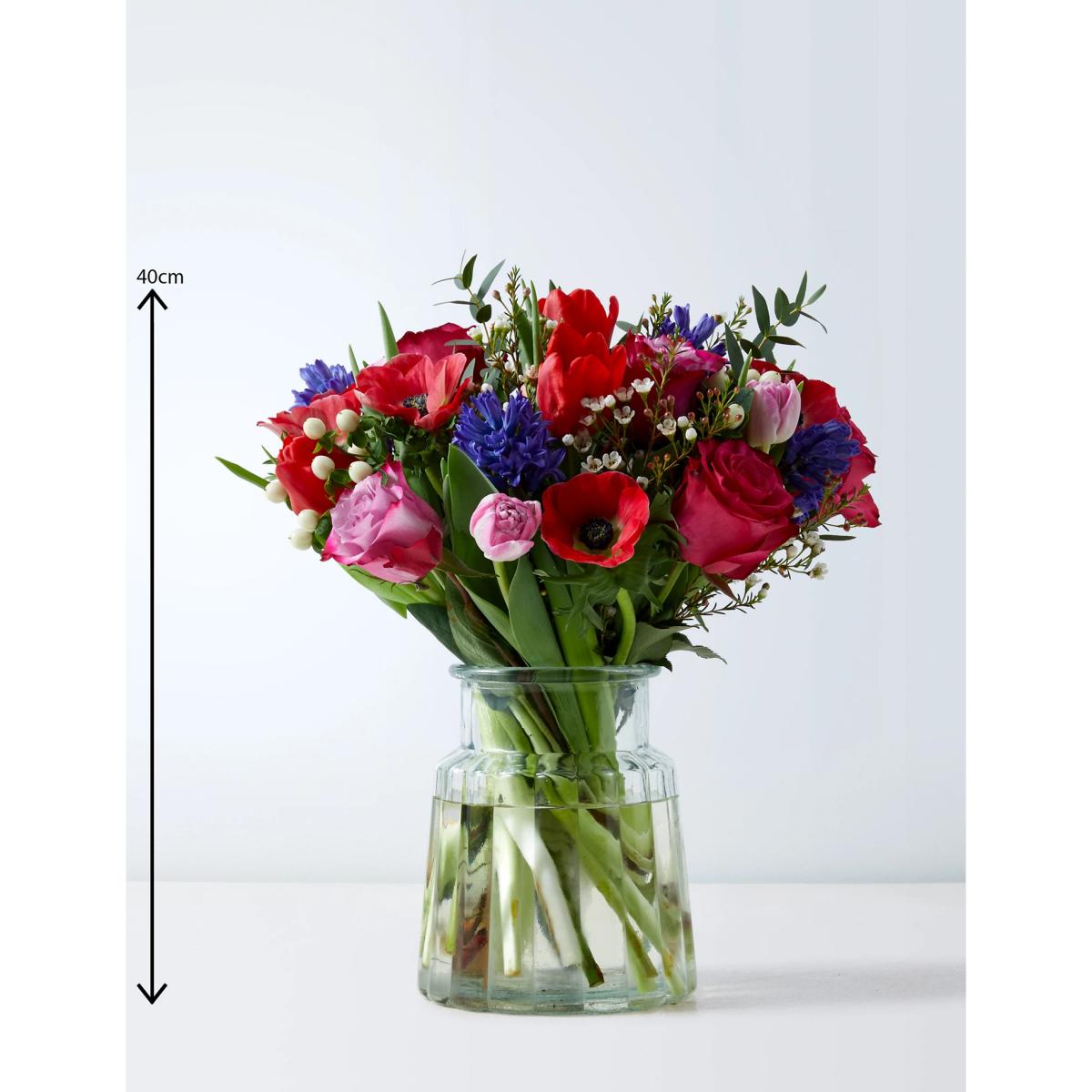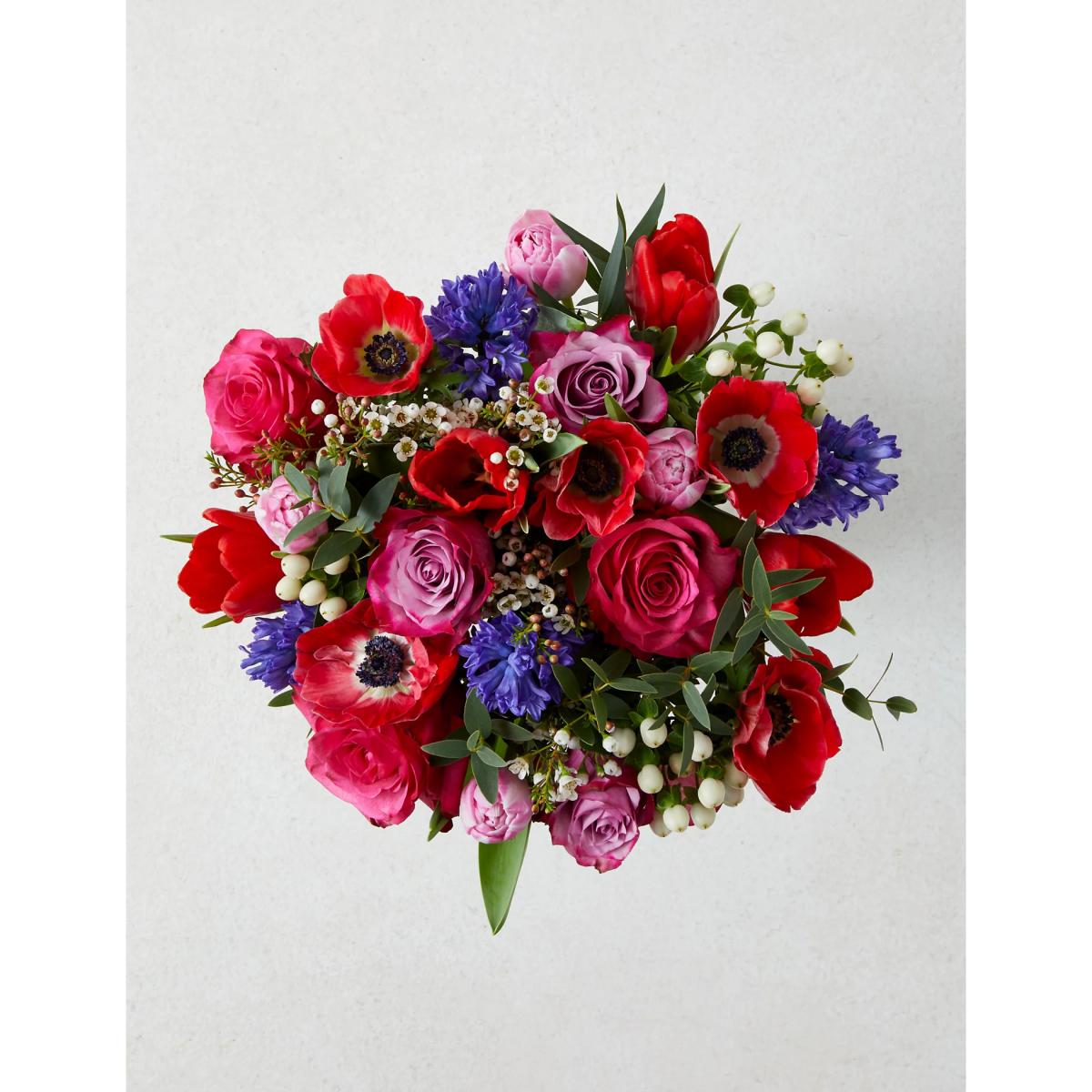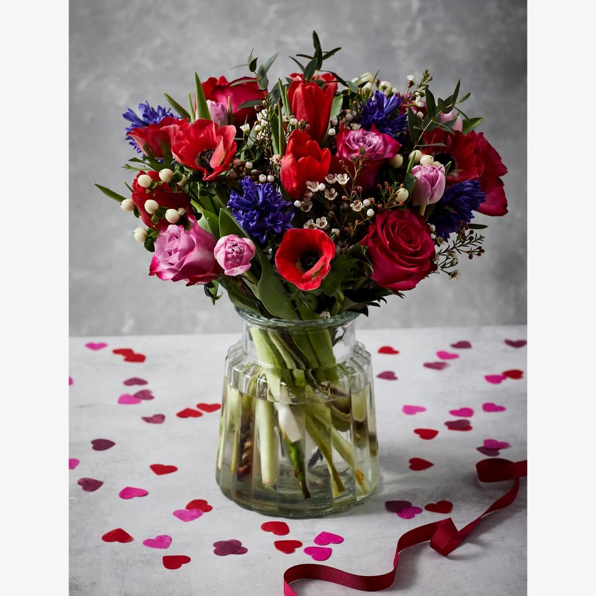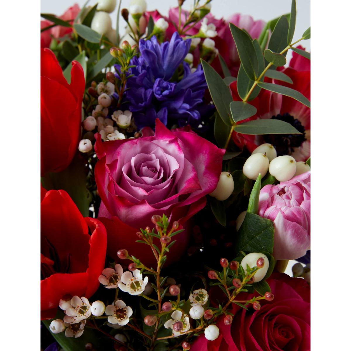 Declare your love this Valentine's Day with this stunning vase bundle. This generous 31-stem bouquet includes burgundy and pink tulips, lilac and cerise roses and blue hyacinth, all complemented with eucalyptus, white waxflower and white hypericum. Send it straight to your loved one's door and add a personalised note. Colours may vary slightly throughout the season.