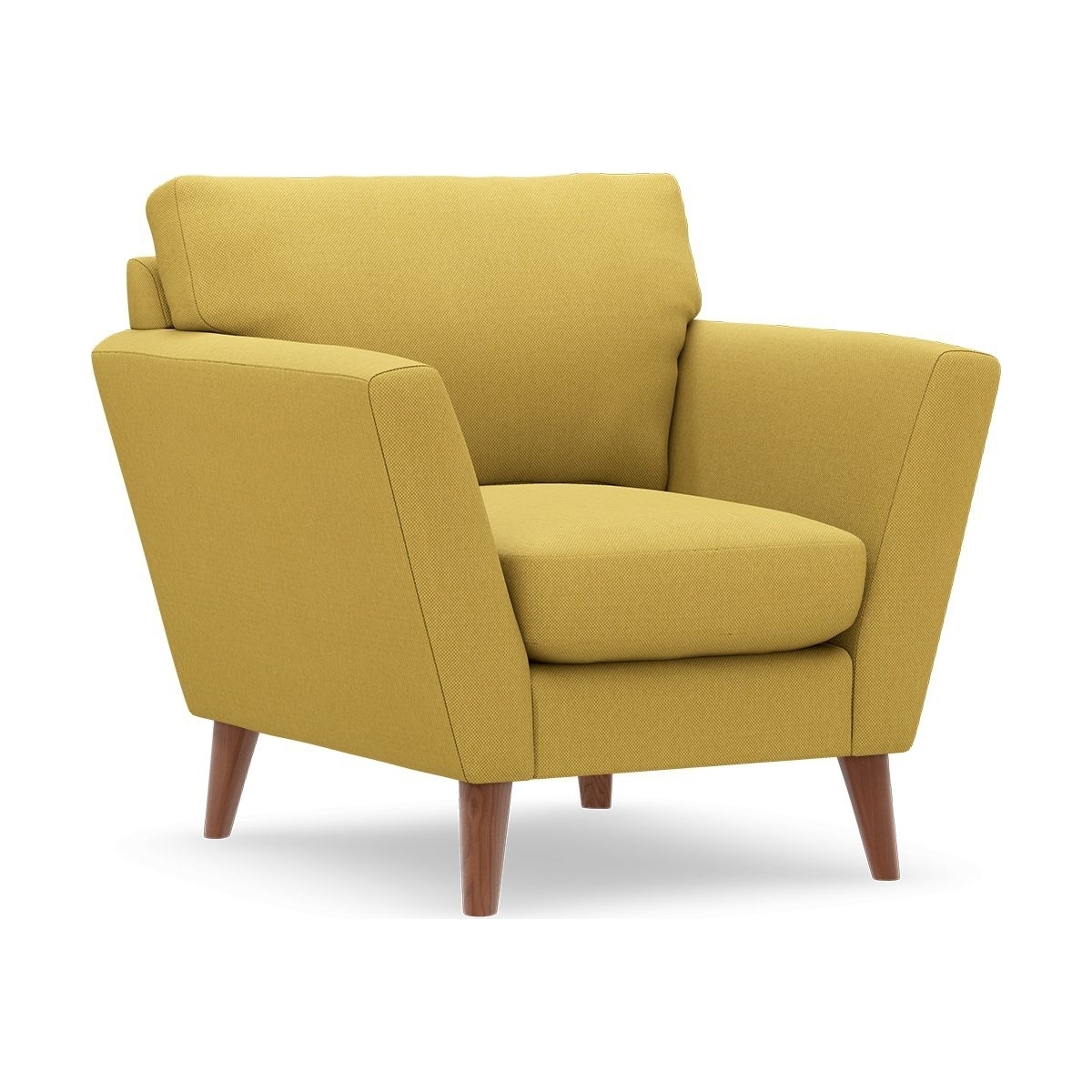 The Foxbury armchair is a great choice for adding a pop of colour to a neutral or minimalist interior, thanks to its cheerful yellow fabric. I love its retro-inspired shape combined with modern lines, making it versatile for both contemporary and classic schemes. It works well as a statement piece in a living room or cosy corner, especially when paired with textured cushions or throws for added comfort. To style it effectively, consider positioning it near a statement side table or mixing it with other wooden accents to highlight its mid-century vibe. Its manageable size makes it suitable for smaller spaces or as an accent chair in a larger room, offering both visual interest and functional seating.
