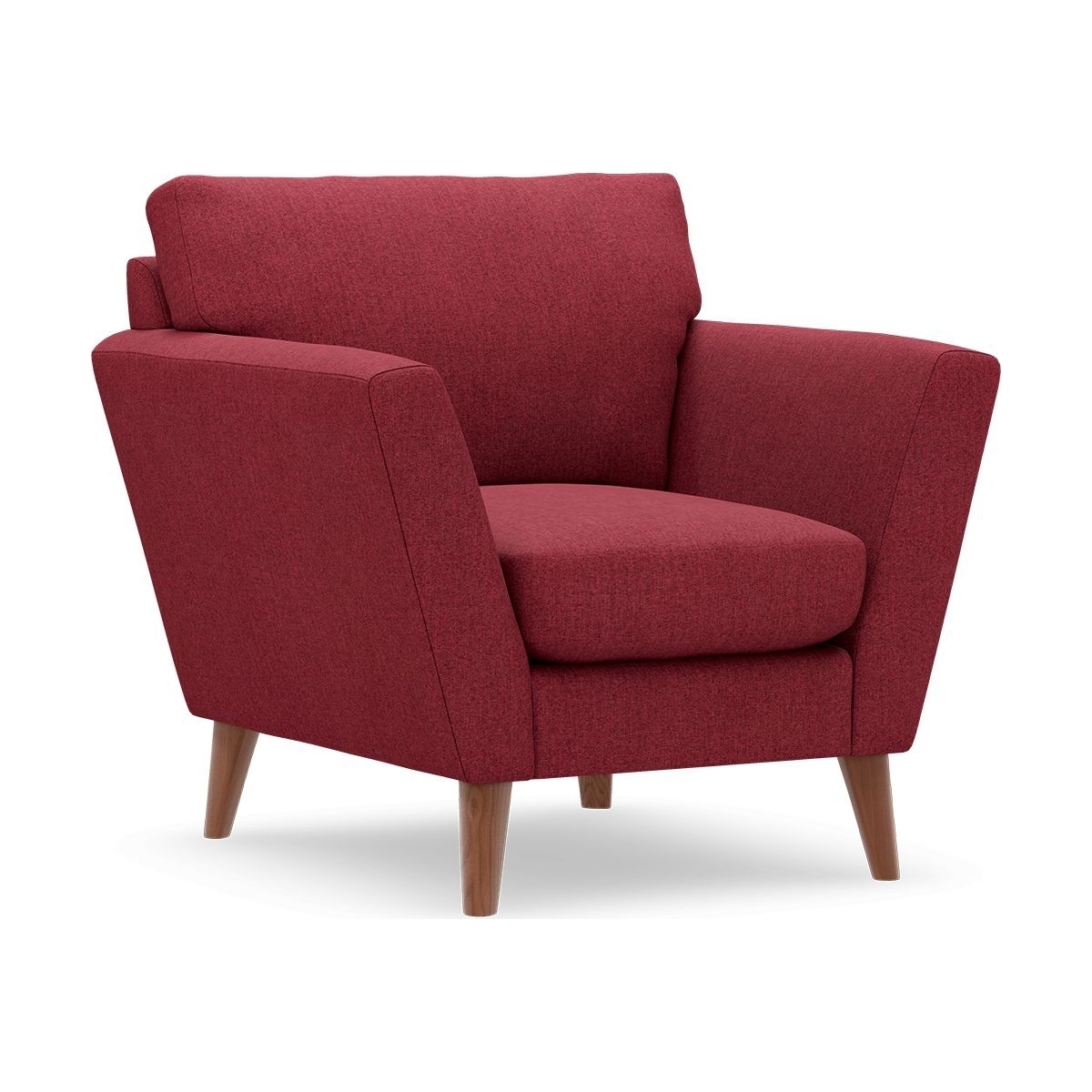 I love the Foxbury armchair for its clean lines and versatile silhouette, making it a great addition to both contemporary and retro-inspired interiors. Its rich, deep colour can add warmth and character to a neutral scheme, or work as a statement piece in more colourful settings. Practical styling tips include pairing it with textured cushions or throws for added comfort, and placing it in a cosy corner with a small side table and good lighting for an inviting reading nook. It works well in living rooms, bedrooms, or even in stylish home offices, especially where you want a comfortable yet sophisticated seating option. The wooden legs also help to ground the piece and add a touch of natural warmth.