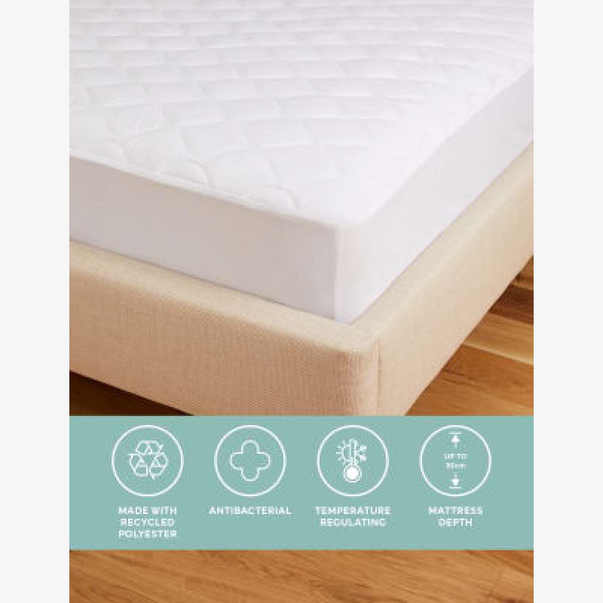 Keep your bed looking newer and fresher for longer with this mattress protector. Crafted with our specially designed Hydrocool® technology which wicks moisture away from your body, helping to regulate your body temperature and keep you at a comfortable temperature all night. The protector filling has been treated to help prevent the growth of dust mites and bacteria which are known to trigger allergies. It also reduces odours, helping you to sleep soundly. It's designed to fit effortlessly over mattresses up to 30cm deep, while the quilted finish offers a soft and comfortable feel. Made with 100% recycled polyester.