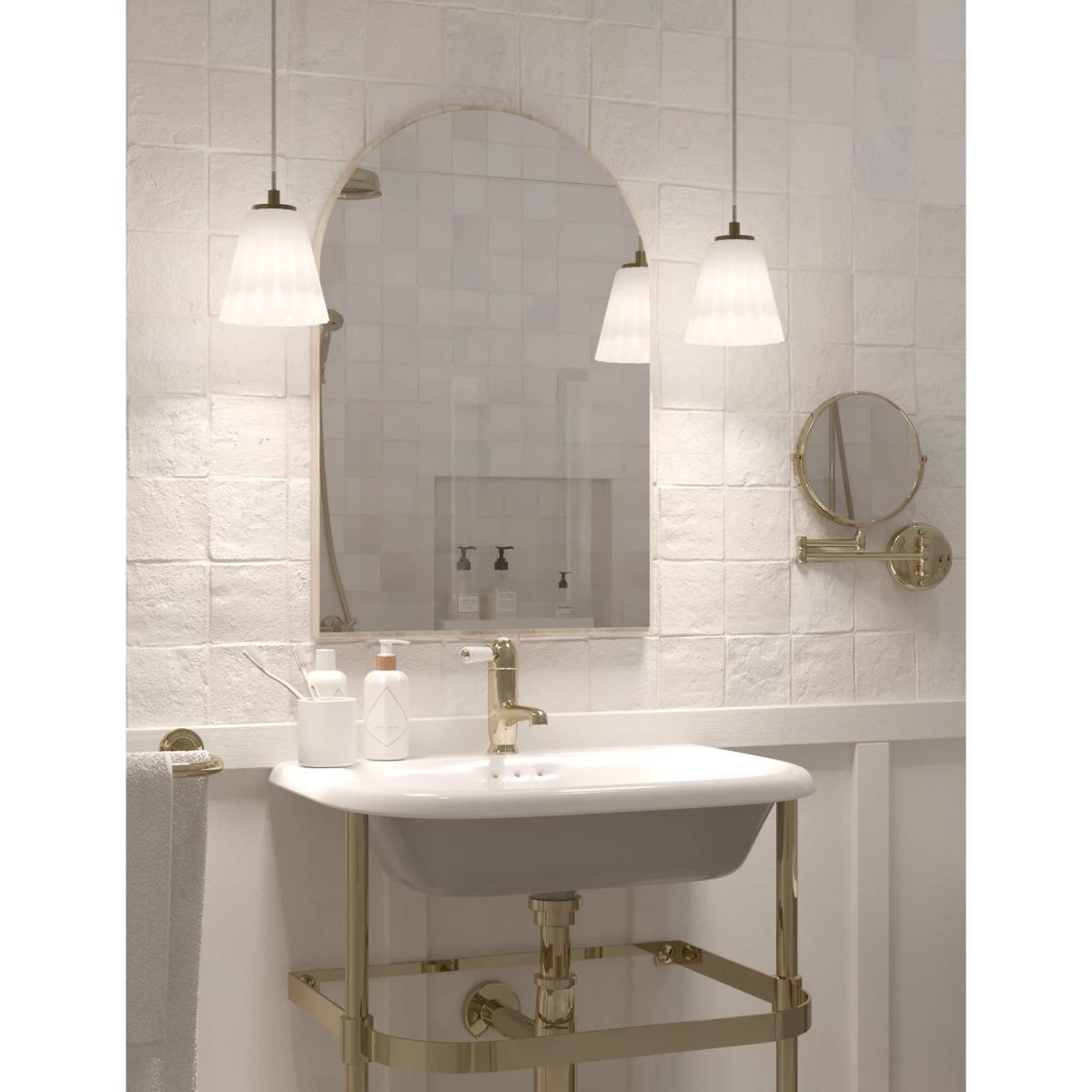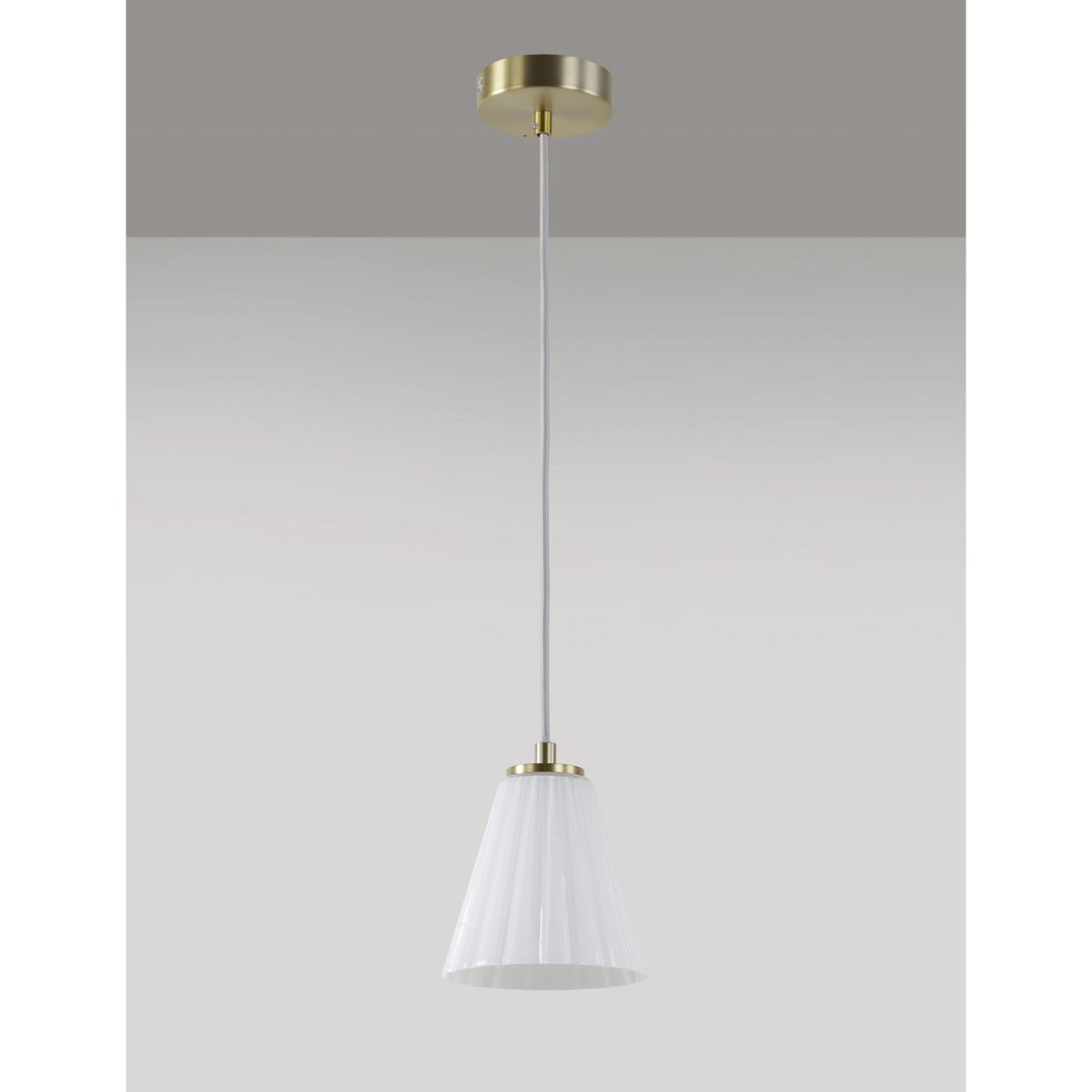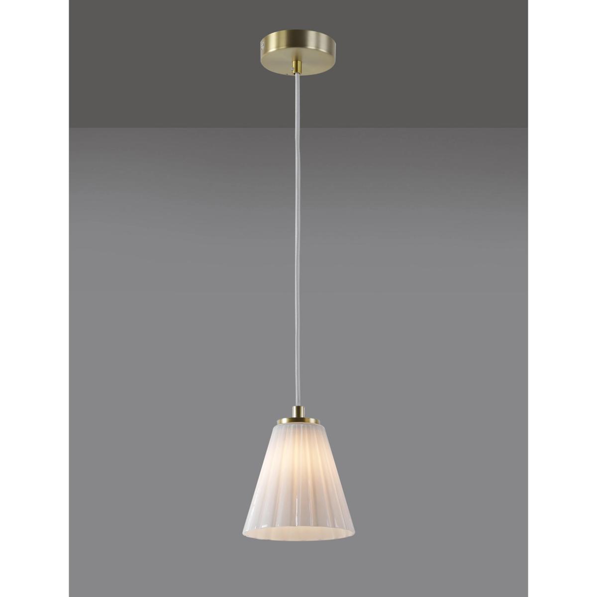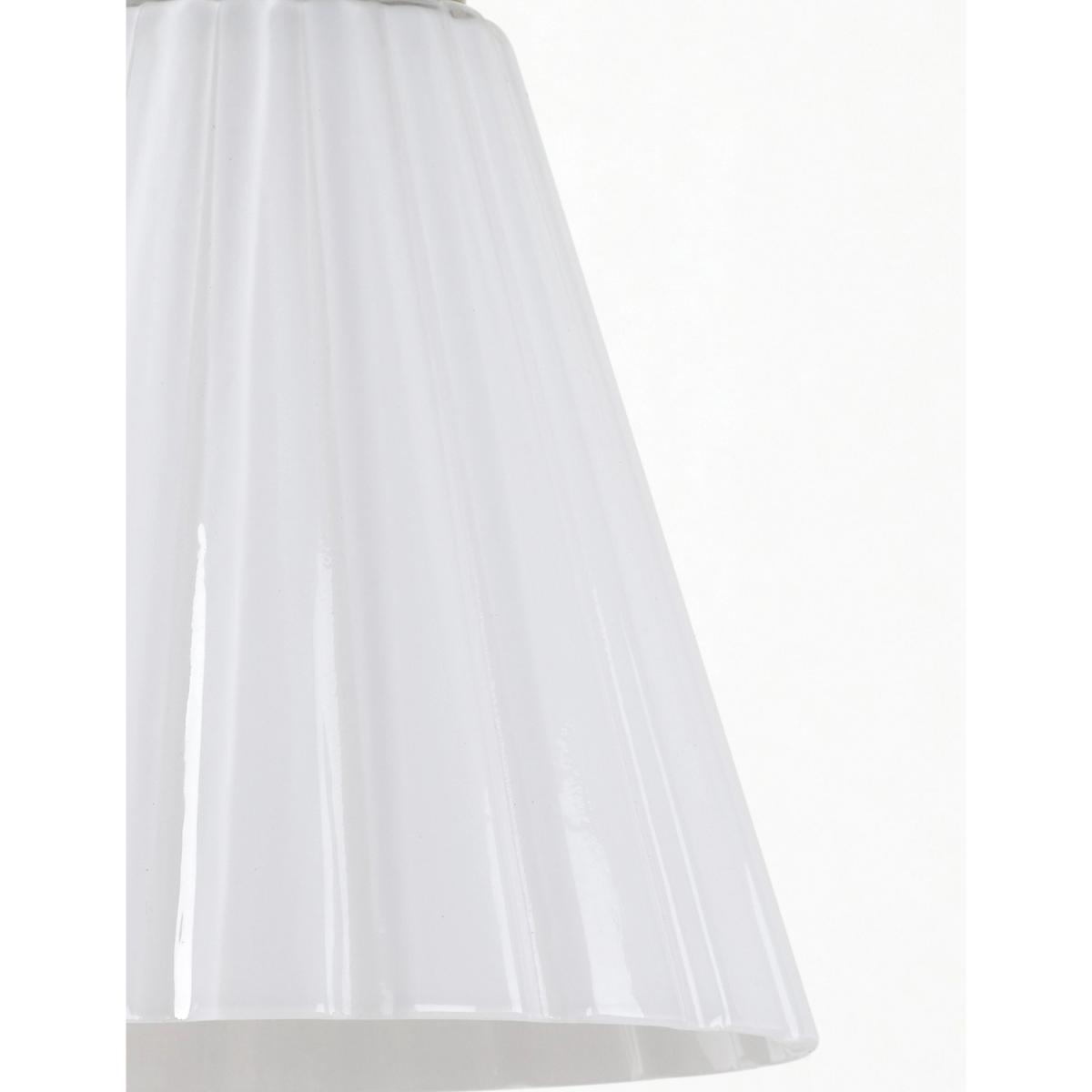 The smart Georgia pendant light features an opaque glass shade in a classical conical shape. It's fitted to the ceiling with a round metallic plate that complements the polished metal trim on the lampshade.