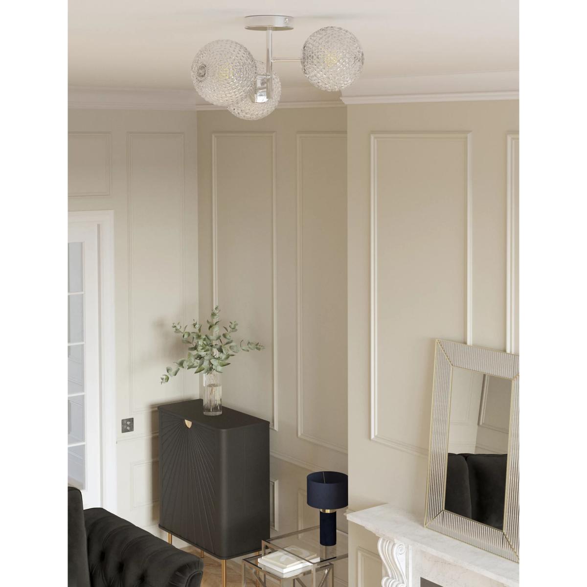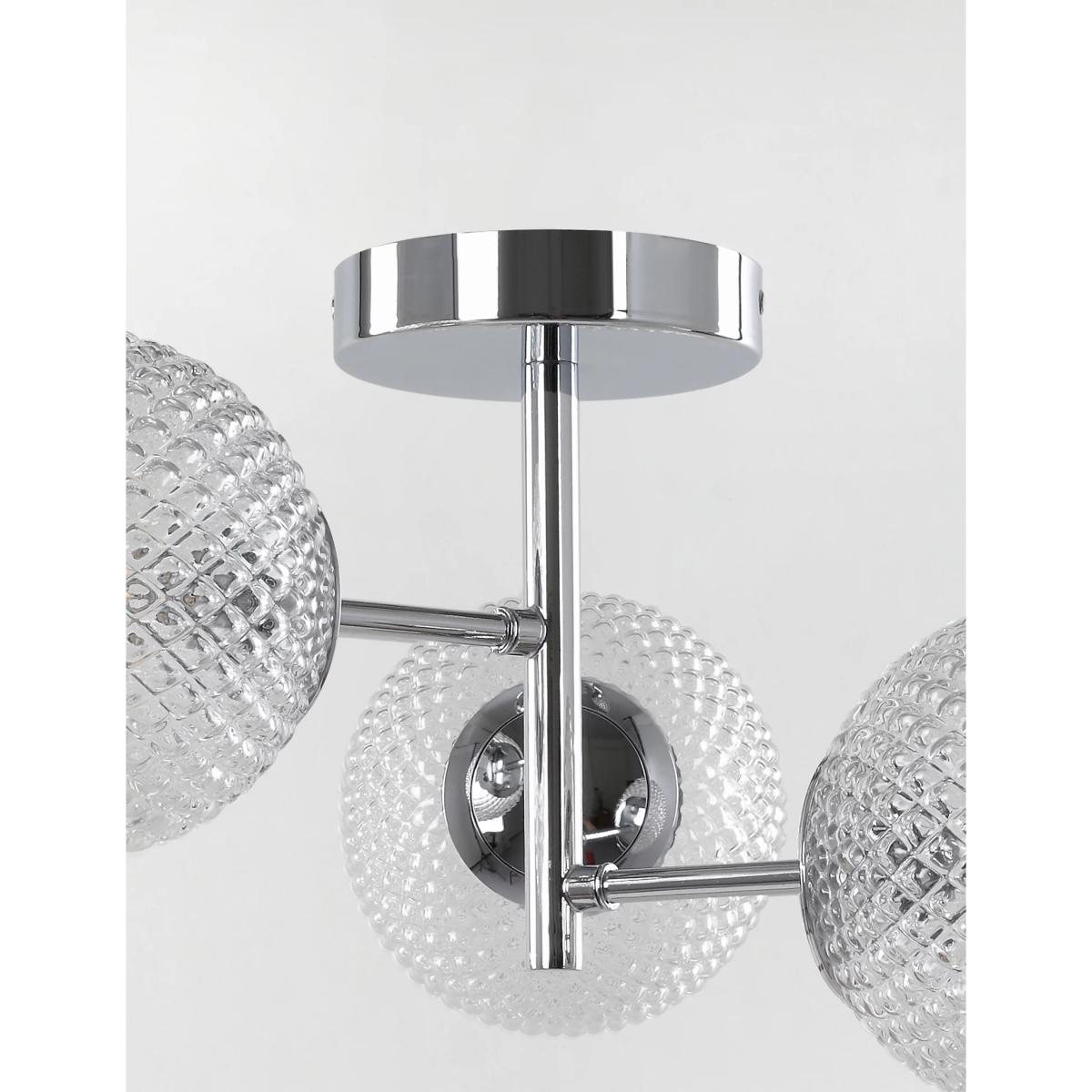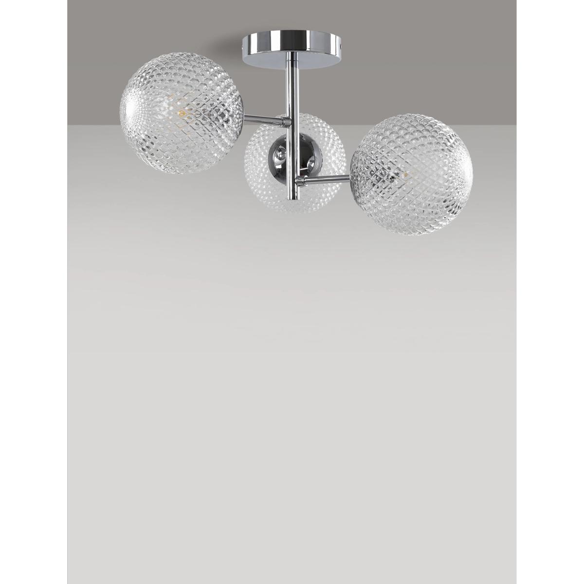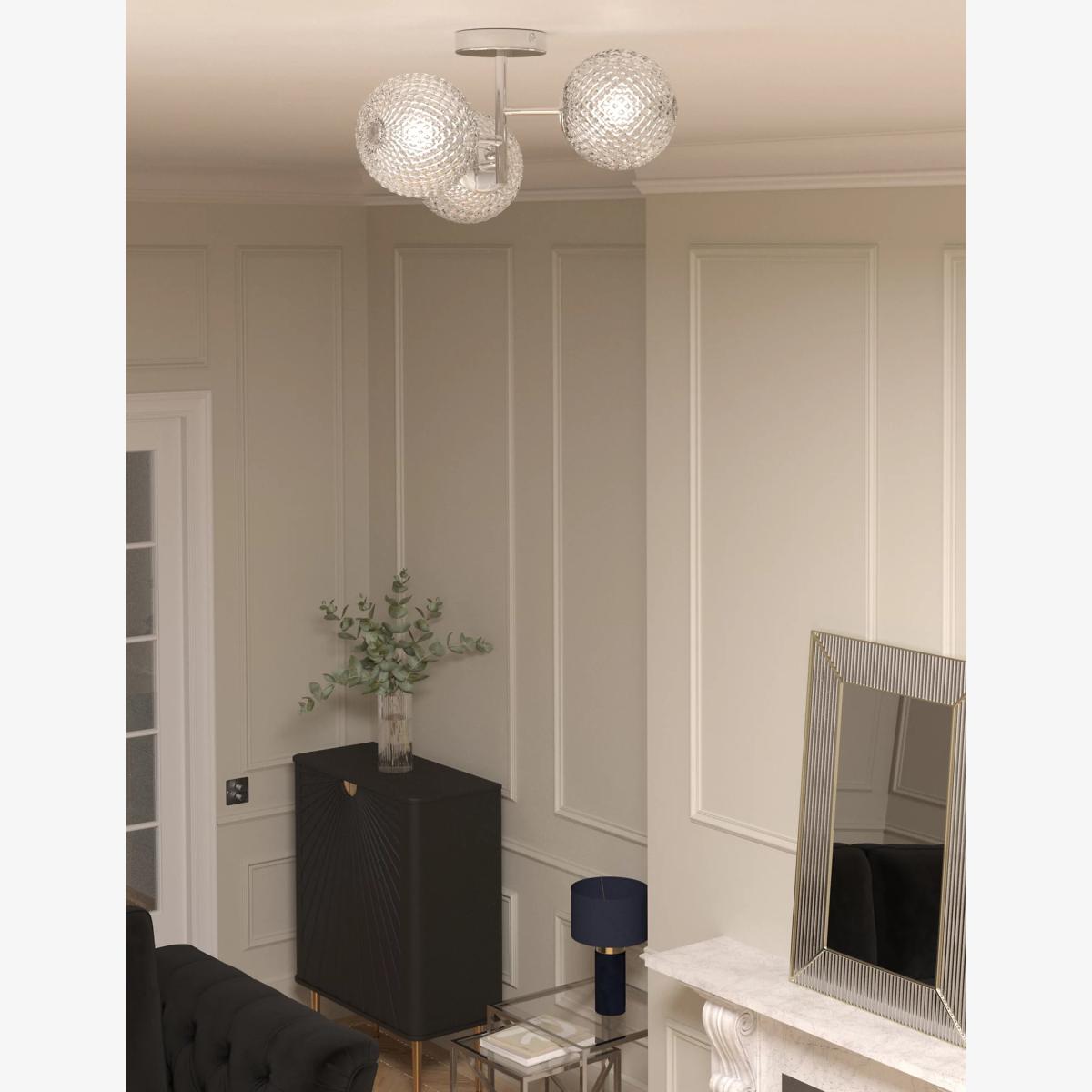 I love this ceiling light for its sleek, modern look with a touch of elegance, thanks to the chrome finish and textured glass shades. It's versatile enough to suit contemporary and minimalist interiors, working particularly well in living rooms, dining areas, or even hallways where a touch of subtle sophistication is desired. For styling tips, consider pairing it with other chrome or mirrored accents to enhance its reflective qualities or keeping surrounding decor simple to let the fixture be a statement piece. Its flush-fitting design also makes it ideal for rooms with lower ceilings, providing ample light without overwhelming the space.
