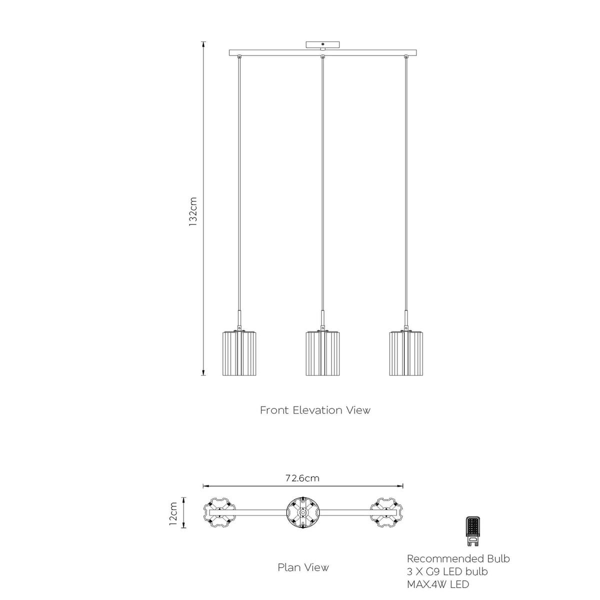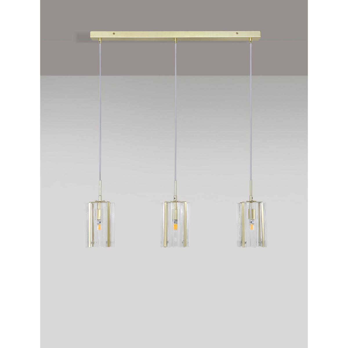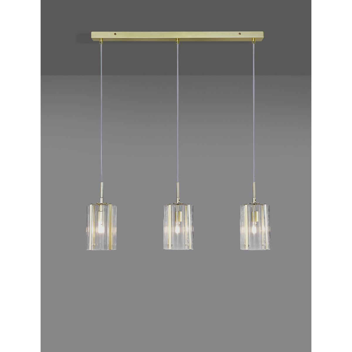 This ceiling light will add a touch of modern sophistication to your space. It features three hanging pendant lamps, each with a ridged glass shade for diffused illumination.