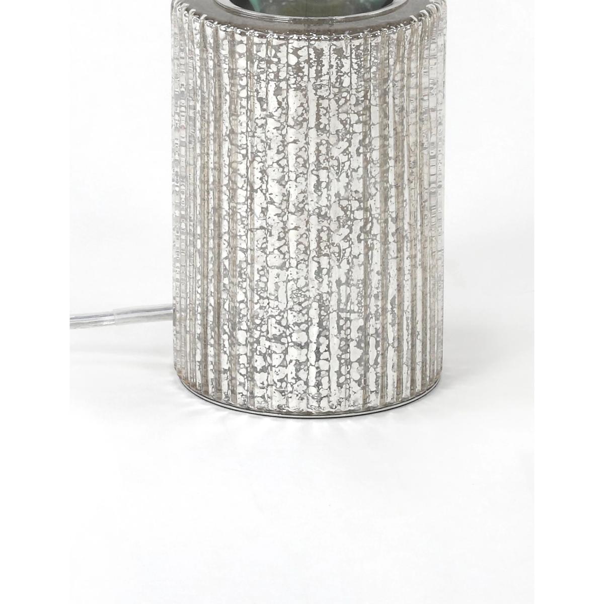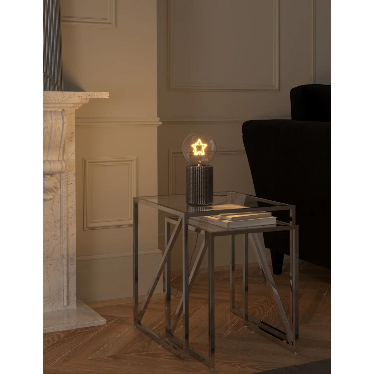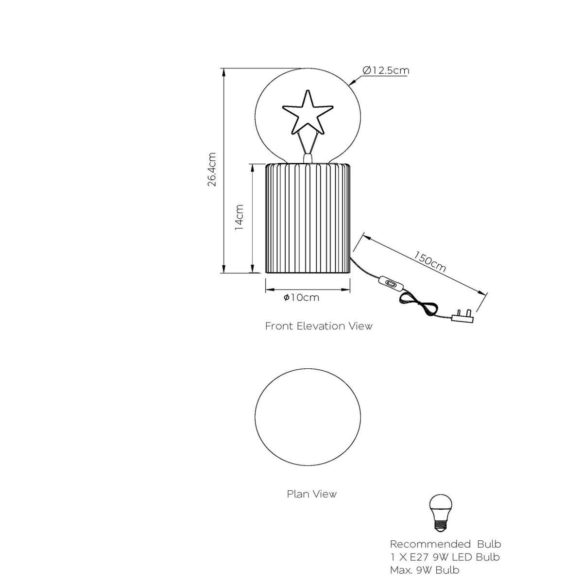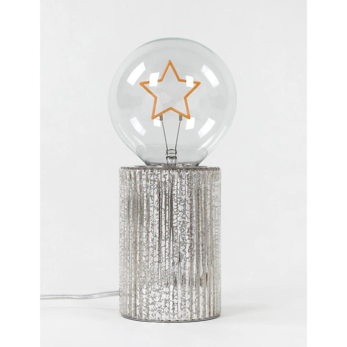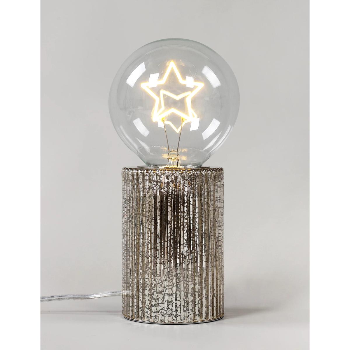 This glass table lamp is a stylish way to bring a festive touch to your space. The large, battery-operated bulb has an eye-catching star-shaped filament inside, which lights up with a warm glow. It's set on a ridged cylindrical base for a modern finish.