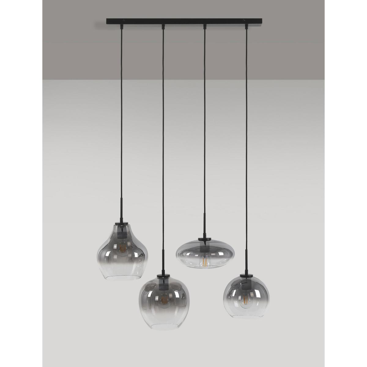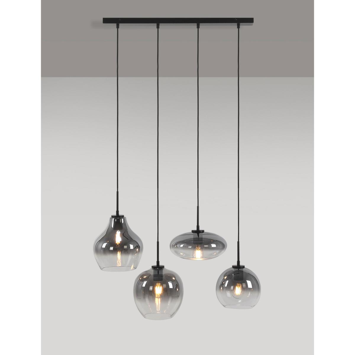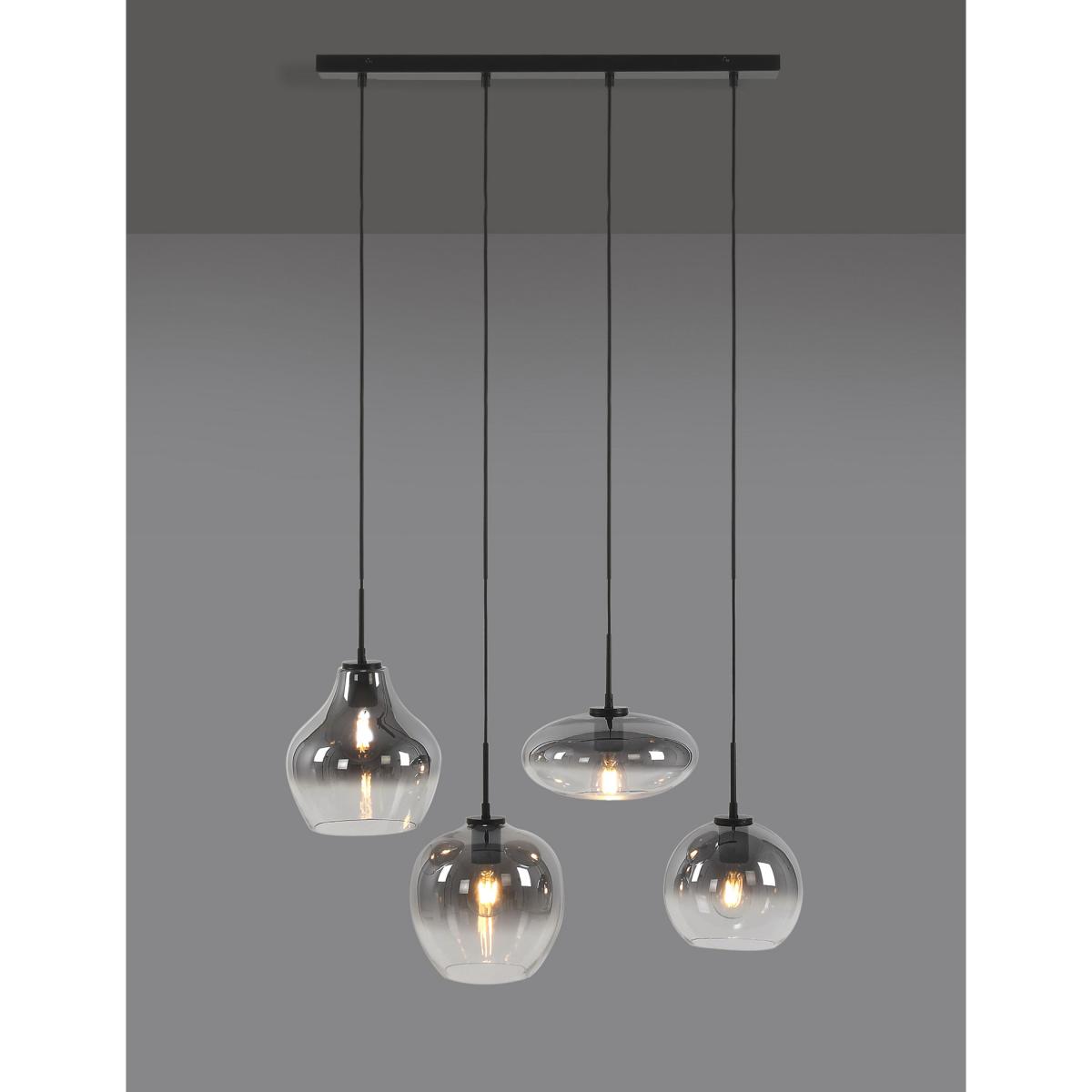 Beautifully crafted with four ombré smoked glass pendants in varying shapes, this cluster ceiling light creates a timeless and contemporary setting. Each pendant hangs from a modern ceiling bar to elevate your space.