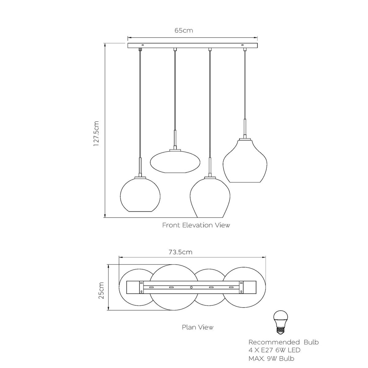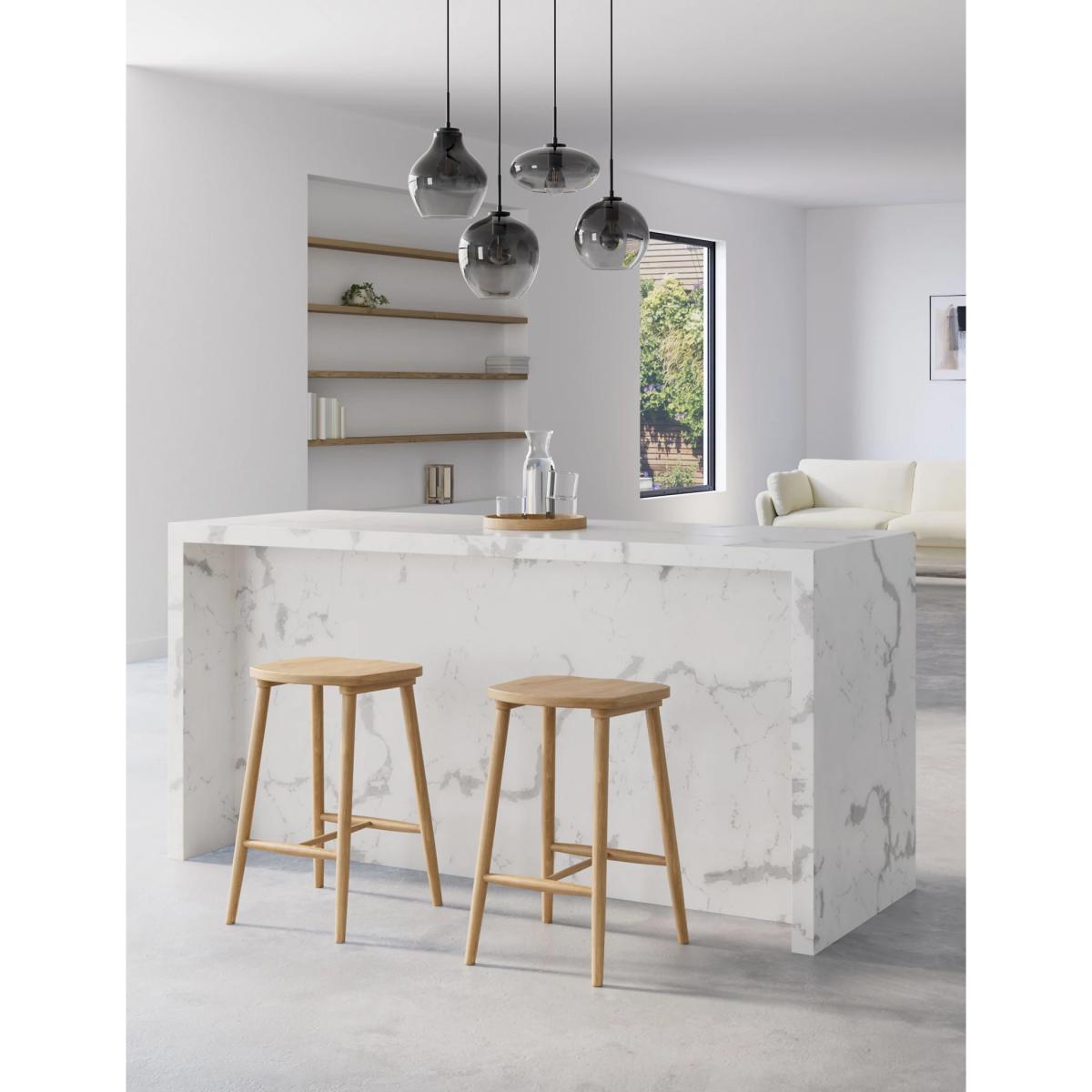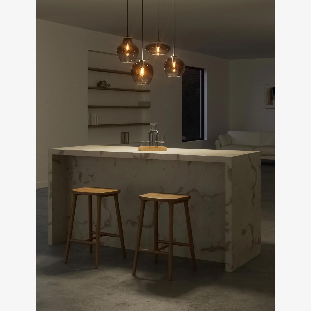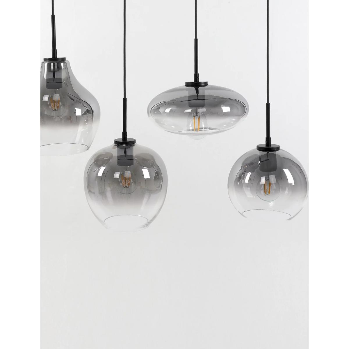 Beautifully crafted with four ombré smoked glass pendants in varying shapes, this cluster ceiling light creates a timeless and contemporary setting. Each pendant hangs from a modern ceiling bar to elevate your space.