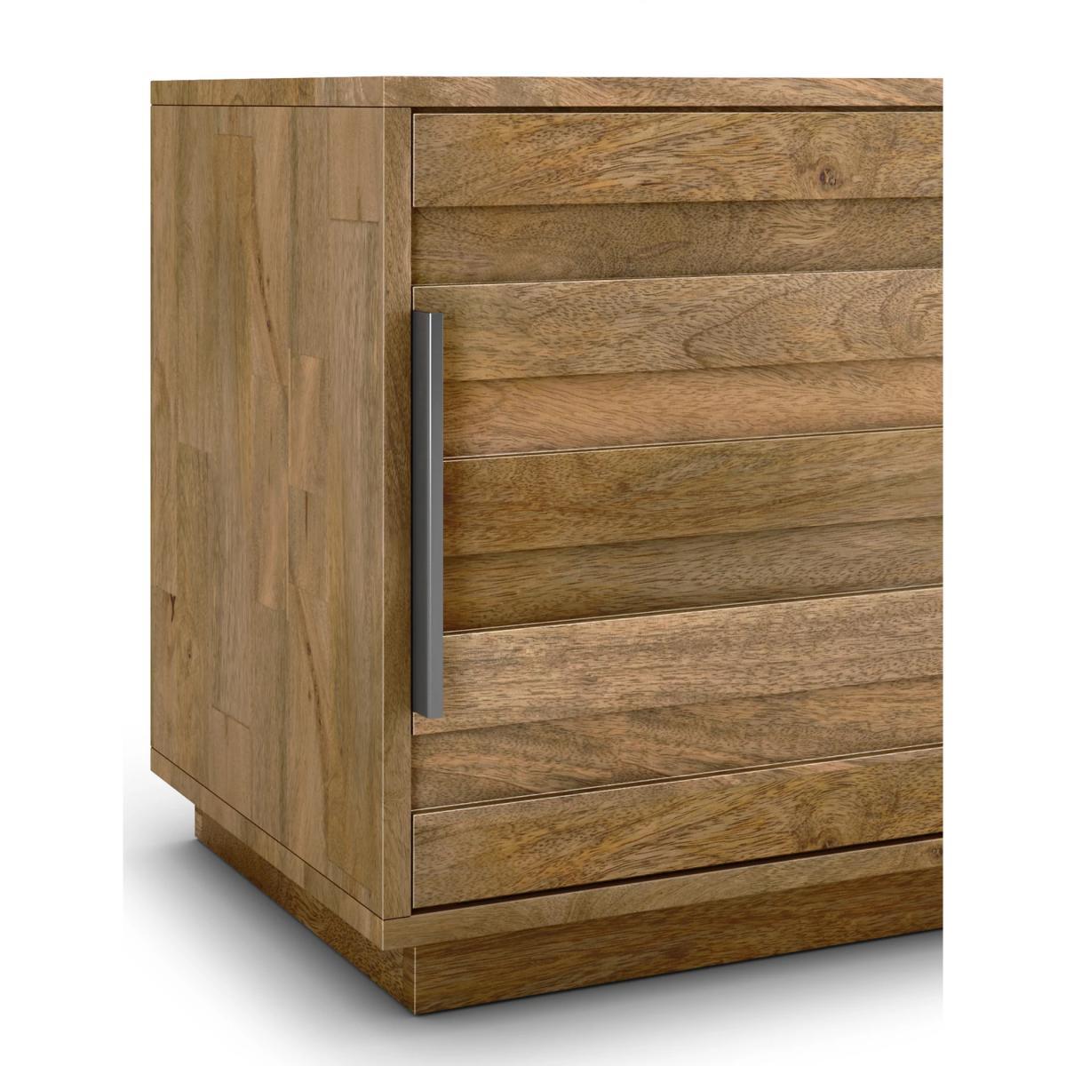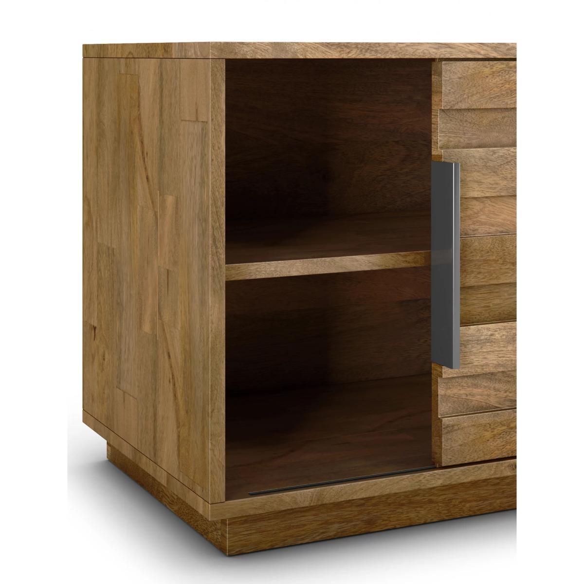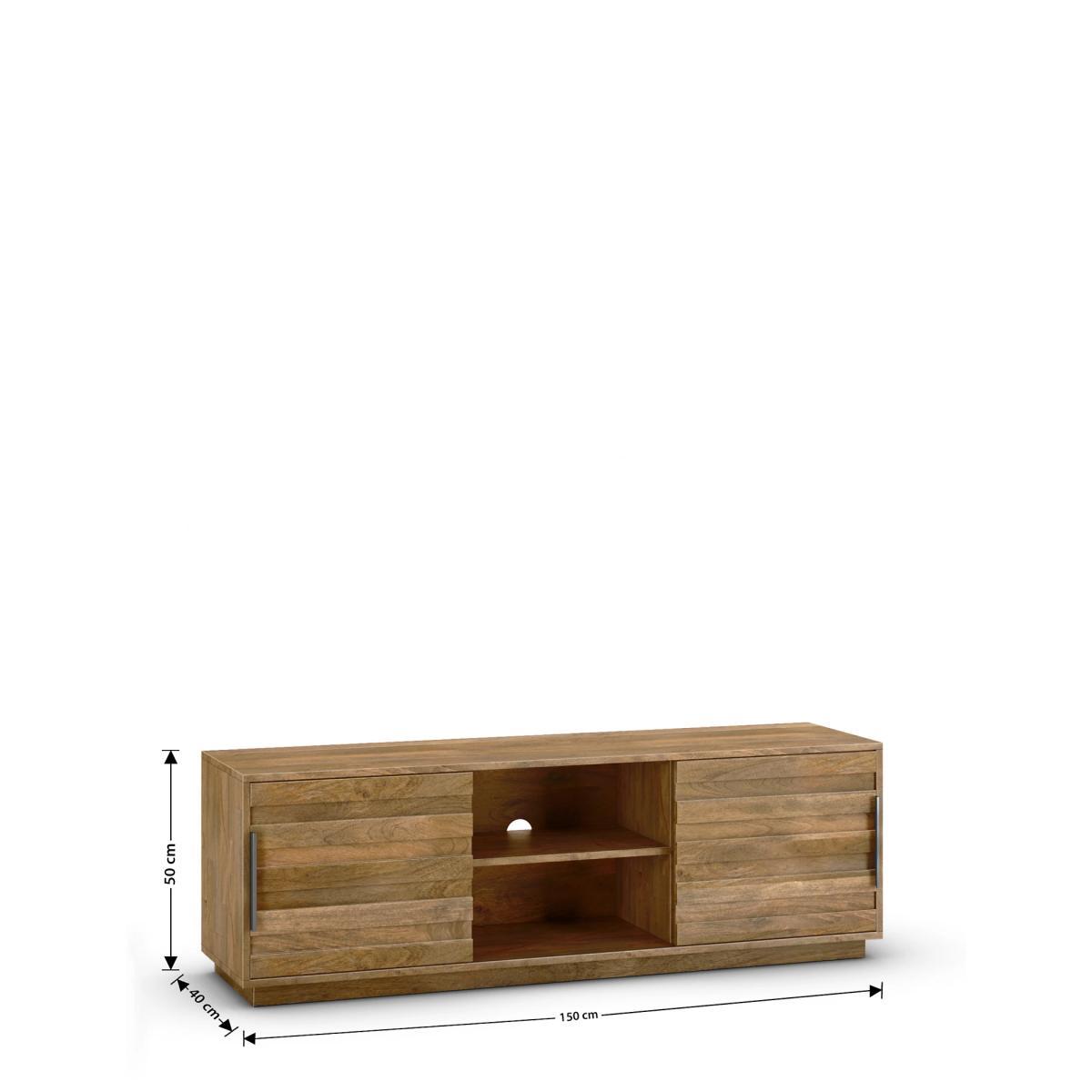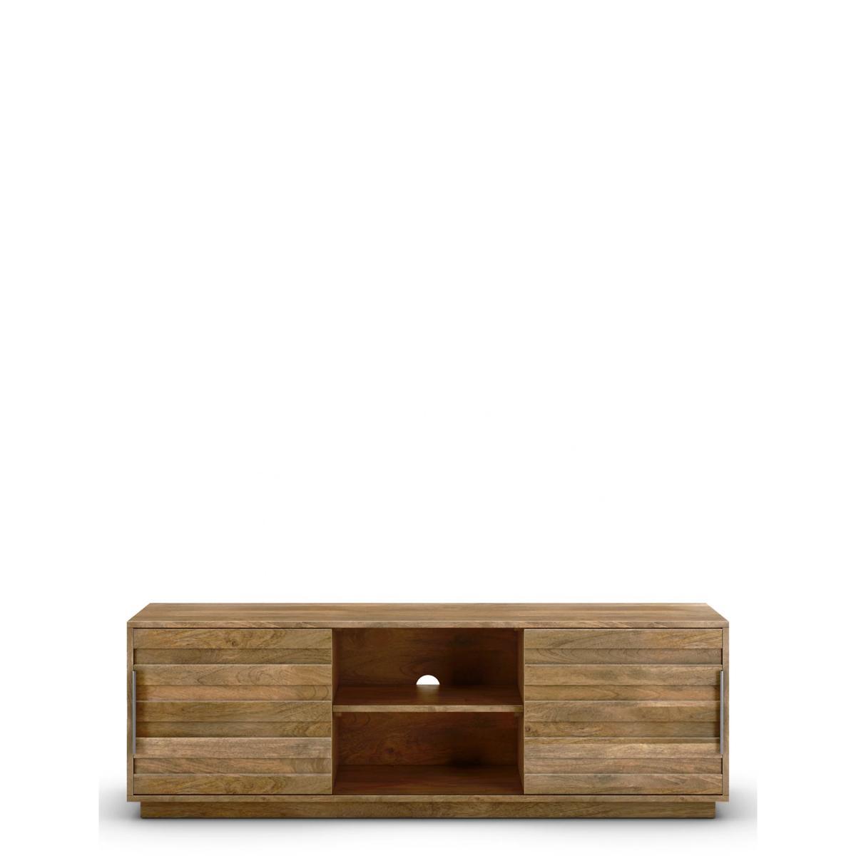 Made from solid Mango wood, this versatile Groove TV unit features two space-saving sliding doors, a central internal shelf for storage and sturdy plinth base to support a TV up to 65 inches. Designed with clean cut lines for a contemporary feel, it will provide an instant update to your living space but timeless quality and style.