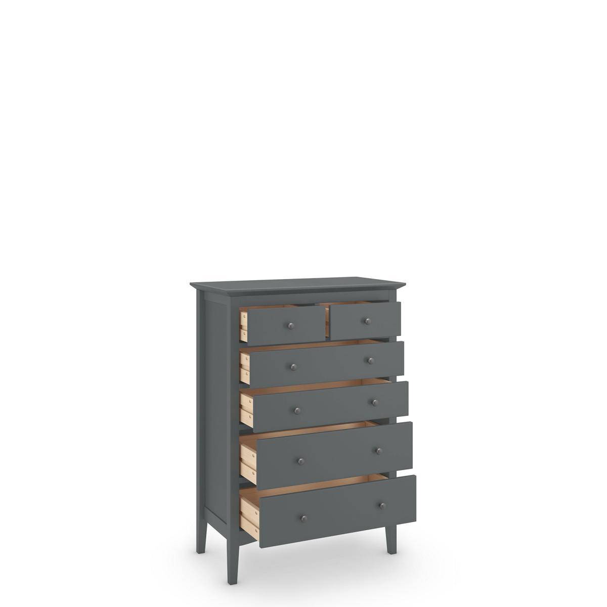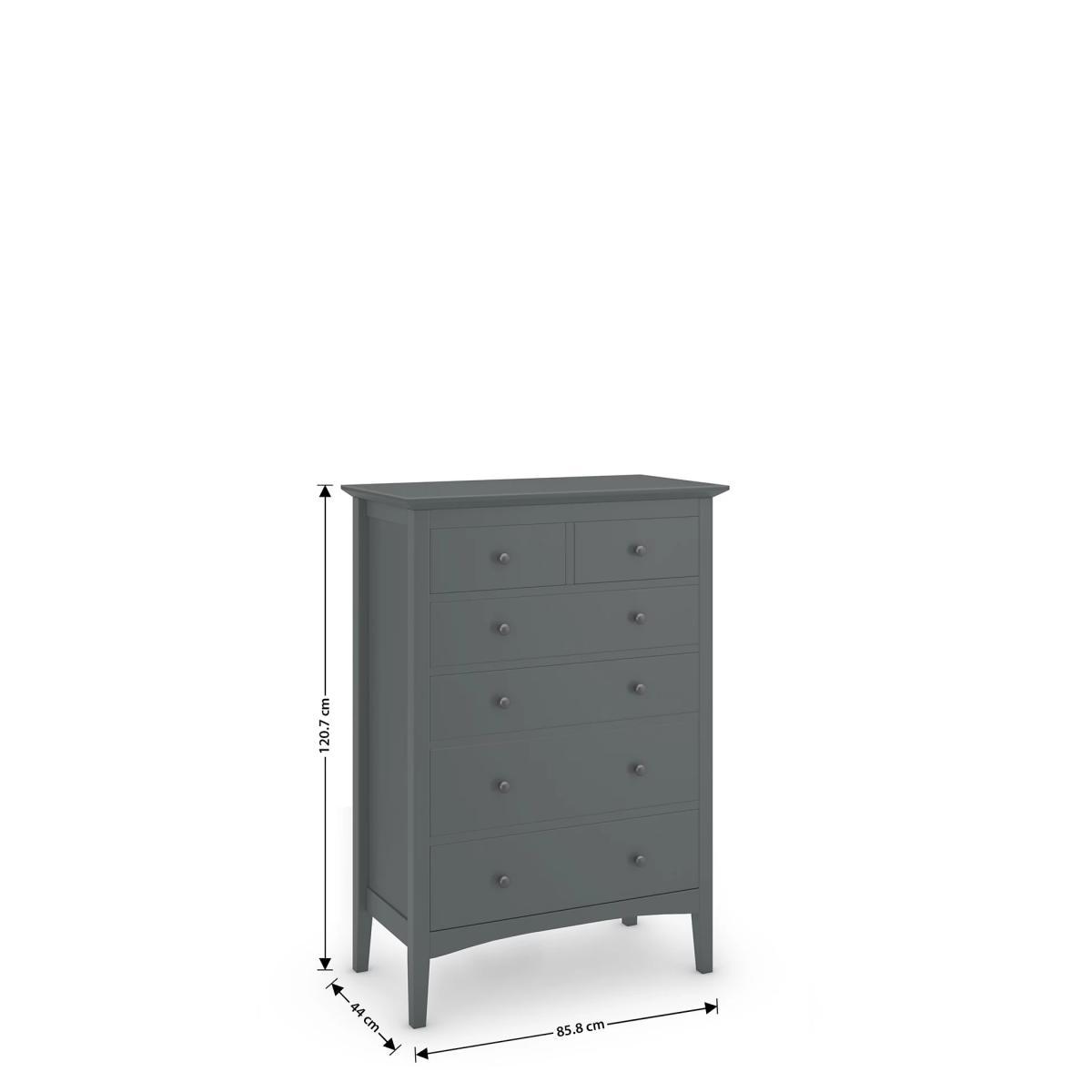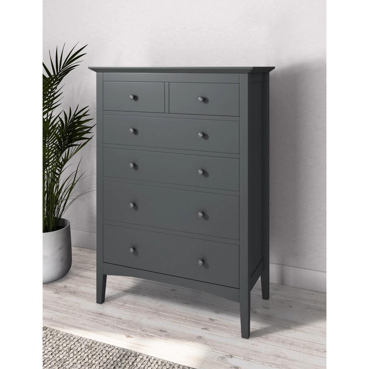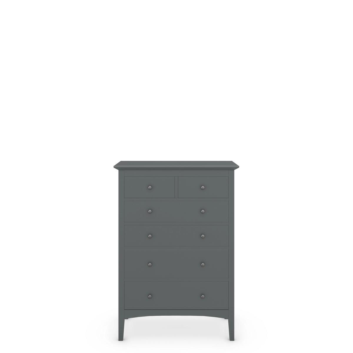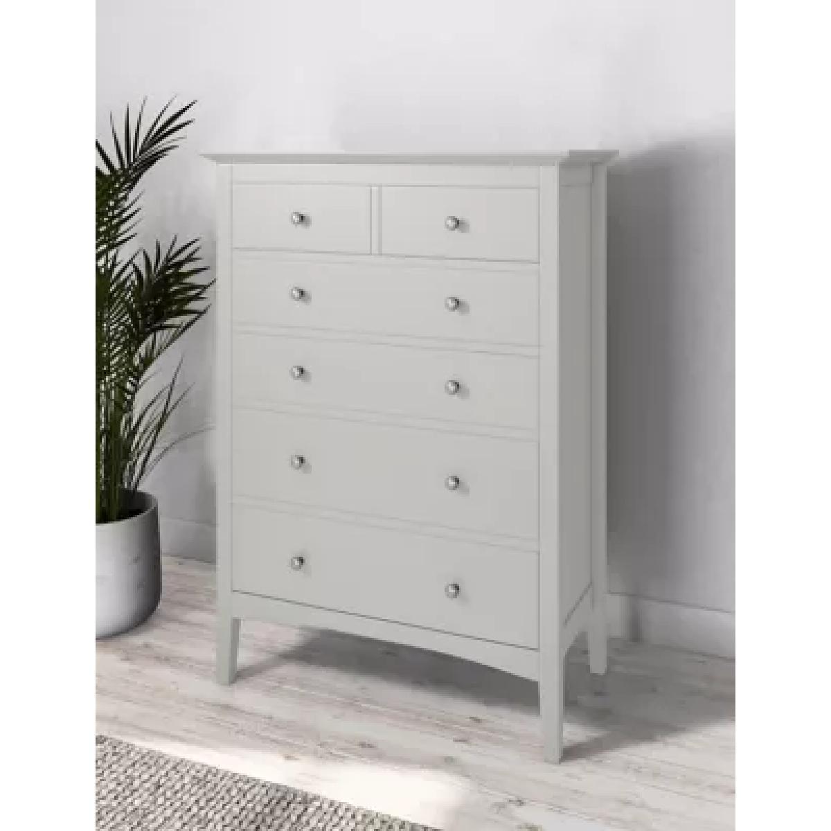 From the Hastings Collection, this timeless chest of drawers will add style to any room while decluttering your space. Featuring four large drawers and two smaller half drawers for stowing smaller items, this six-drawer chest is designed to fit into smaller spaces, while still offering plenty of storage options. Carefully crafted from sustainable wood with a modern painted finish, this classic chest of drawers is the perfect addition to your bedroom or living spaces.