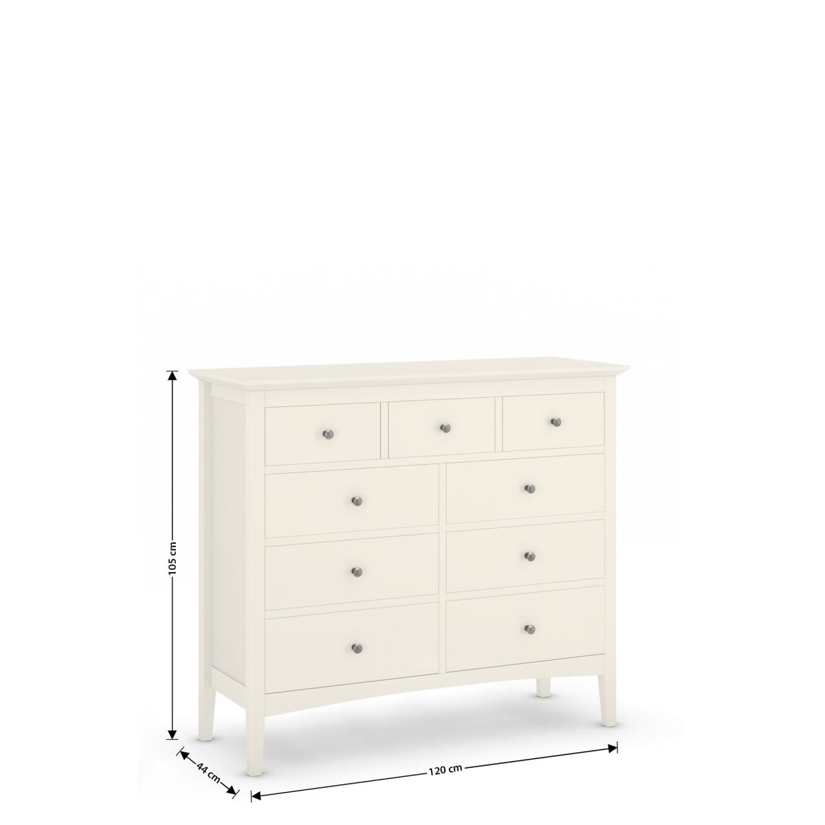 This nine-drawer chest from the Hastings collection offers a comprehensive storage solution with a simple and elegant design. Six larger drawers are arranged in two columns, with a row of three small drawers above, allowing you to store a large quantity of clothes and belongings. The painted finish is available in a range of colours. A curved line between the front legs and small round knobs add cute touches.