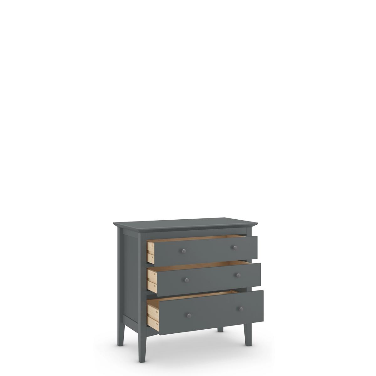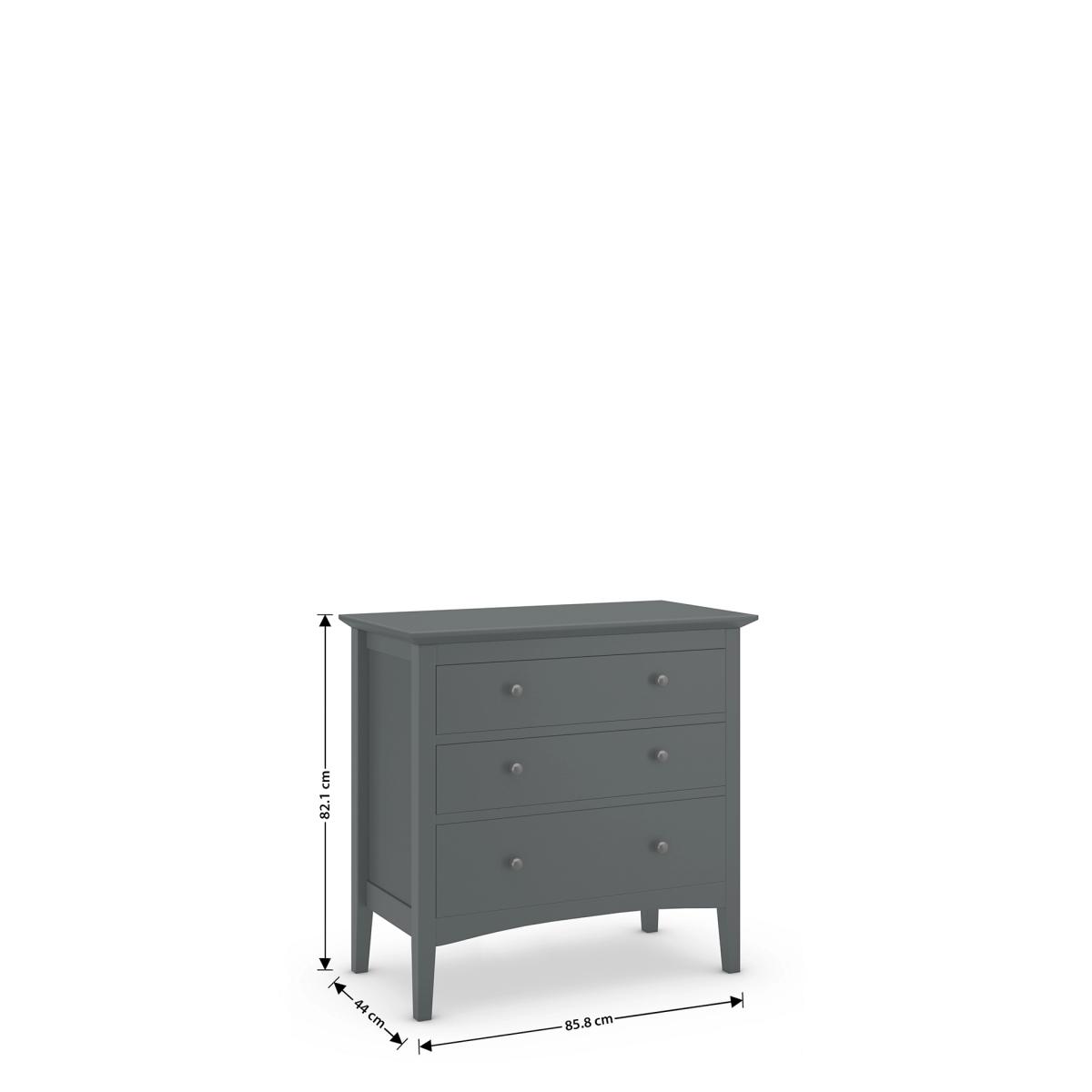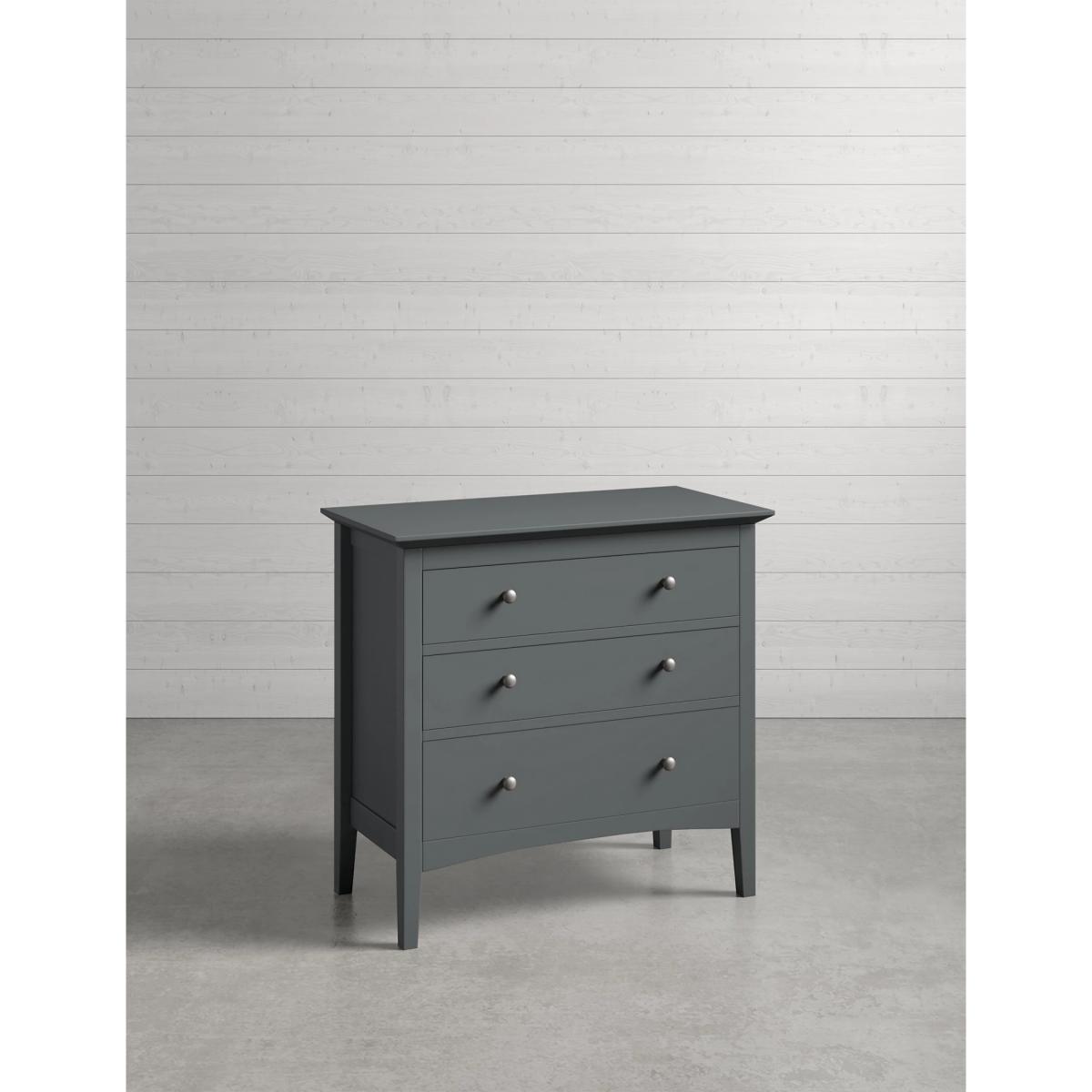 Beautifully finished in a modern dark grey, this sleek chest of drawers will be the focal point of any room. Made from sustainable wood, this sturdy unit gives you ample room to store your clothing, thanks to three generously sized drawers, with each drawer featuring a black metal knob for added style and contrast. A cut-out plinth completes this chest, adding to its sleek appeal. With ample space on top for a TV, plants, books, or bedroom essentials, you can't go wrong with this expertly crafted chest of drawers. We’re so confident our furniture is built to last, our industry-leading guarantee covers any manufacturing failure on all furniture. That’s our promise, and why our furniture comes with a 10-year guarantee that you can trust. Excludes: outdoor furniture and any issues that are a result of normal wear and tear, improper care or accidental damage.