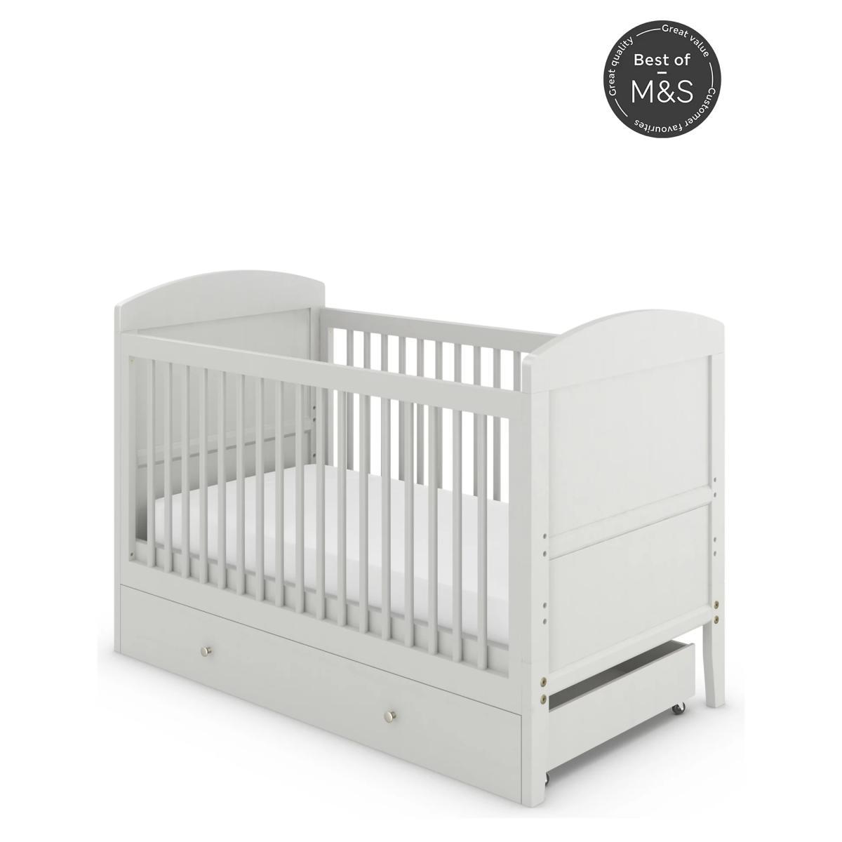 I love the M&S Hastings grey cot bed for its simple, timeless design and versatility. Its neutral grey tone makes it an easy fit in both modern and classic nursery interiors. It works particularly well with pastel shades for a soft, calming vibe or bold colours for a more playful look. For styling tips, keep the space uncluttered and add cosy accessories like textured throws or fun bunting to personalise the area. Incorporating natural materials, such as wooden toys or blankets, can also help create a warm, inviting environment that transitions well as your little one grows.