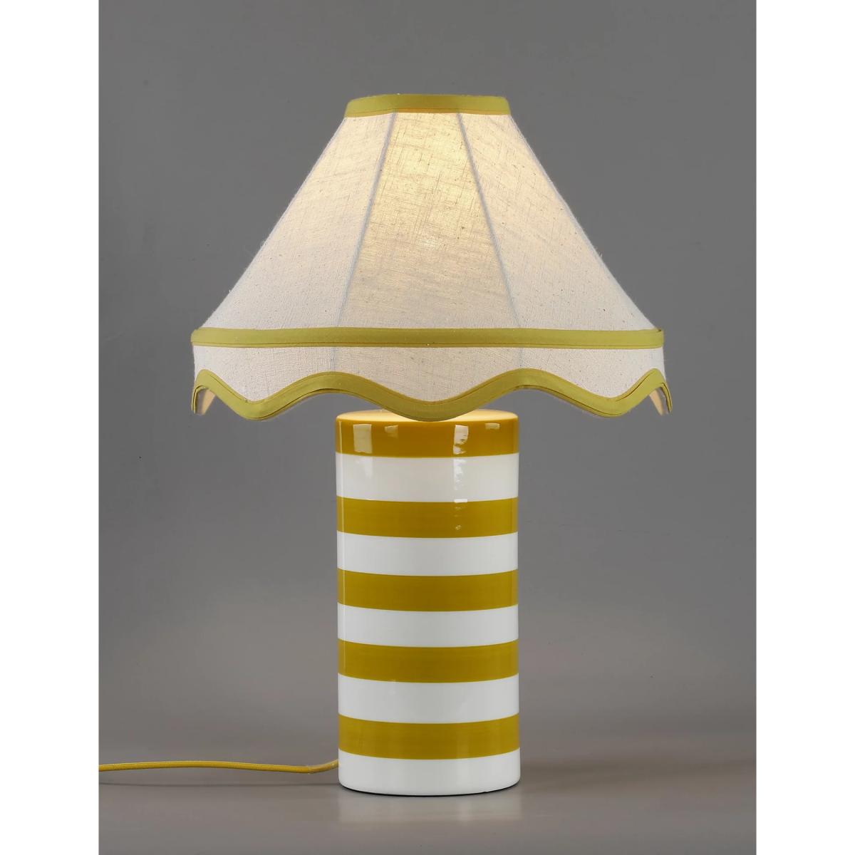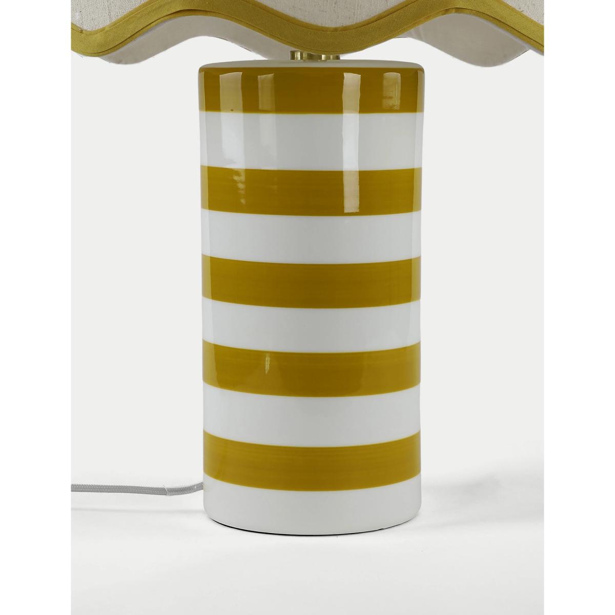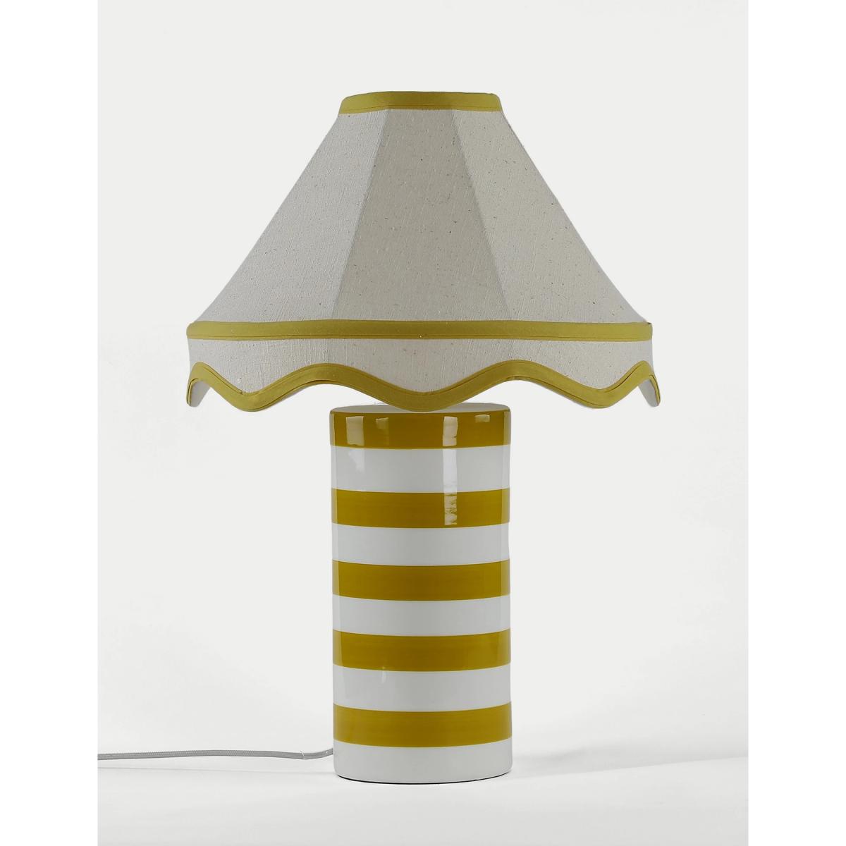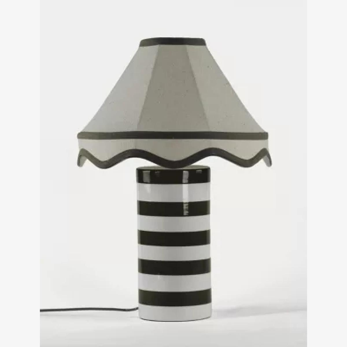 This Hattie table lamp is perfect for adding a contemporary aesthetic to your room. The design features a ceramic cylindrical base which is striped for a modern feel. This is complemented by a timeless fabric shade with a scalloped edge and contrast trims.