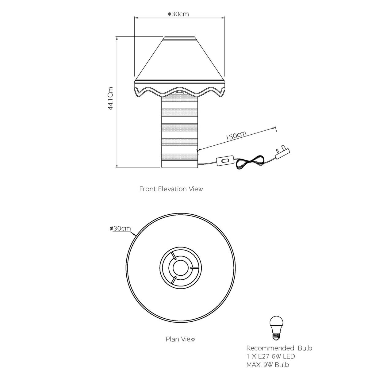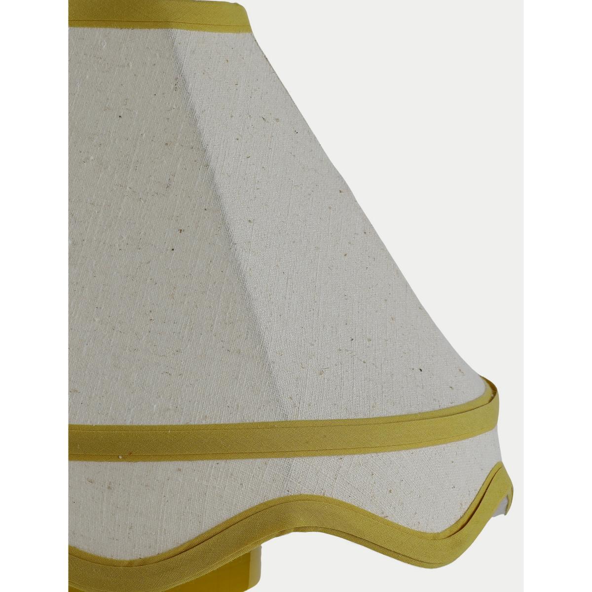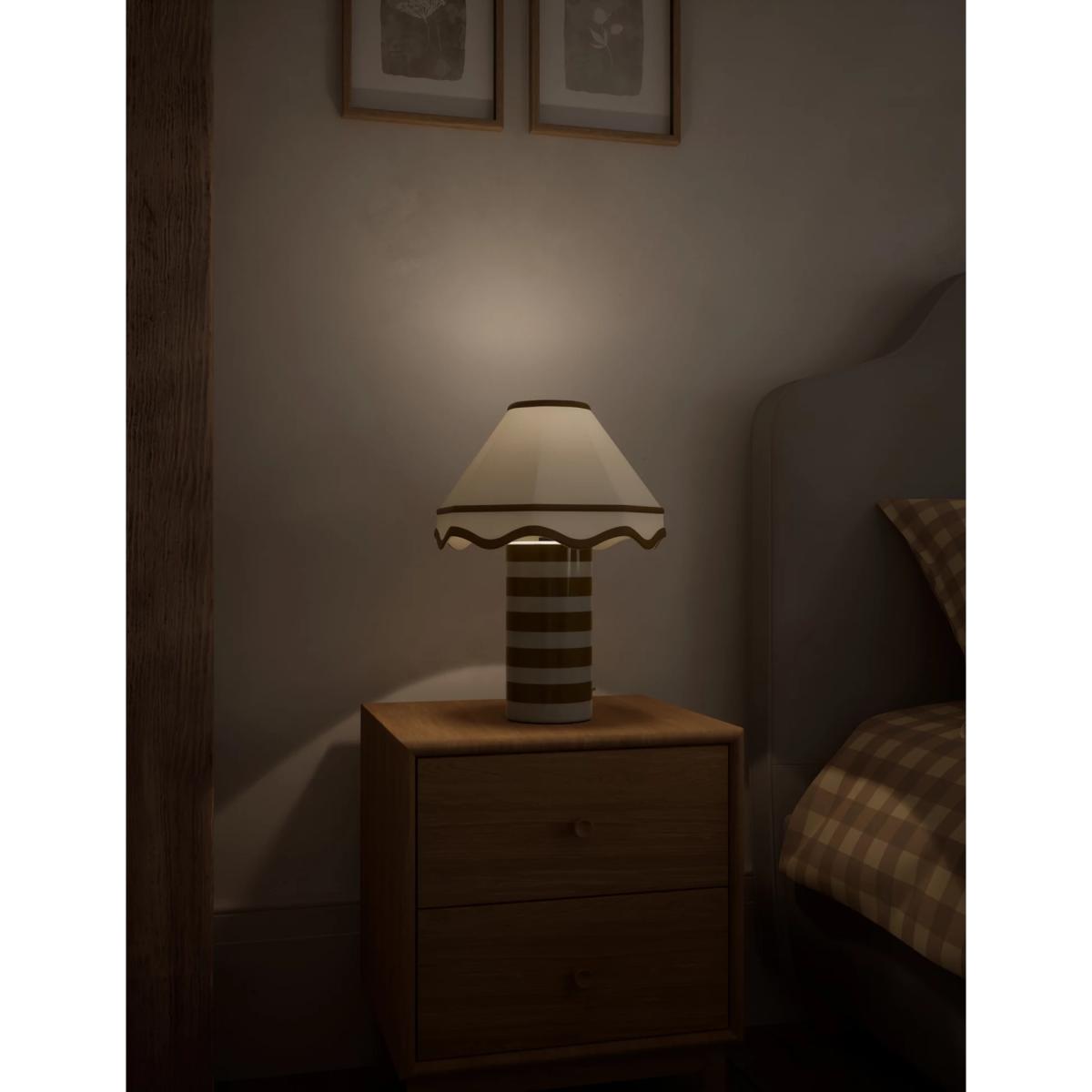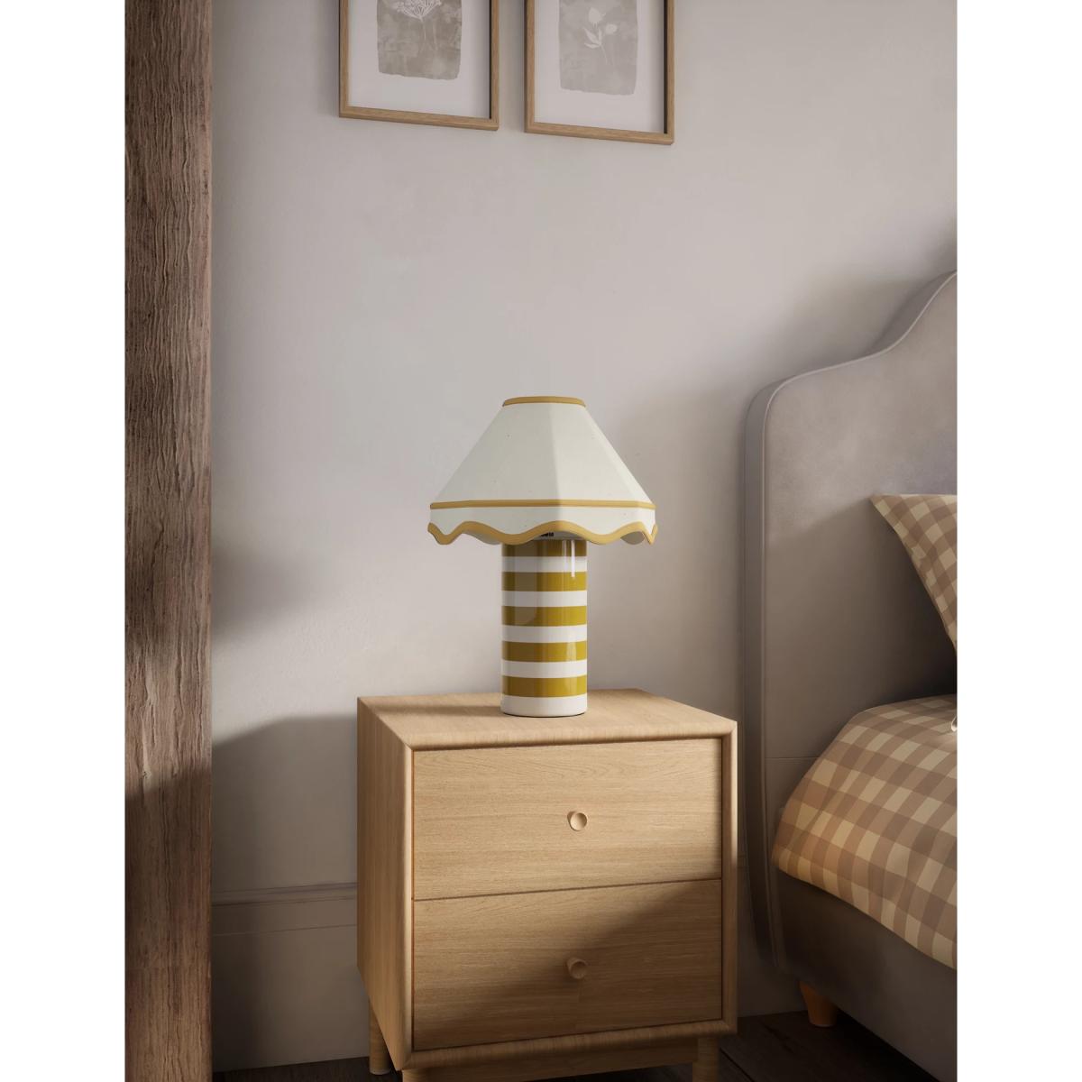 This Hattie table lamp is perfect for adding a contemporary aesthetic to your room. The design features a ceramic cylindrical base which is striped for a modern feel. This is complemented by a timeless fabric shade with a scalloped edge and contrast trims.