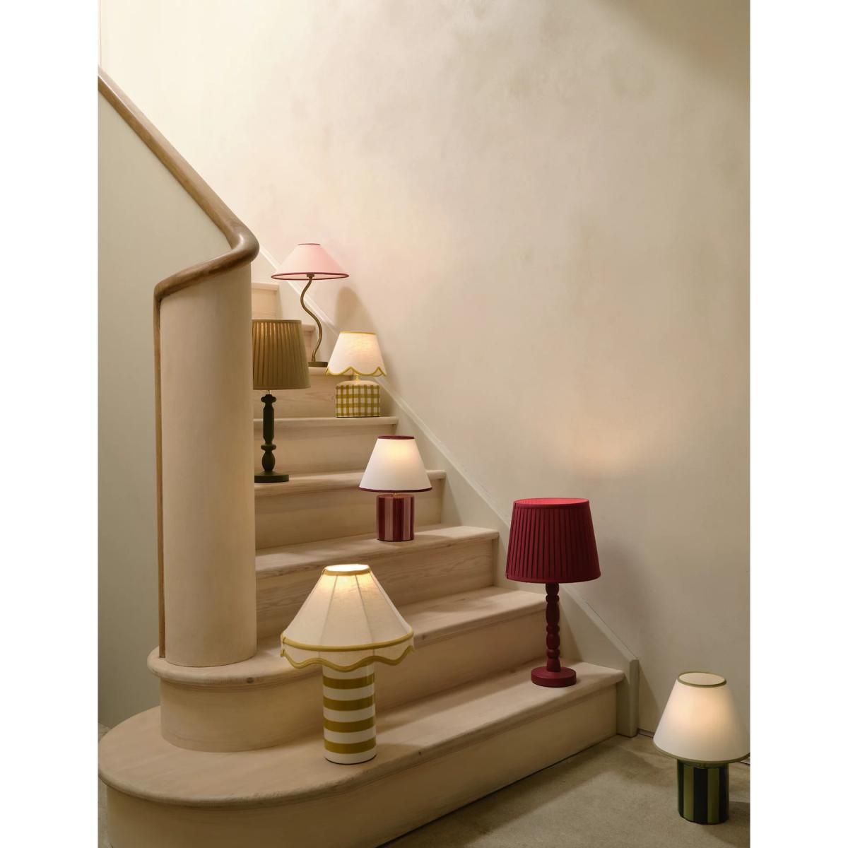 I love this table lamp for its playful yet sophisticated stripe pattern, which instantly adds visual interest to a room without overpowering the space. It works exceptionally well in eclectic or coastal-inspired interiors, where the bold stripes and contrasting colours can complement other statement pieces. Practical styling tips include pairing it with neutral or subtly patterned surroundings to let the lamp stand out or combining it with layered textures like soft throws or woven accessories for a cosy feel. Its size makes it versatile - ideal as a bedside lamp or on a side table in a living room or study, bringing in a touch of colour and pattern while staying functional.
