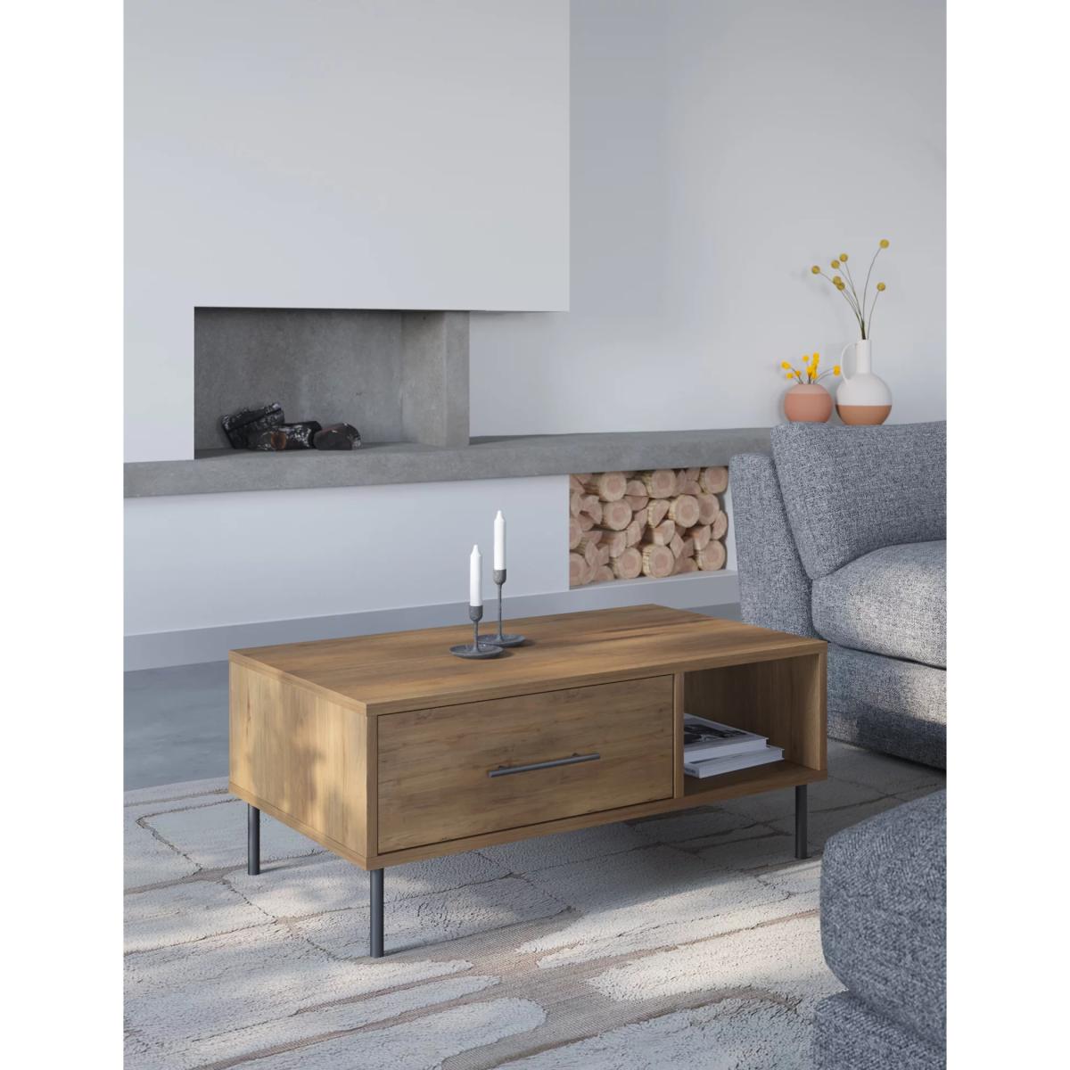 Make the most of every inch of space, with this practical storage coffee table. An open shelf gives useful room for books and magazines, and a closed drawer makes an ideal spot to store smaller items. The wood-effect finish and simple, angular form ensure a contemporary look. Matching pieces from the Holt range are available. We’re so confident our furniture is built to last, our industry-leading guarantee covers any manufacturing failure on all furniture. That’s our promise, and why our furniture comes with a 10-year guarantee that you can trust. Excludes: outdoor furniture and any issues that are a result of normal wear and tear, improper care or accidental damage.