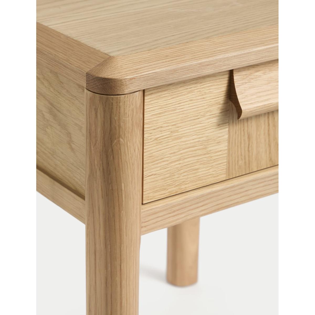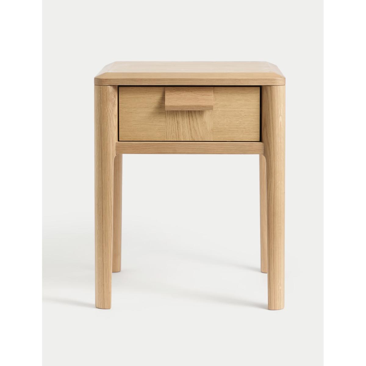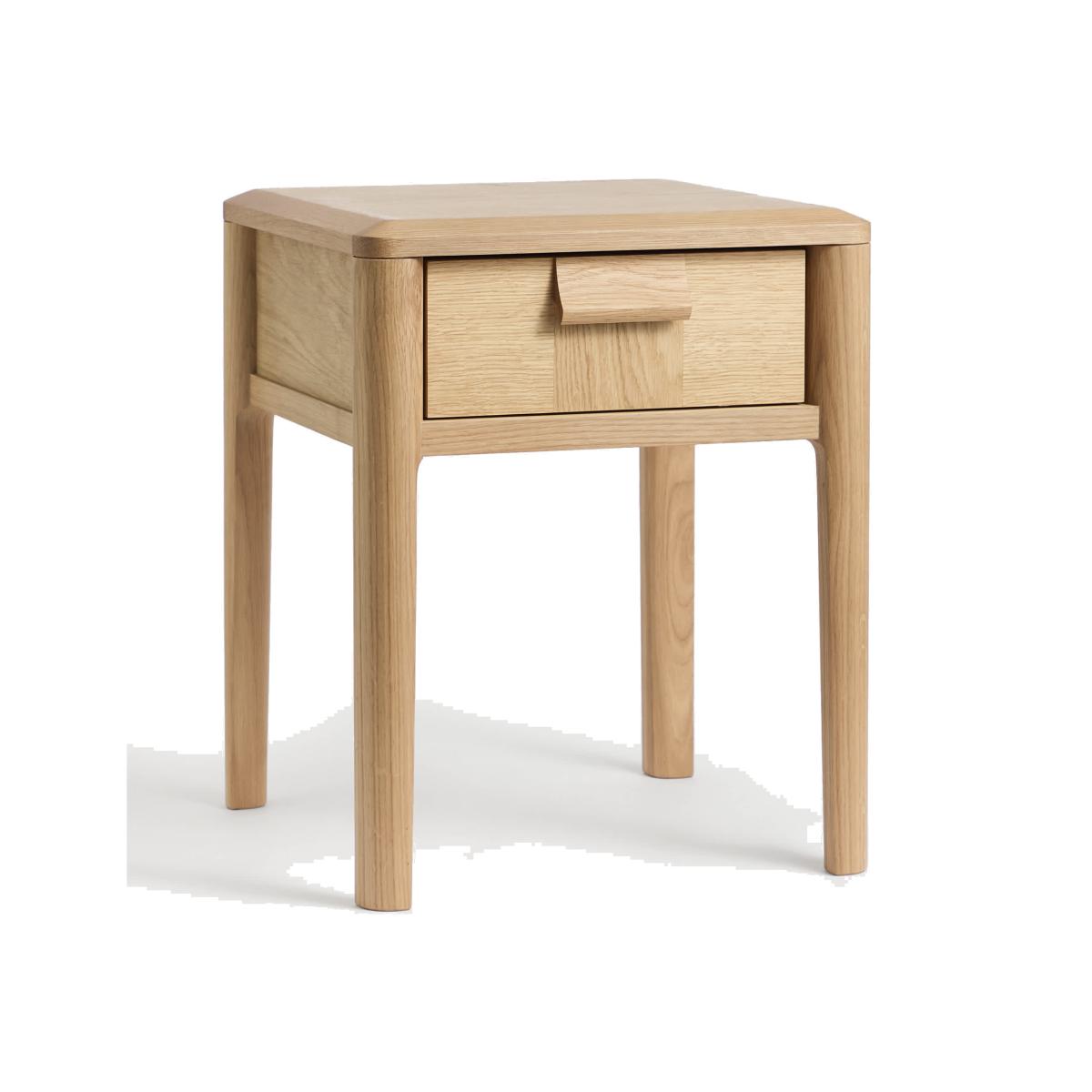 This contemporary side table brings a touch of understated elegance to your room. It's crafted with smooth curved edges and combines a beautiful oak veneer top with solid oak legs. The drawer is complete with a stylish curved handle. We’re so confident our furniture is built to last, our industry-leading guarantee covers any manufacturing failure on all furniture. That’s our promise, and why our furniture comes with a 10-year guarantee that you can trust. Excludes: outdoor furniture and any issues that are a result of normal wear and tear, improper care or accidental damage.