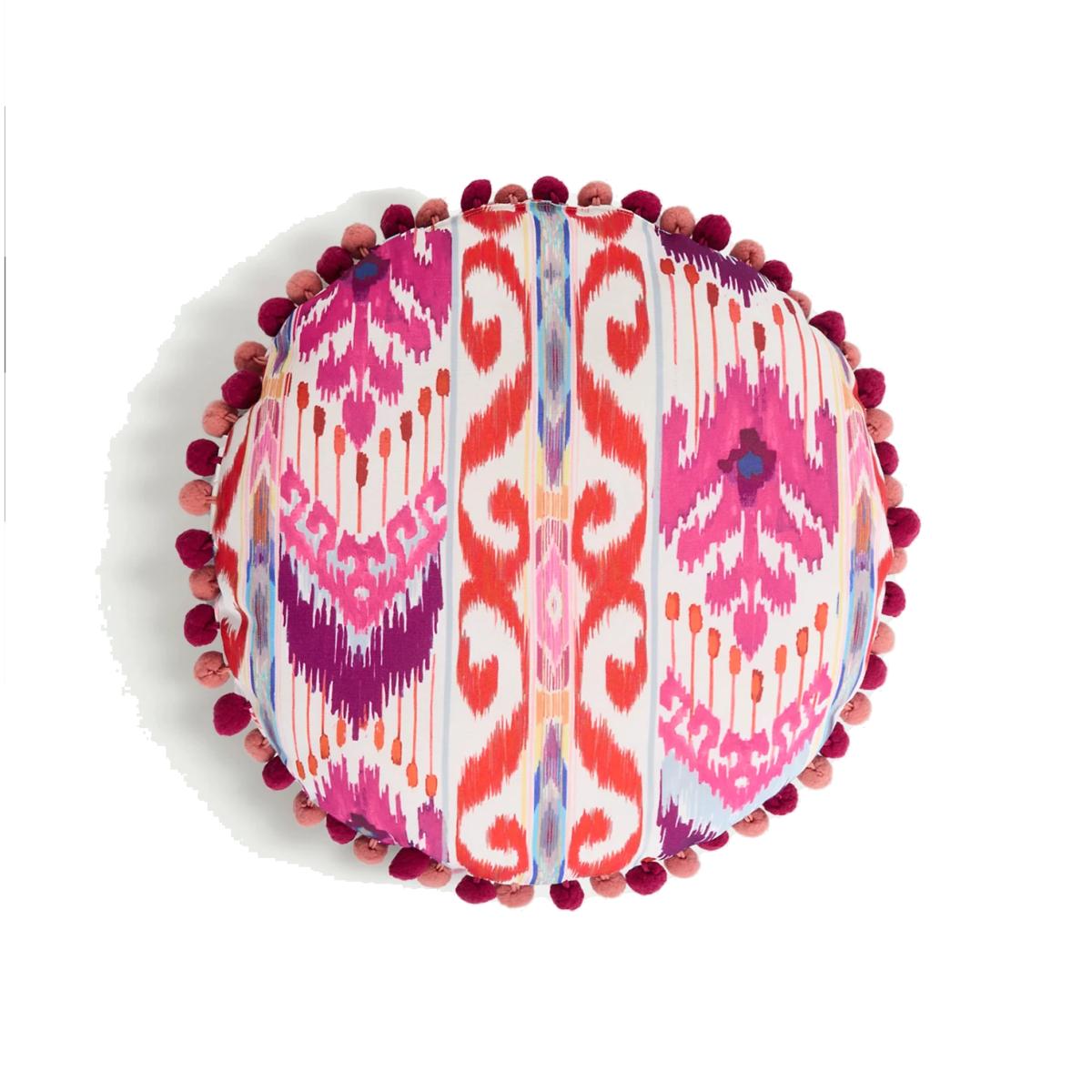 Add colour and comfort to your outdoor living space with this round seat cushion. Its bold ikat print is complemented by pom pom detailing around the edge for a sophisticated yet playful look. As a practical touch, it's made from water-resistant fabric.