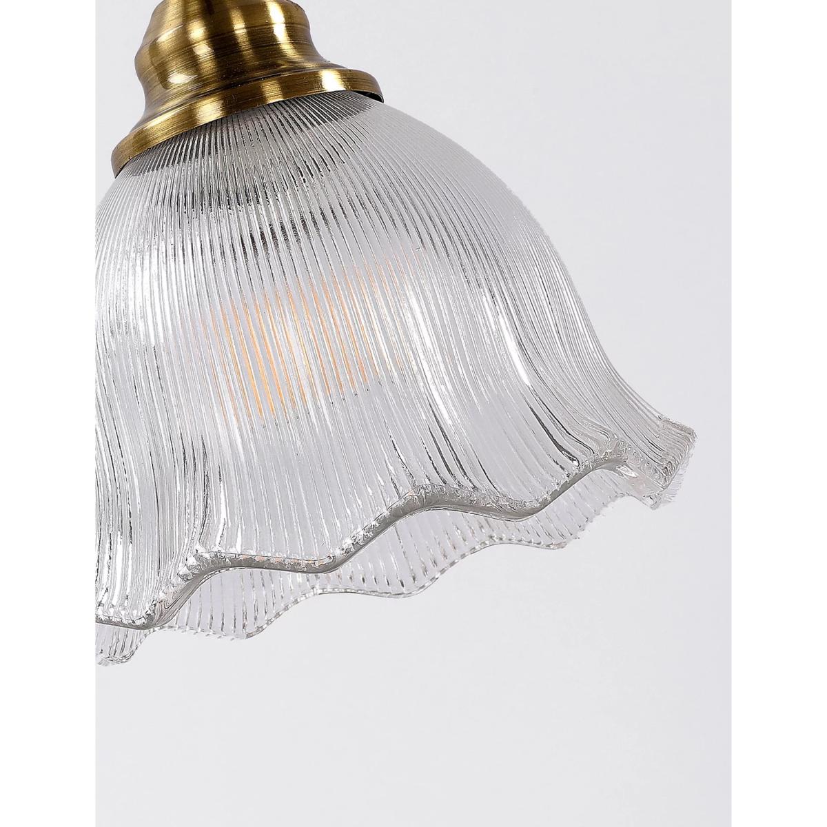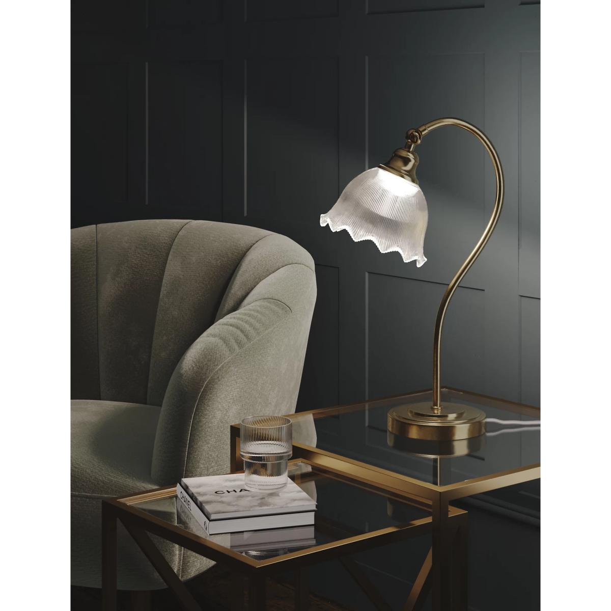 The Josephine table lamp is finished in antique brass for a traditional feel. It features a clear glass shade, crafted with gentle ripples to add subtle detail. A matching pendant light is also available.
