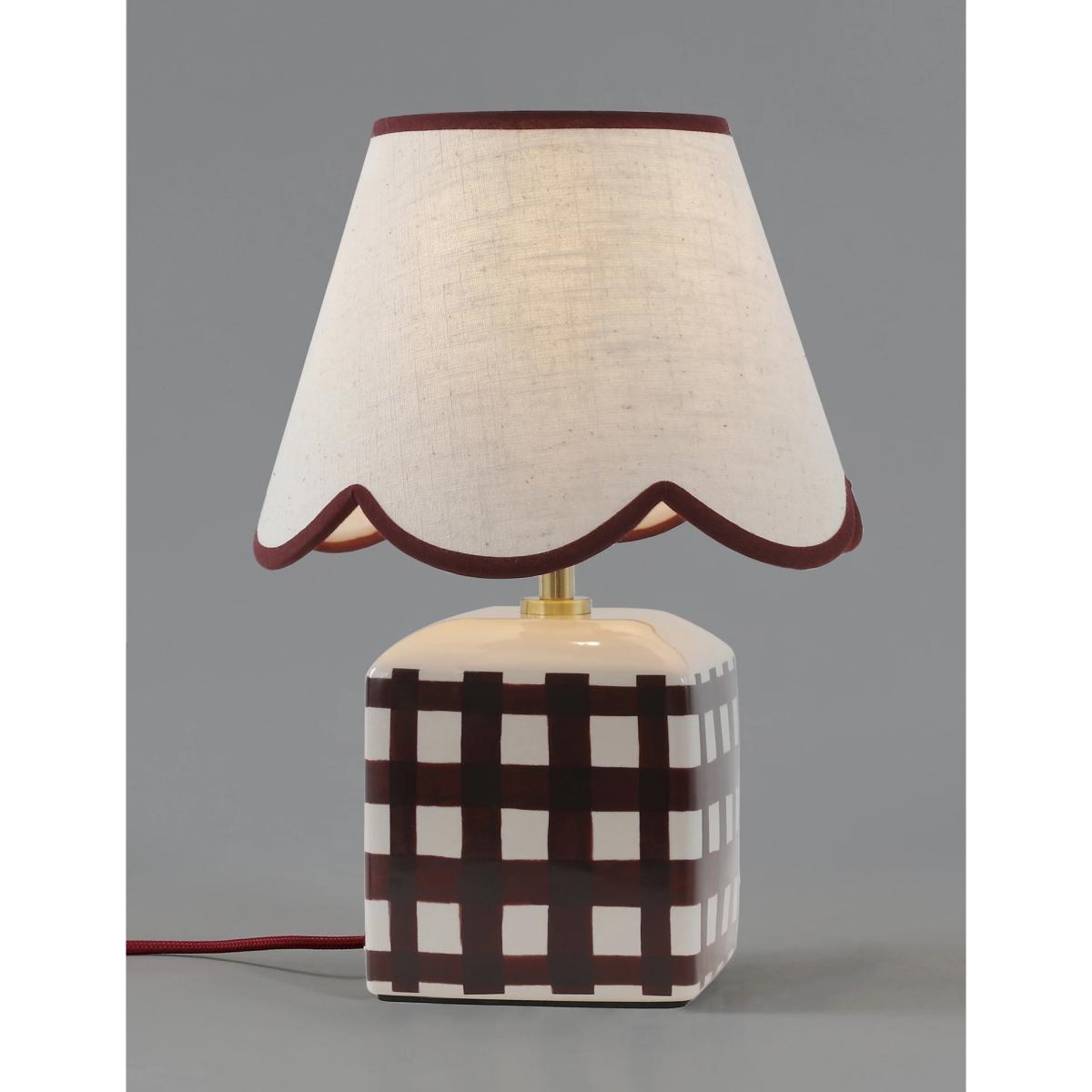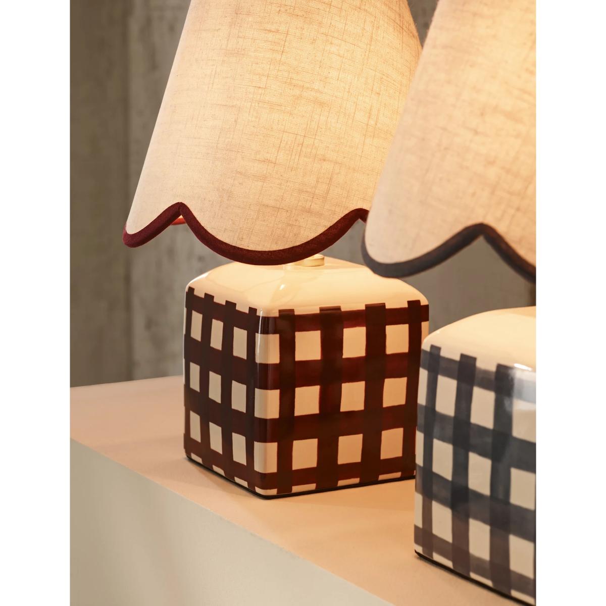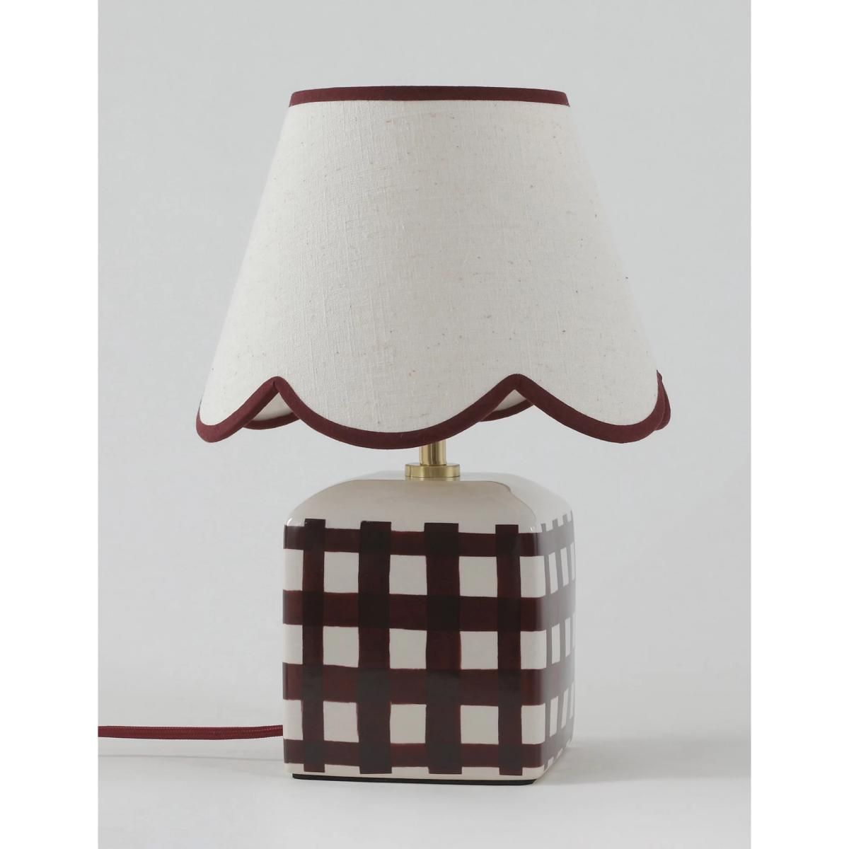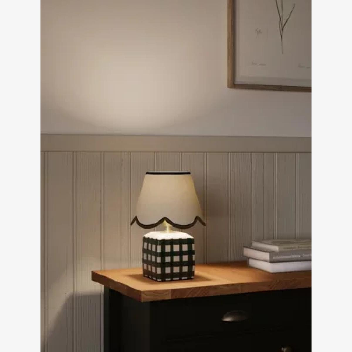 This small ceramic table lamp brings a touch of kitsch charm to classic interiors. It's designed with a scallop-edged shade and a checked base. Piping on the shade adds a playful finish.