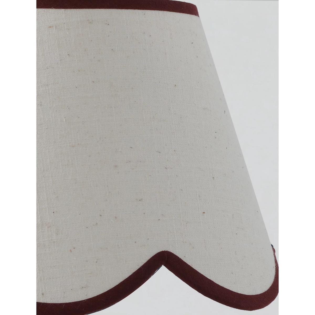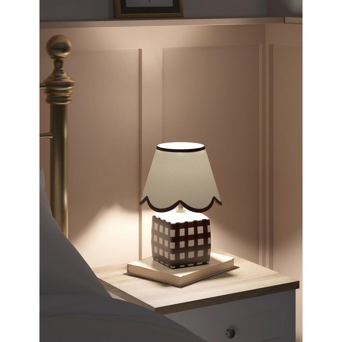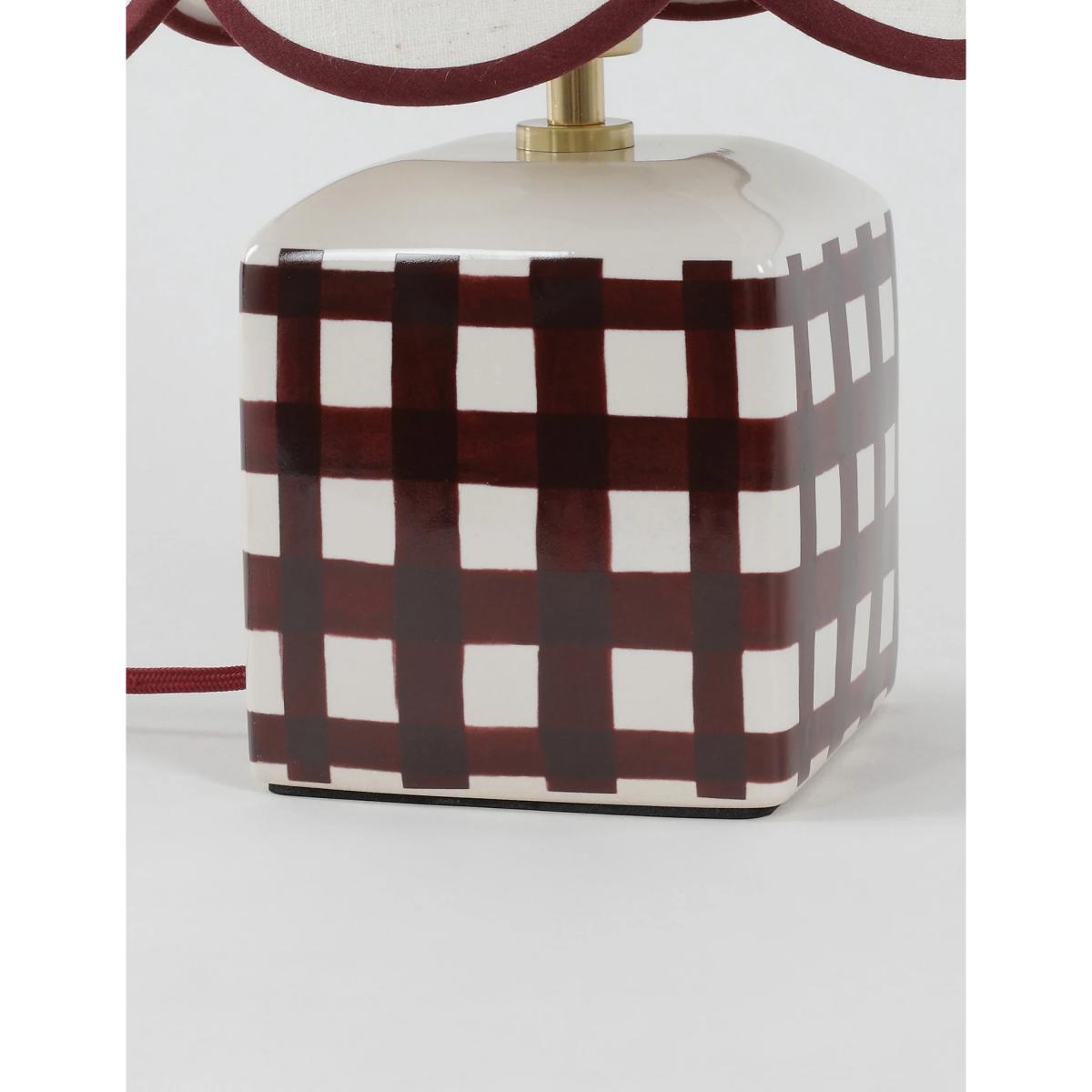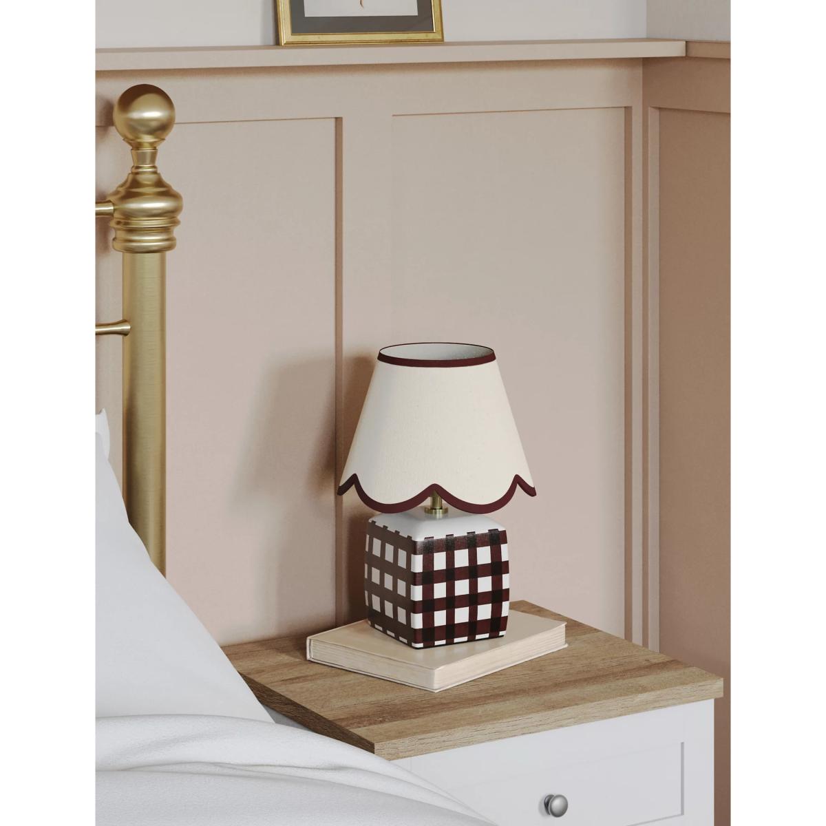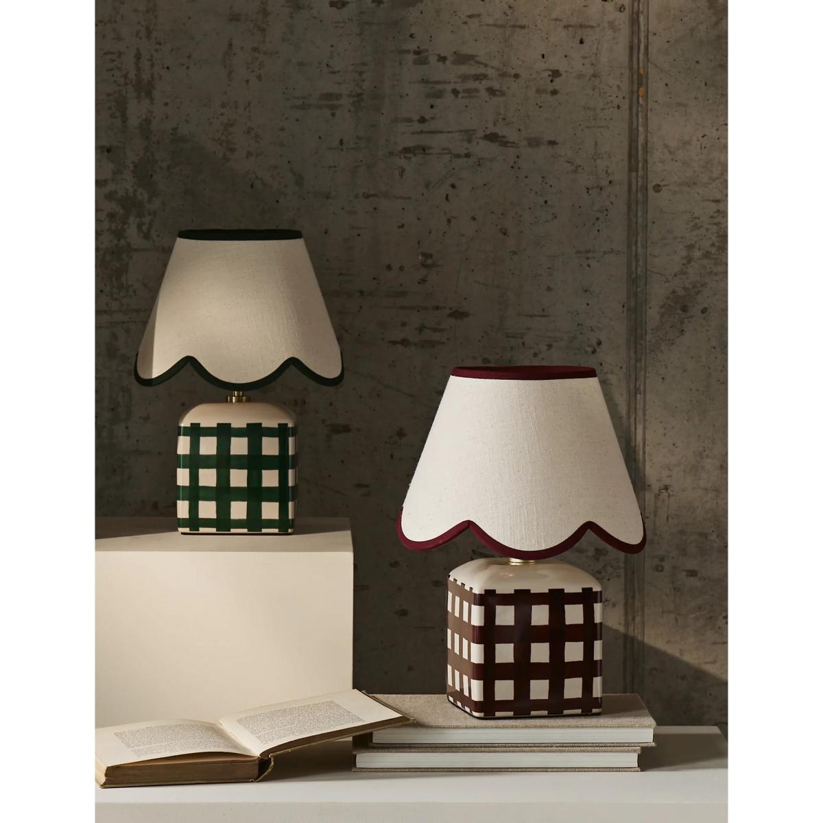 This small ceramic table lamp brings a touch of kitsch charm to classic interiors. It's designed with a scallop-edged shade and a checked base. Piping on the shade adds a playful finish.