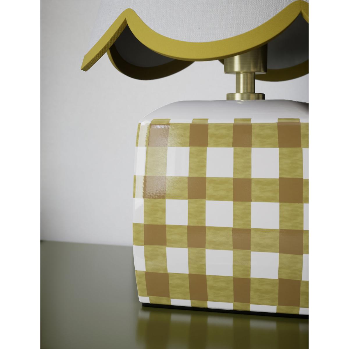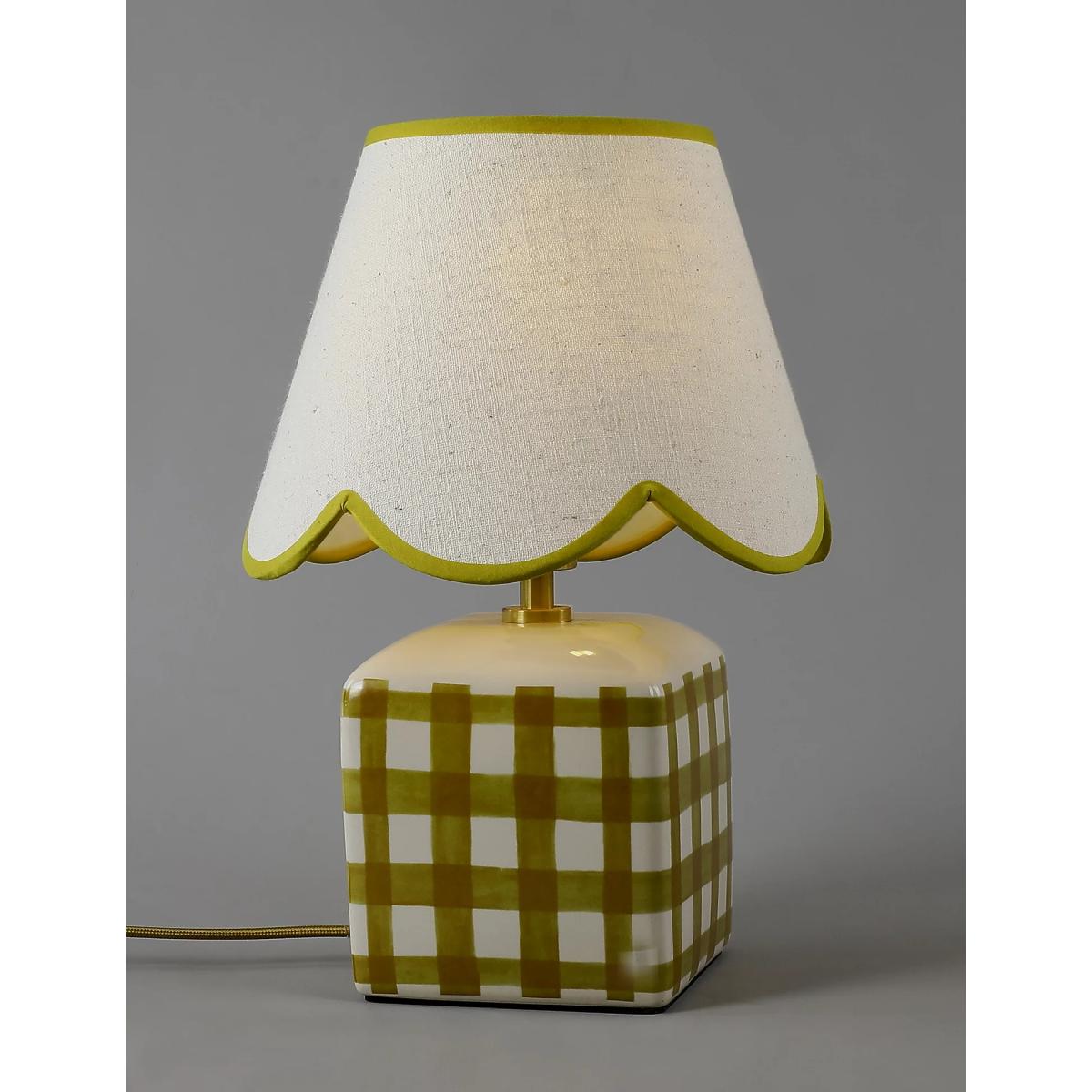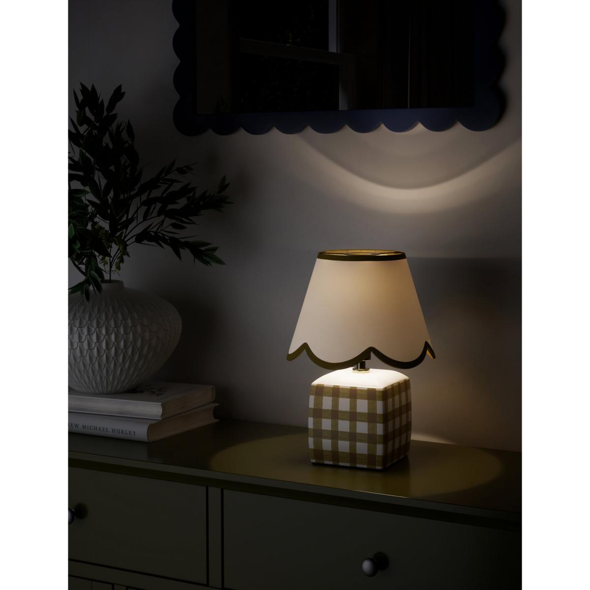 This small ceramic table lamp brings a touch of kitsch charm to classic interiors. It's designed with a scallop-edged shade and a checked base. Piping on the shade adds a playful finish.