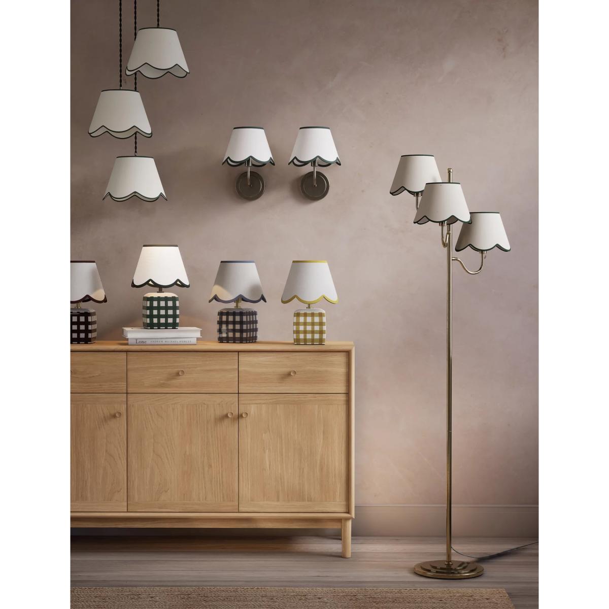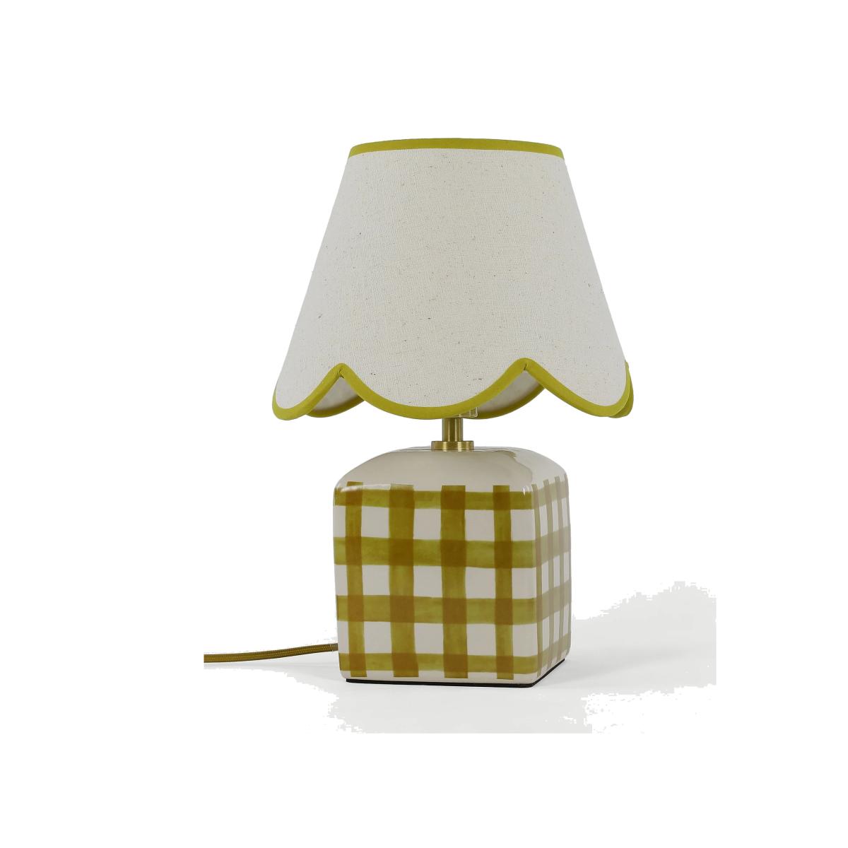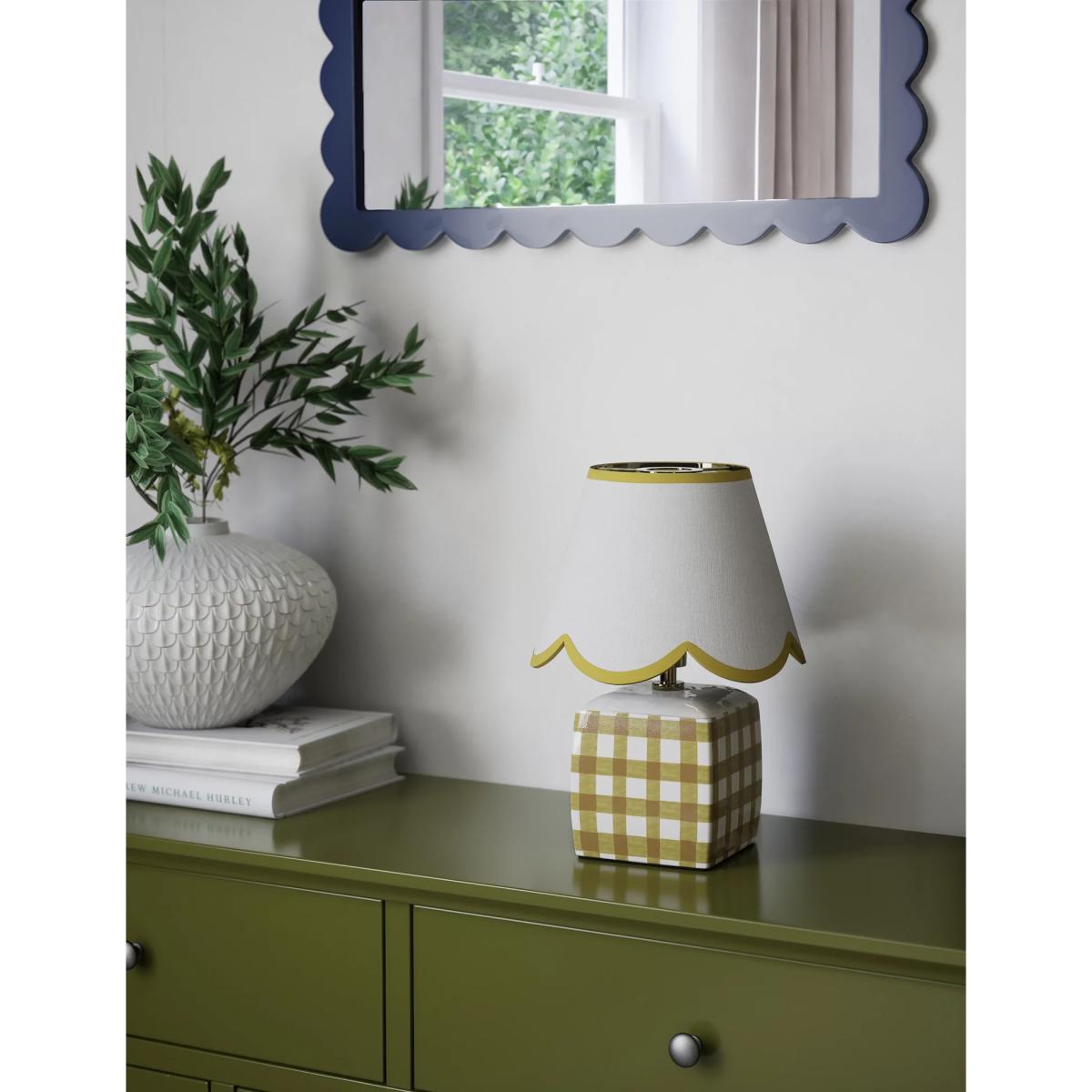 This small ceramic table lamp brings a touch of kitsch charm to classic interiors. It's designed with a scallop-edged shade and a checked base. Piping on the shade adds a playful finish.