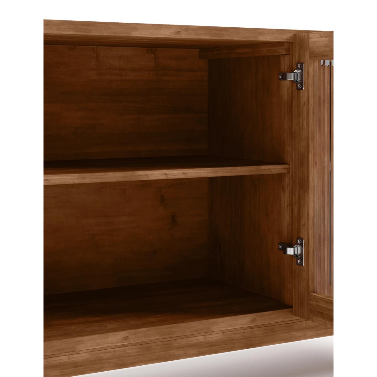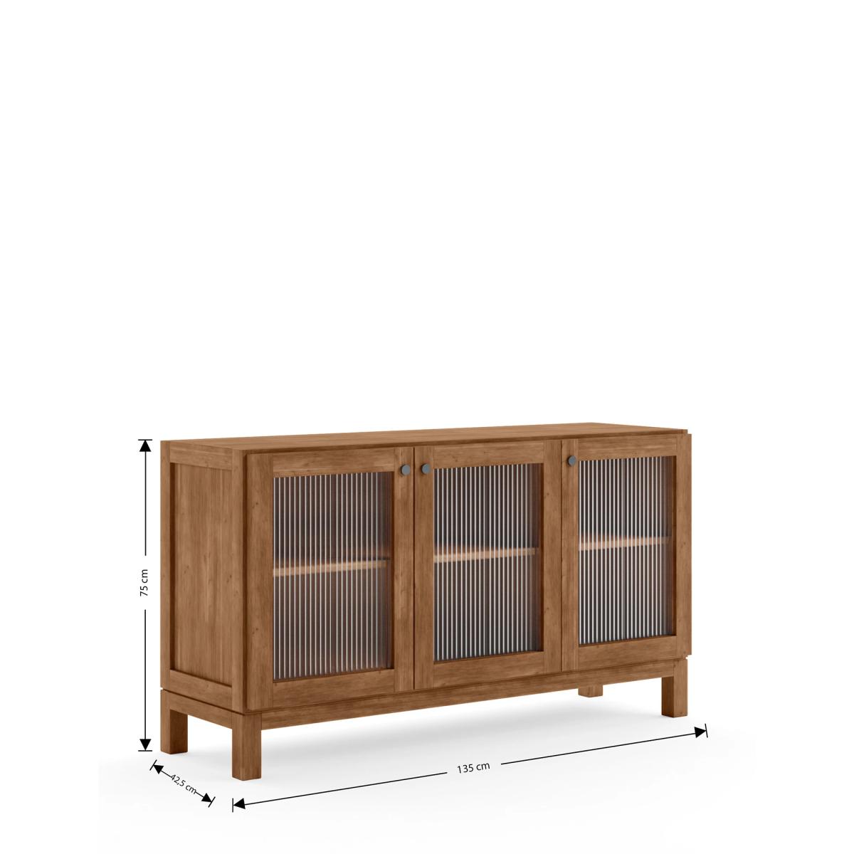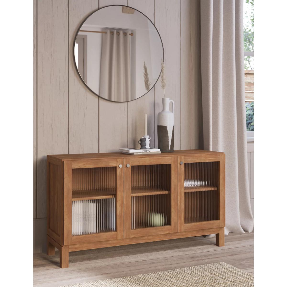 This large three-door sideboard from the Langham range combines statement style with practical storage. Fluted glass fronts on the soft-close doors create a striking mid-century look, while brushed metal handles add understated detail. Inside, wide shelves provide plenty of room to store larger items. The polished acacia veneer top provides generous display space for photographs, ornaments or flowers. Its solid wood legs are made in a squared-off design that complements the clean, simple lines. Matching pieces are available. We’re so confident our furniture is built to last, our industry-leading guarantee covers any manufacturing failure on all furniture. That’s our promise, and why our furniture comes with a 10-year guarantee that you can trust. Excludes: outdoor furniture and any issues that are a result of normal wear and tear, improper care or accidental damage.