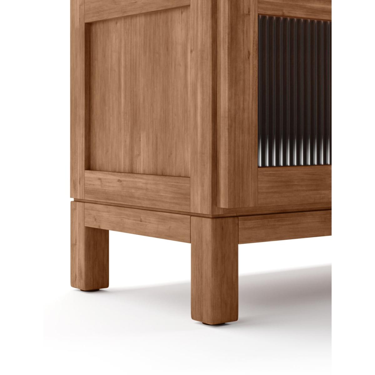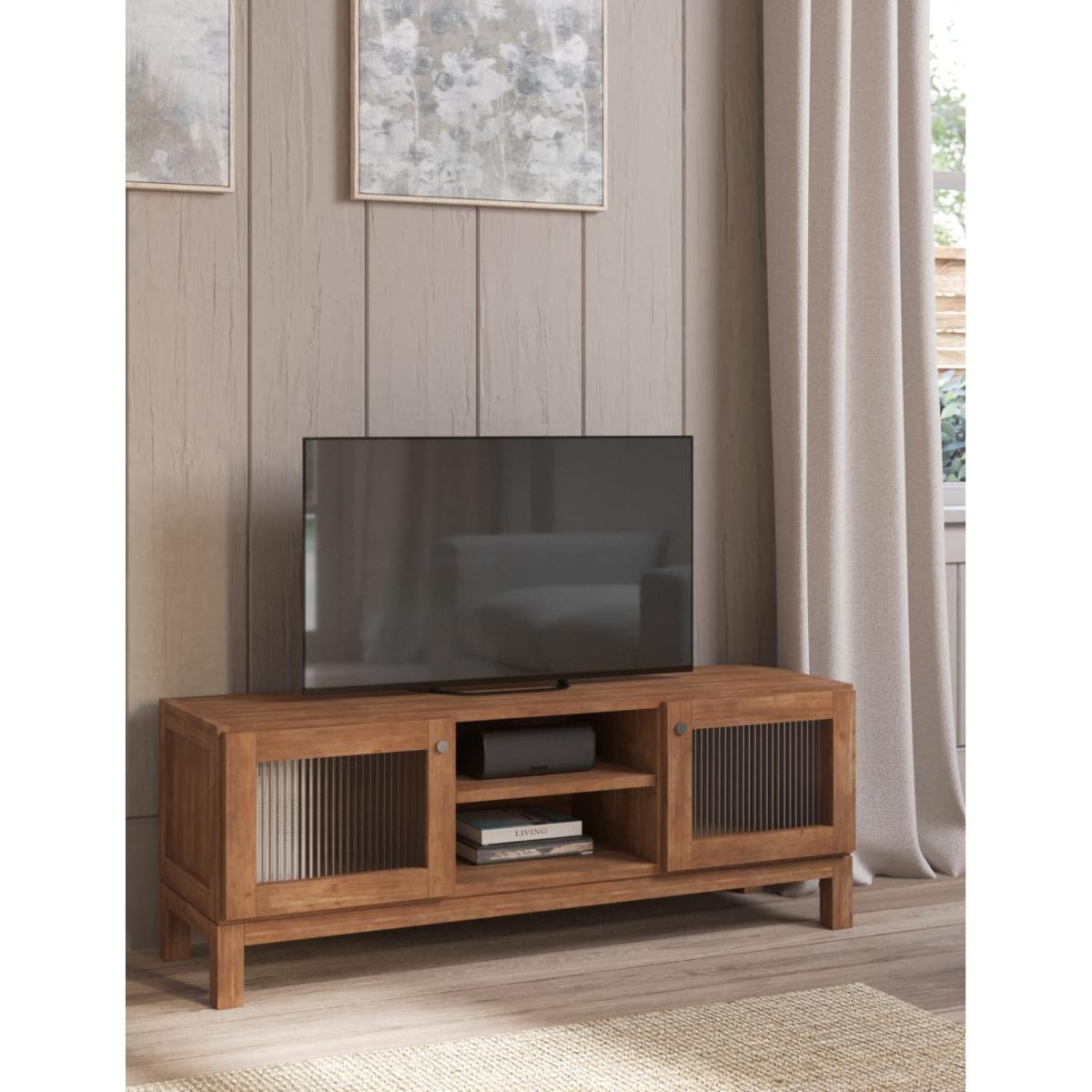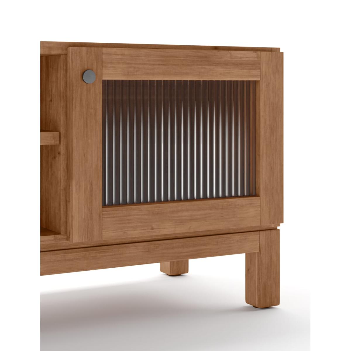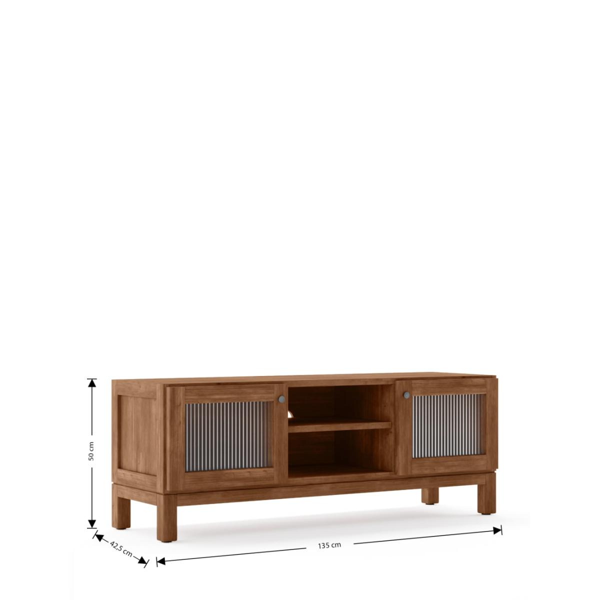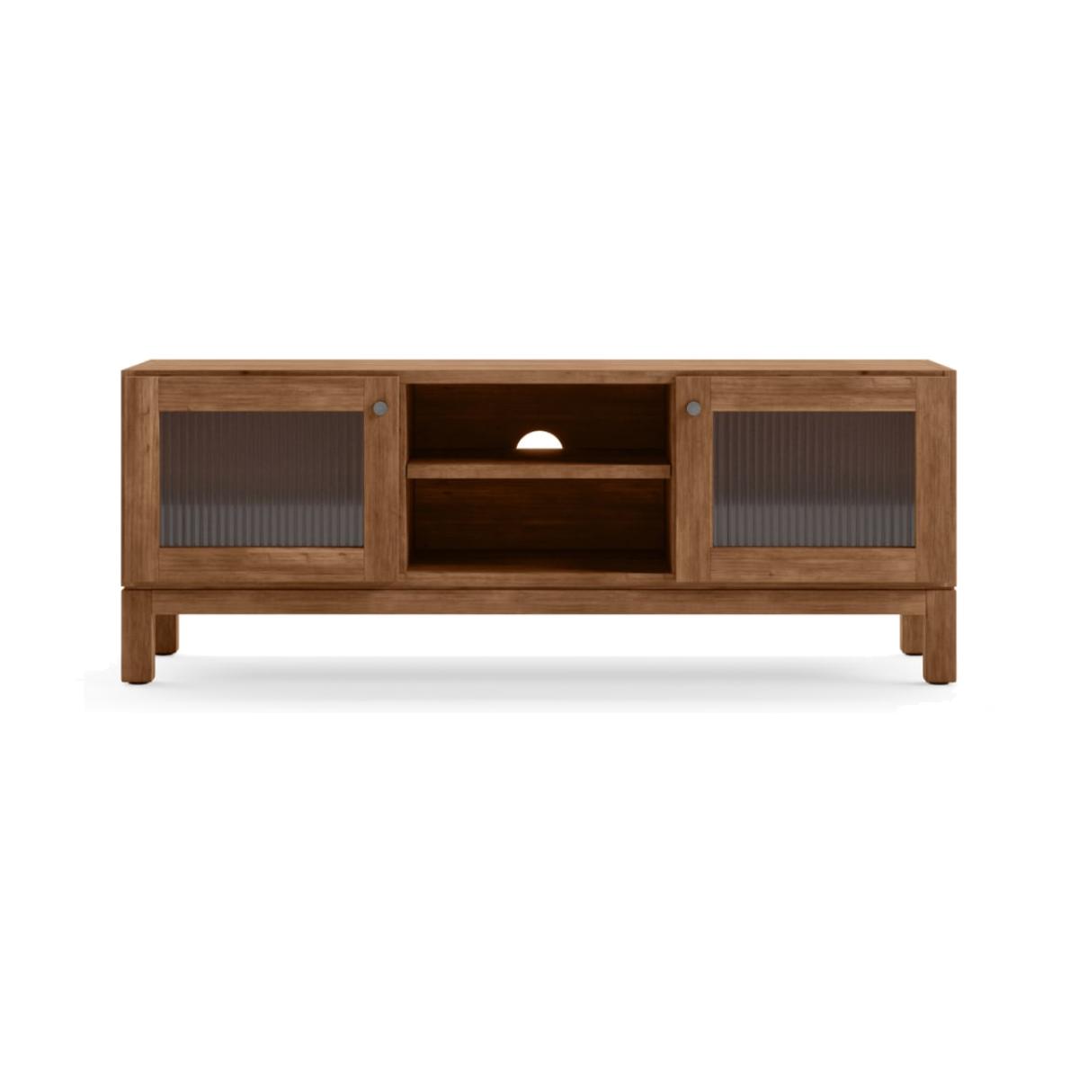 With its acacia wood veneer construction and solid, squared-off form, the Langham TV unit makes a striking choice. Beneath the practical flat top, a shelved central section provides space for digital boxes, gaming systems and other essentials, while a cable port at the back ensures a clutter-free look. Additional storage sits behind the two fluted glass-fronted doors, which have soft-close catches and are finished with sleek brushed-metal handles. Matching pieces from the Langham range are available. We’re so confident our furniture is built to last, our industry-leading guarantee covers any manufacturing failure on all furniture. That’s our promise, and why our furniture comes with a 10-year guarantee that you can trust. Excludes: outdoor furniture and any issues that are a result of normal wear and tear, improper care or accidental damage.