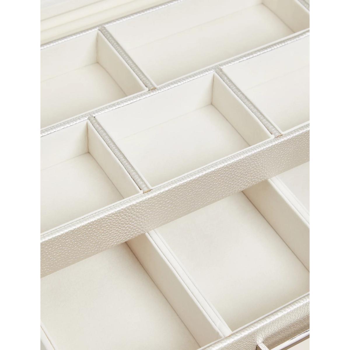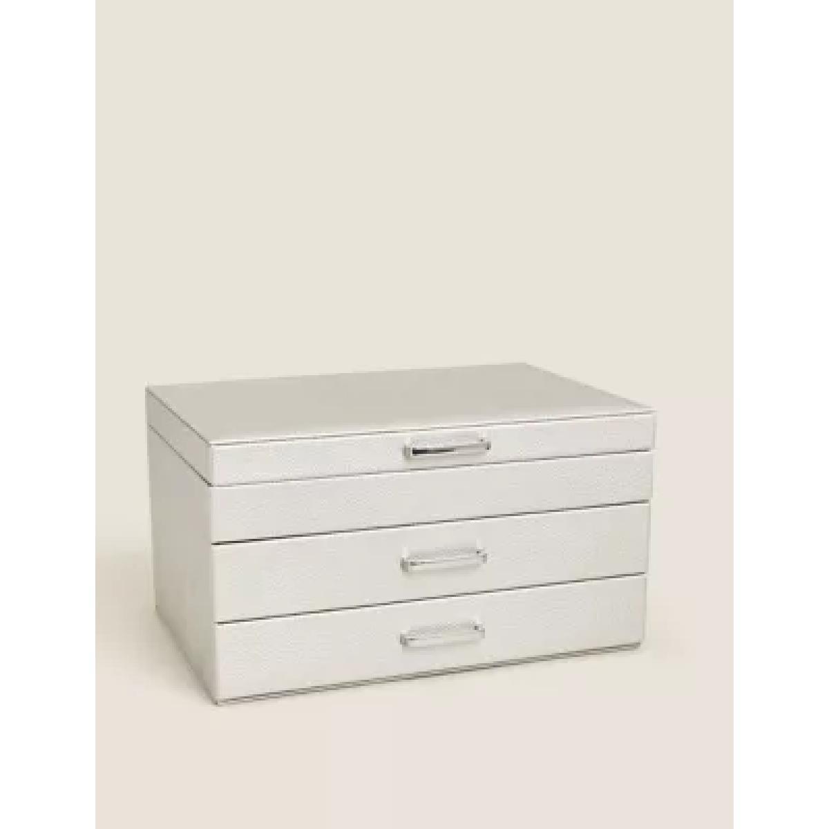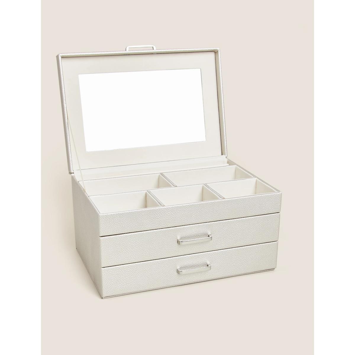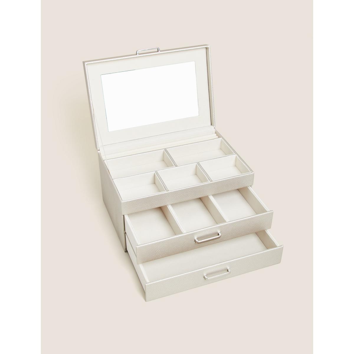 Keep your accessories organised with this three-tier jewellery box. The bottom drawer is perfect for larger items, while the middle drawer is split into three compartments and the top layer is divided into five sections. The lid has a large mirror on the underside for trying your pieces on. The box is finished in textured faux leather.