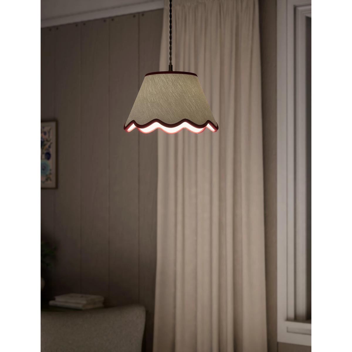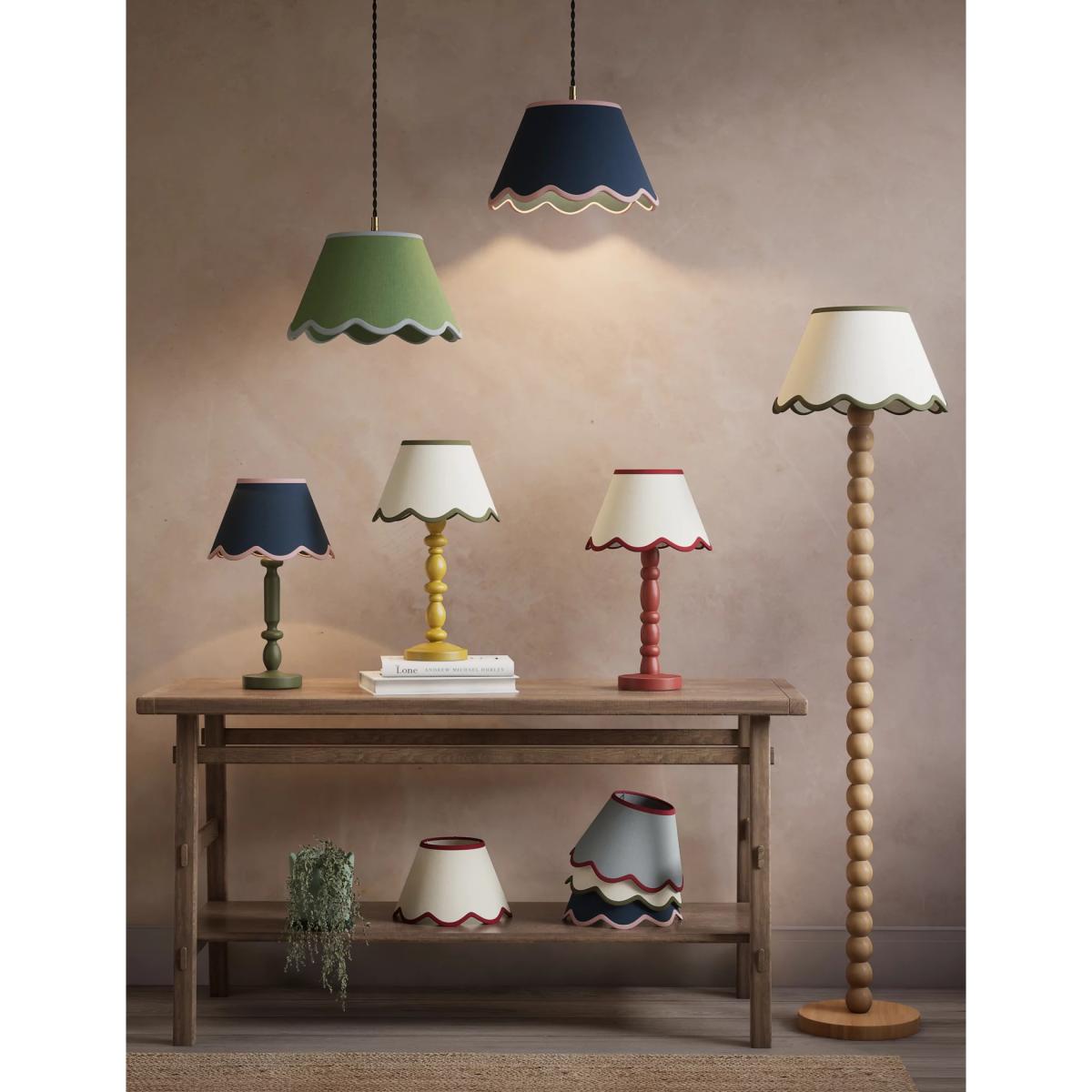 This large scallop trim lamp shade in soft green is a versatile choice for adding a touch of subtle charm to your space. I love how its scalloped edge creates a delicate, vintage-inspired detail without overwhelming the design. It works beautifully in a variety of interiors, from cosy cottages to contemporary homes with a playful twist. Practical styling tips include pairing it with brass or matte black fittings to add contrast, or layering it with textured cushions and throws in complementary colours like navy or red for a cohesive look. It’s ideal for adding a pop of colour and character to living rooms, bedrooms, or favourite reading nooks.