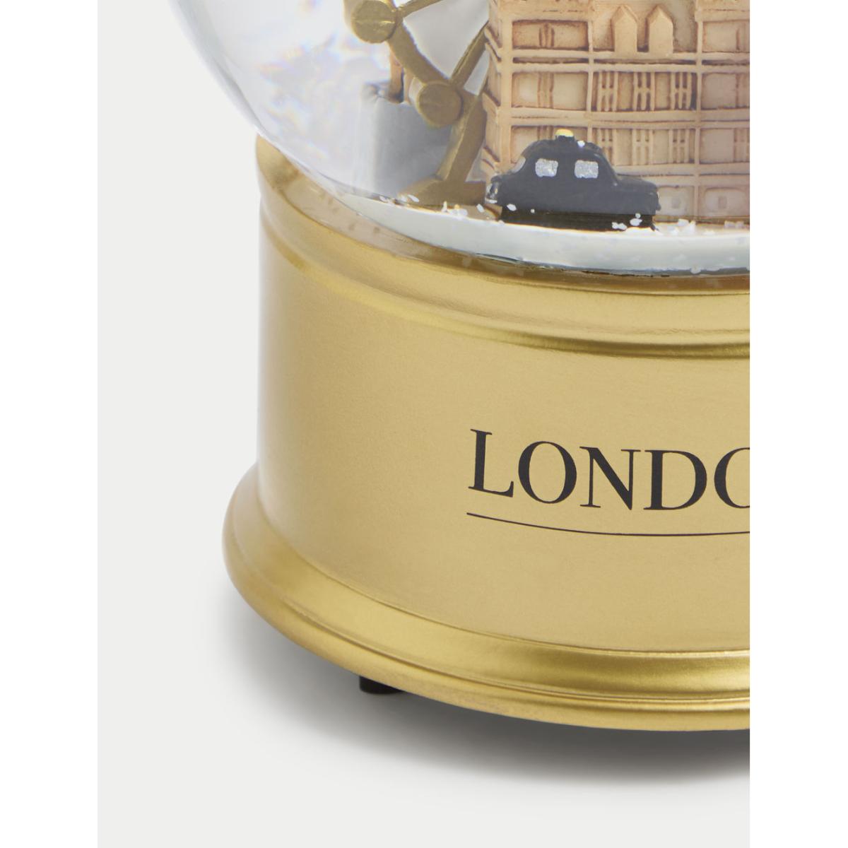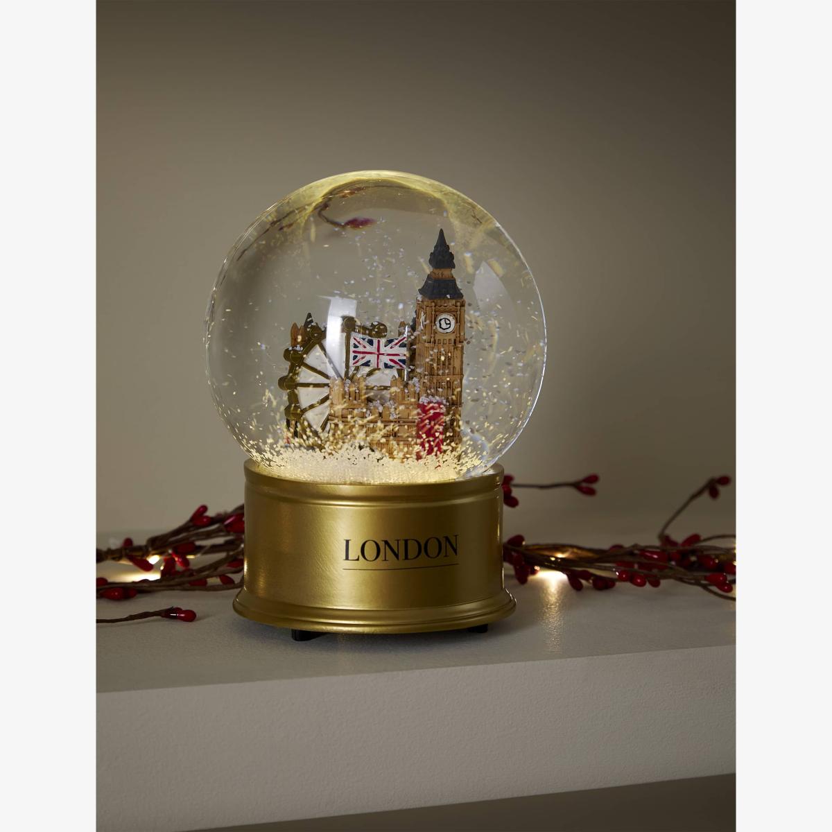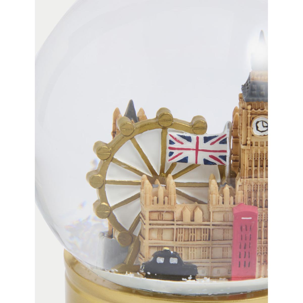 Iconic London landmarks feature in this seasonal snow globe. The glass cloche encloses Big Ben, a London taxi, a phone box, the London Eye and a Union Jack, all hand-painted for a unique look. A gold base complements the design, which also lights up for a special touch.
