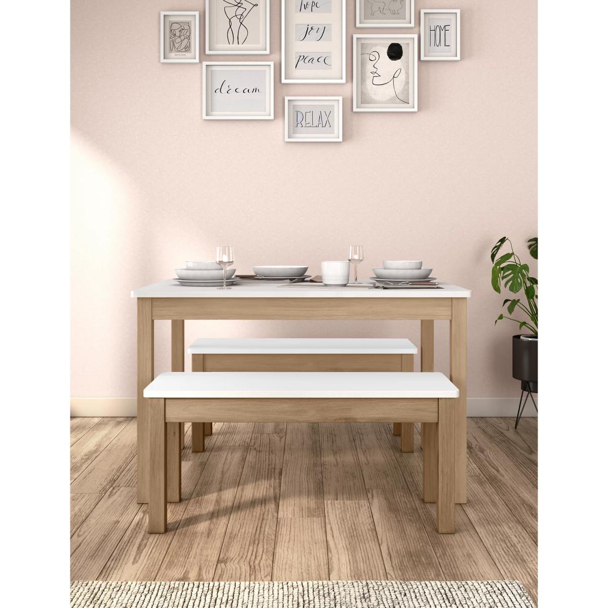 The clean lines and simple design of this Loft dining table make it a good match for most interior styles. Featuring two benches that stow neatly under the table, this minimal wood-effect set is ideal for more compact dining areas. Find matching furniture in the rest of our Loft range.