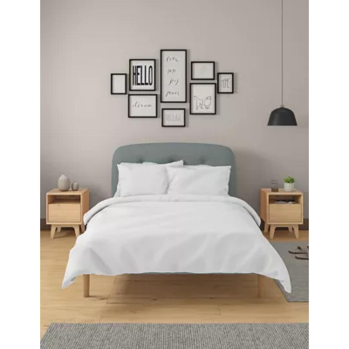 Combine comfort and style with this bed from the Mila collection. The large headboard is padded to make a comfortable backrest when sitting up to read or enjoy a hot morning drink, and it's finished with a triple button detail. The bed sits on short oak-effect legs for a classic design and a low profile that creates a feeling of space. Available in a range of colours.