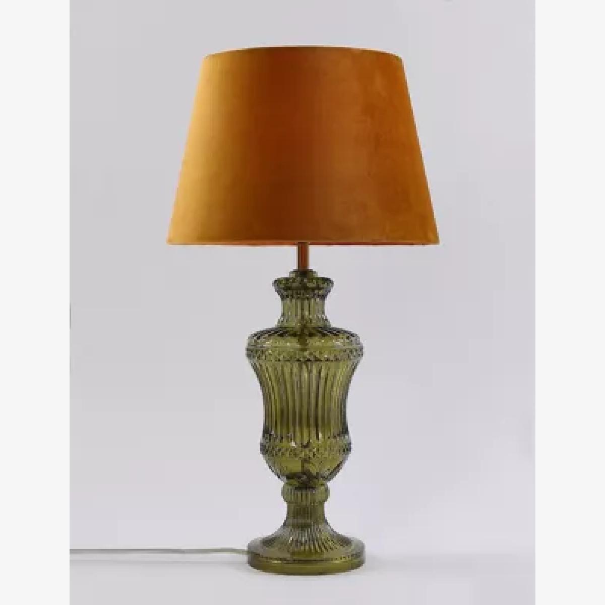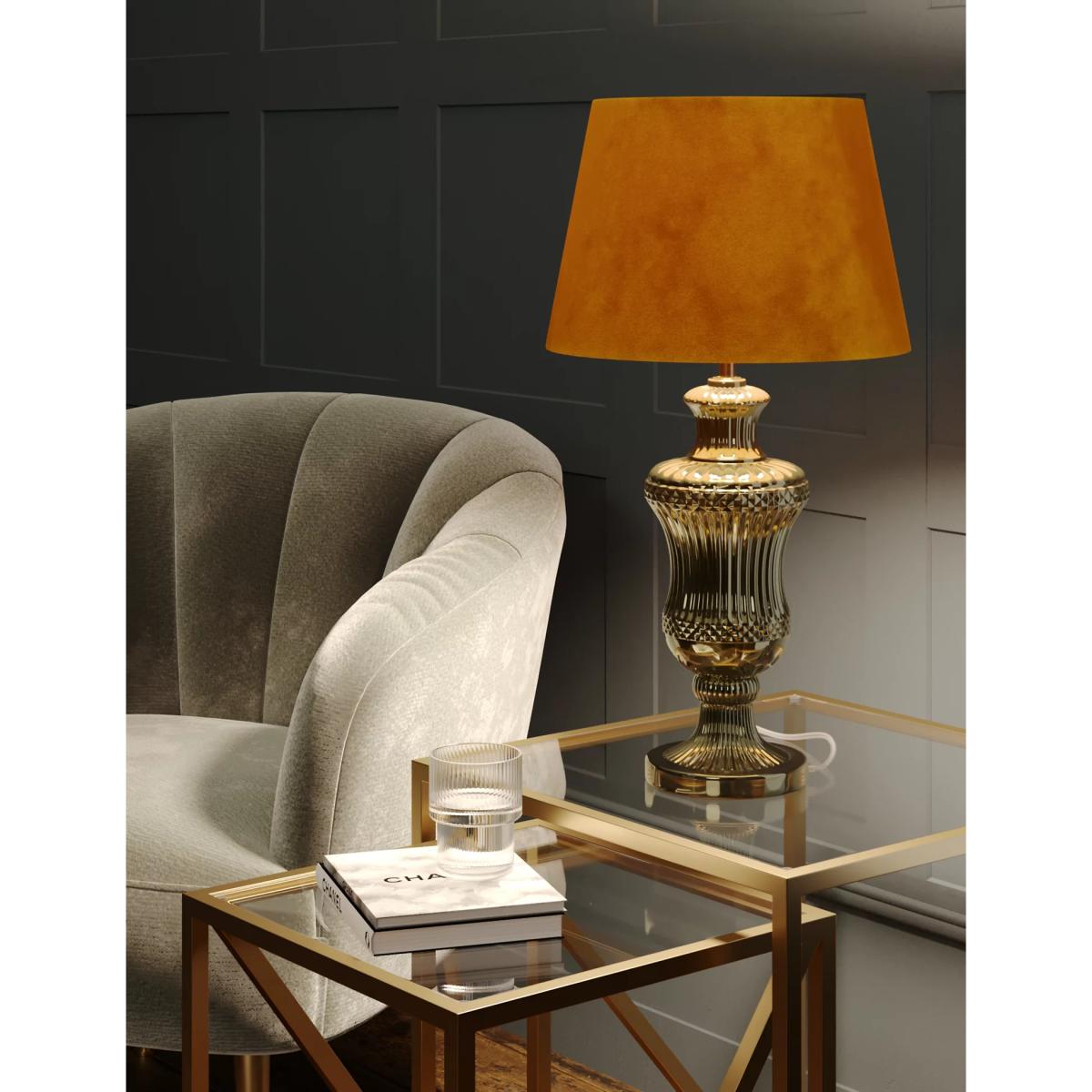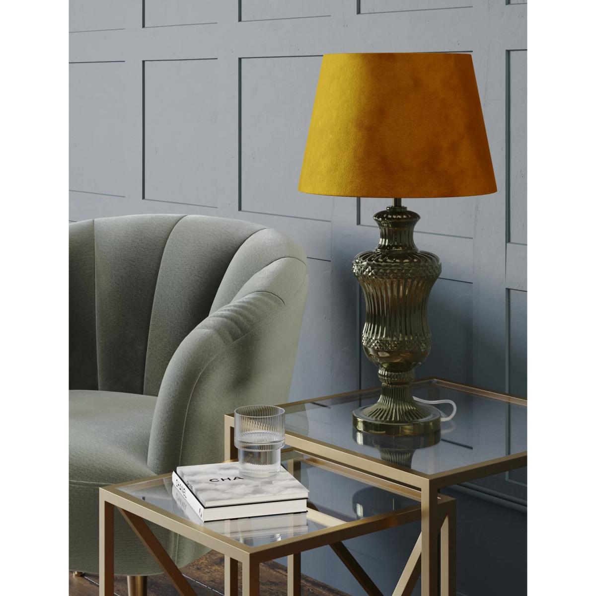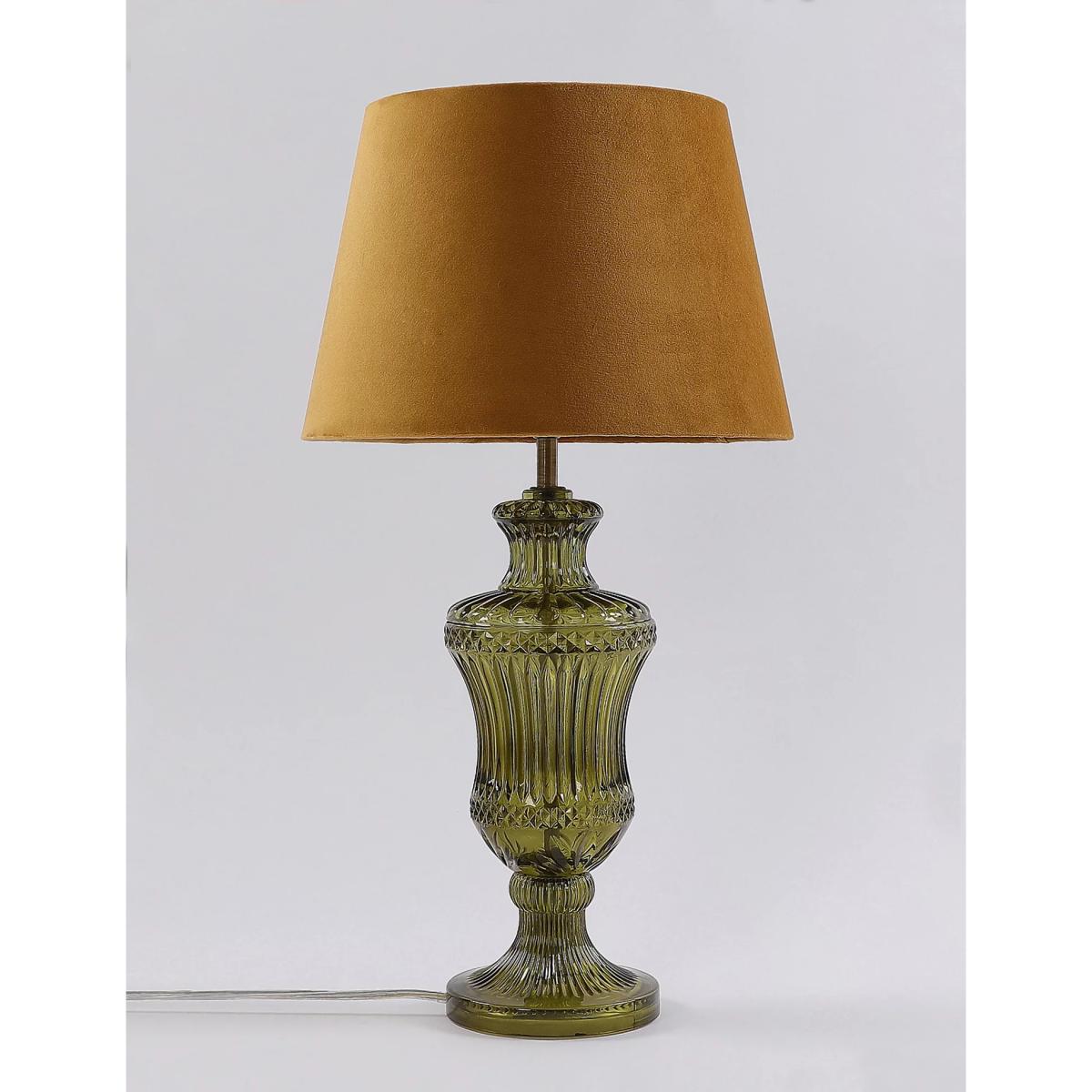 Rich hues and intricate glasswork make the Loretta table lamp a true statement piece. Embracing eclectic style, this chic design combines a mustard velvet shade with a green glass base that's elegantly shaped with voluptuous curves.
