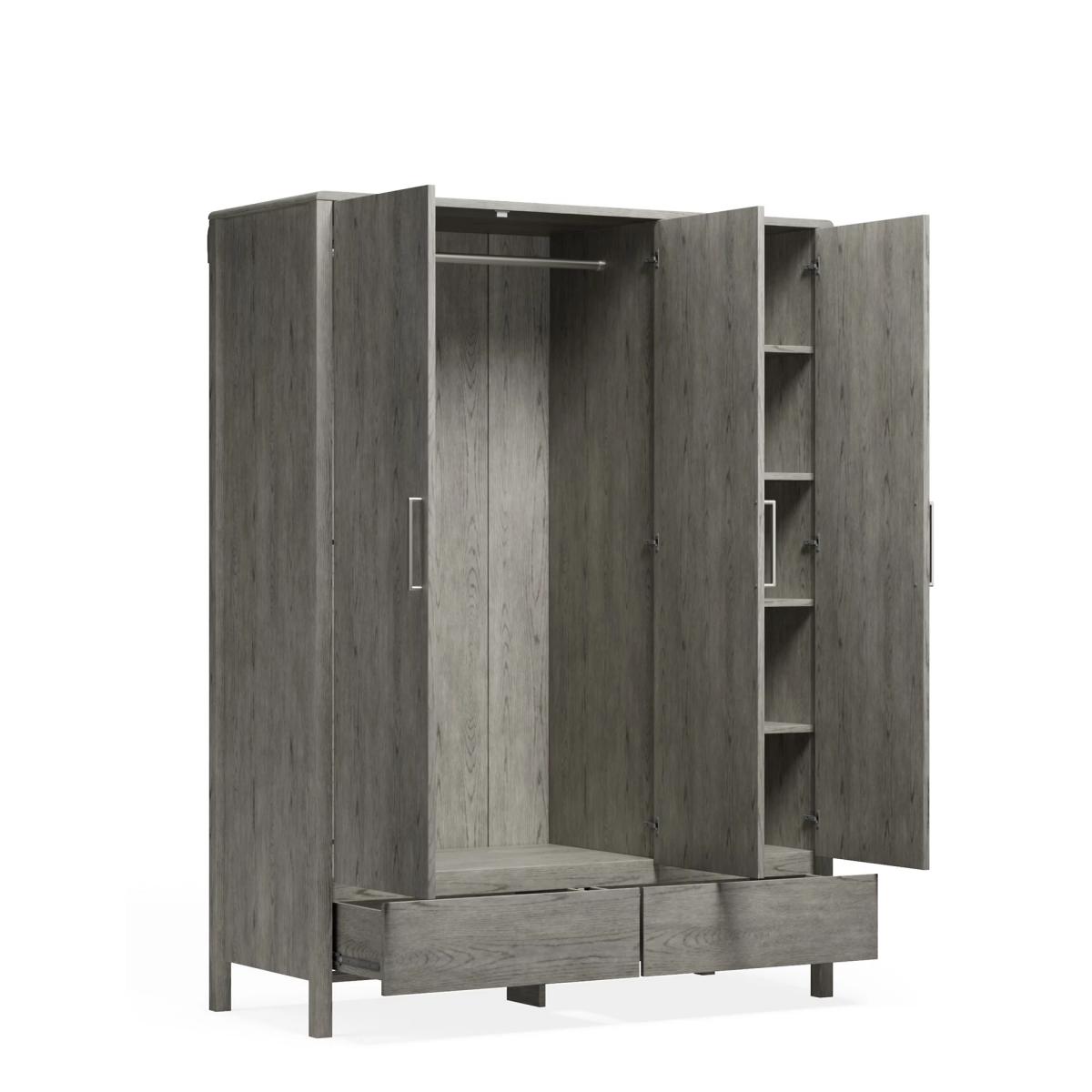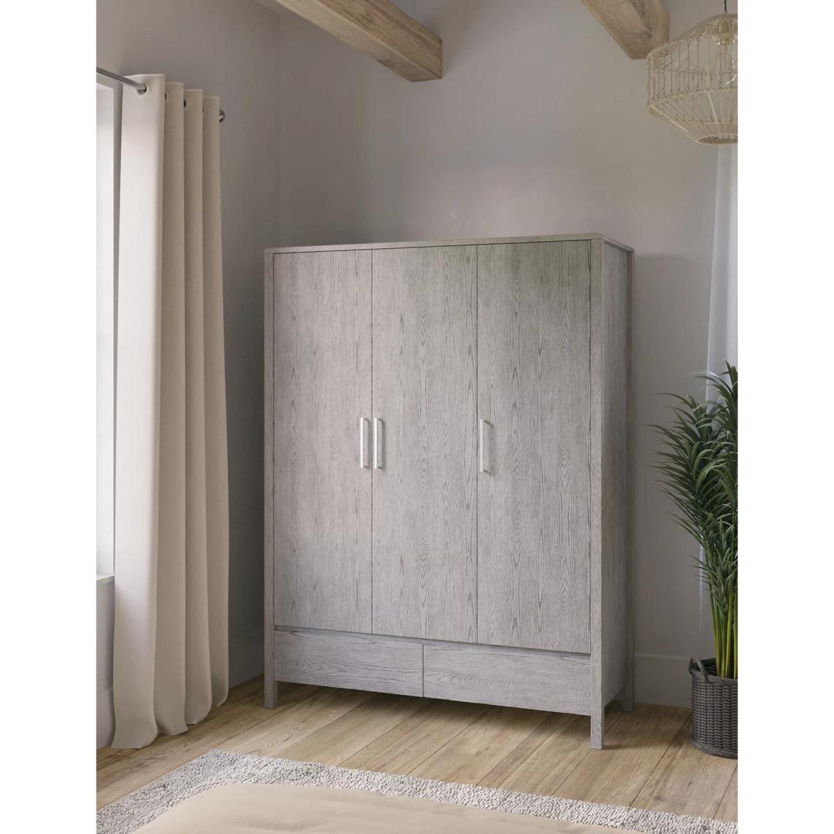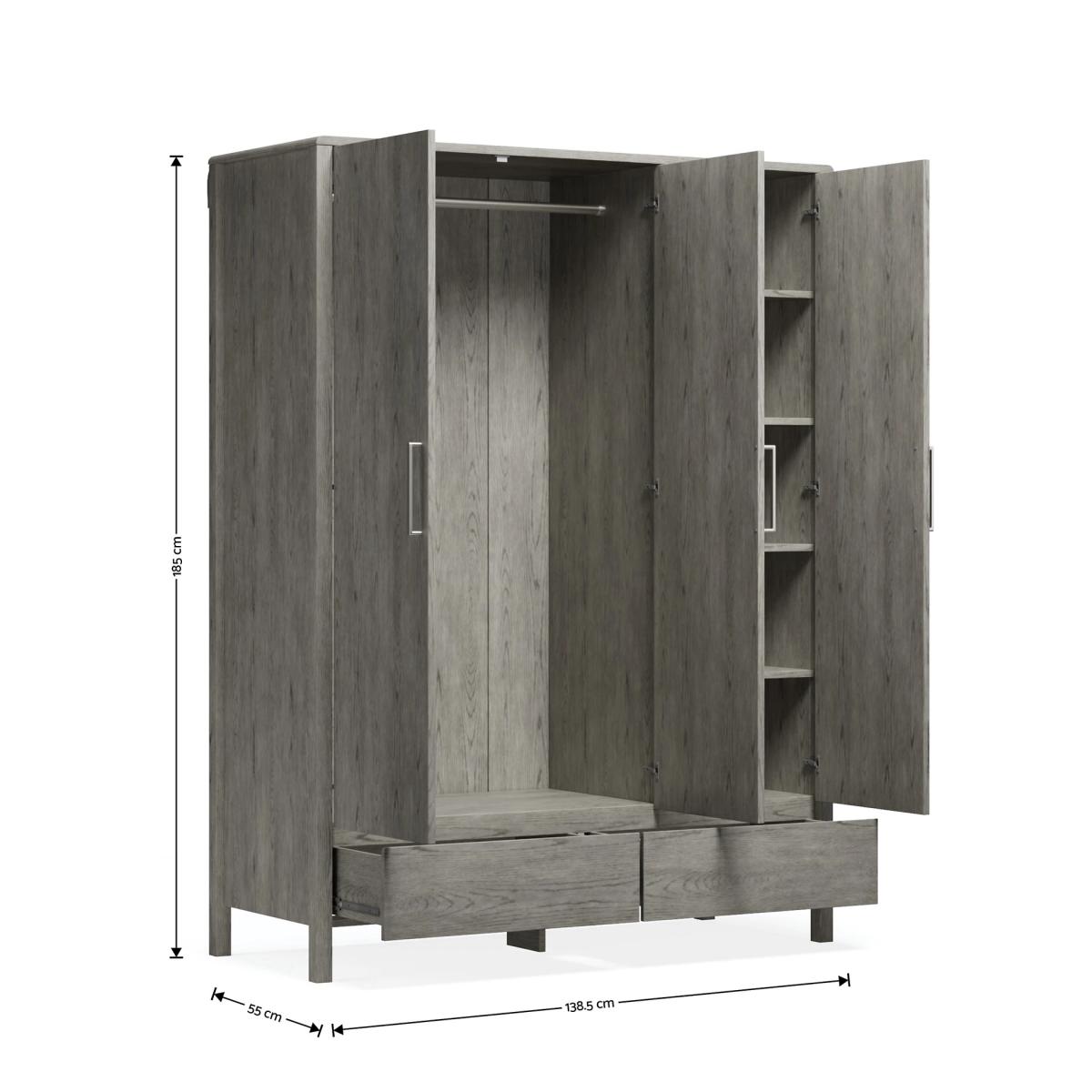 Stylish meets practical with this triple wardrobe from the Loxton range. The generous double-width hanging area is complemented by shelves behind the third door, adding storage for foldable items. Brushed metal vertical bar handles give a neat and contemporary feel. Underneath, sleek drawers mounted on metal runners make the most of every inch of space. Matching pieces are available. We’re so confident our furniture is built to last, our industry-leading guarantee covers any manufacturing failure on all furniture. That’s our promise, and why our furniture comes with a 10-year guarantee that you can trust. Excludes: outdoor furniture and any issues that are a result of normal wear and tear, improper care or accidental damage.