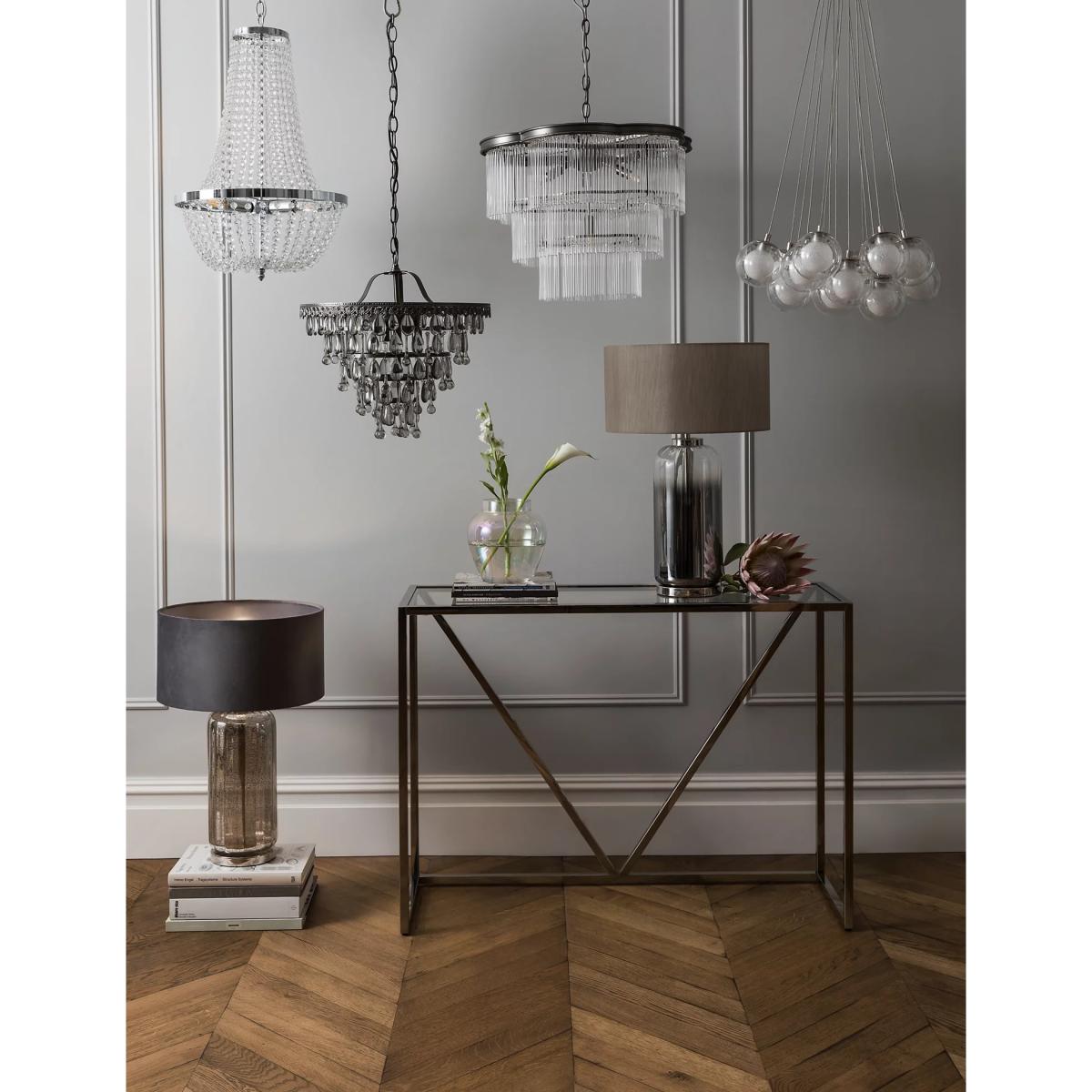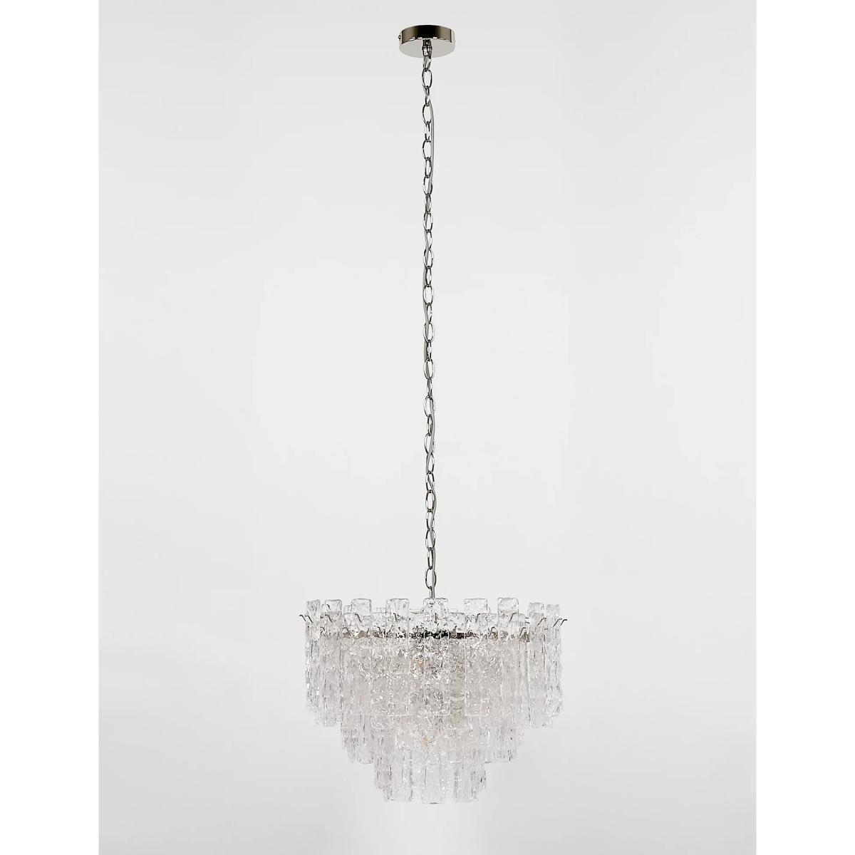 A stunning cascade of glass ensures the Madelyn chandelier will be the centre piece of your room. The textured effect will create a beautiful pattern when lit and features satin nickel detailing for added glamour. A clear cable runs through a statement chain for a beautiful finish.