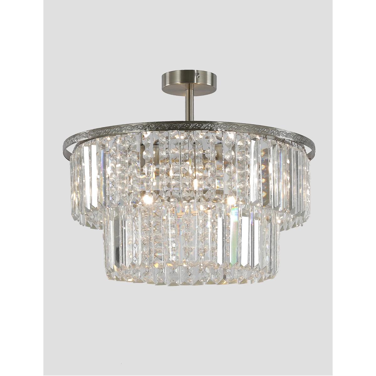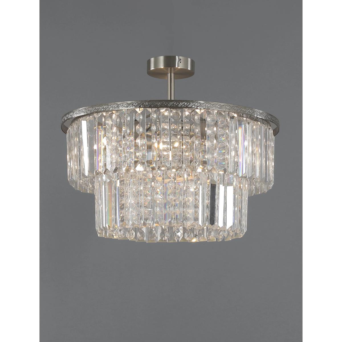 Our Marilyn chandelier is made with droplet and prism glass beads that refract the light and create a dazzling display. The satin pewter metalwork is embellished with decorative banded patterns for a luxuriously detailed finish.