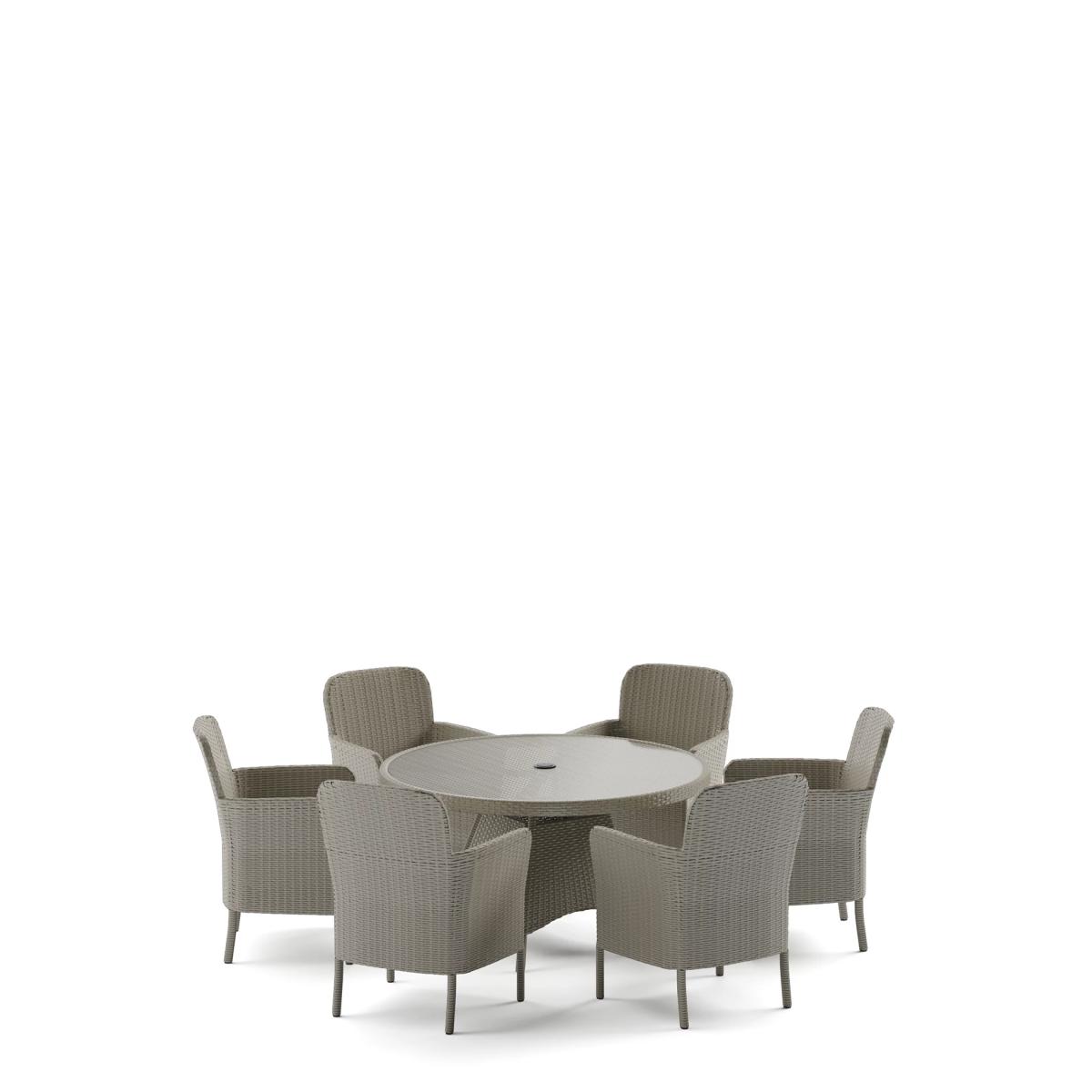 Transform your patio into a beautiful alfresco dining space with the Marlow table and chairs set. It comprises a glass-topped round table and six elegant chairs with slender arms and plush seat cushions. Natural-looking synthetic rattan forms this design's lavish chunky weave which is coated in protective paint for extra durability. This versatile piece is perfect for use in the garden or conservatory.