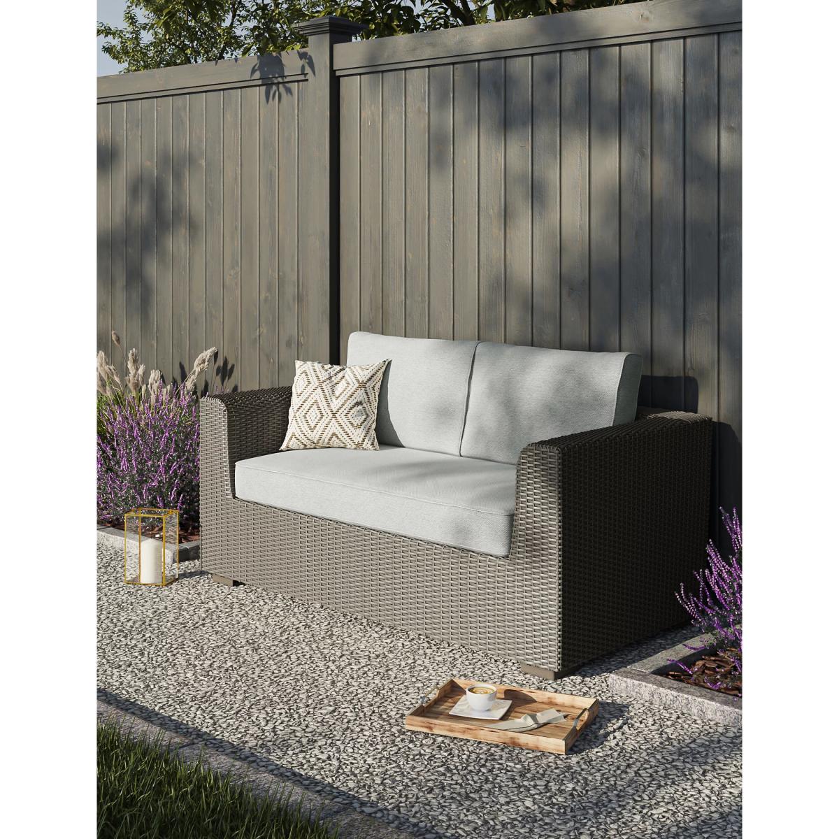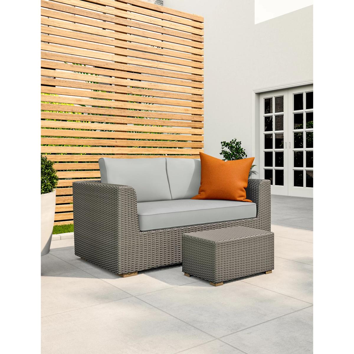 Whether unifying the neutral tones of your outdoor decor or contrasting against brighter, bolder styles, this grey Marlow outdoor sofa is a complementary addition to any garden. The contemporary style is crafted using synthetic rattan, a weatherproof, durable material, so you can be sure this sofa will withstand whatever nature throws at it. The comfortable matching cushions are also water repellent, giving you years of use without any blemishes. It's a perfect piece of garden furniture, but the Marlow sofa works just as well indoors - great for the conservatory. Treat yourself to an afternoon doze in the sun or entertain your friends and family with this versatile outdoor piece.