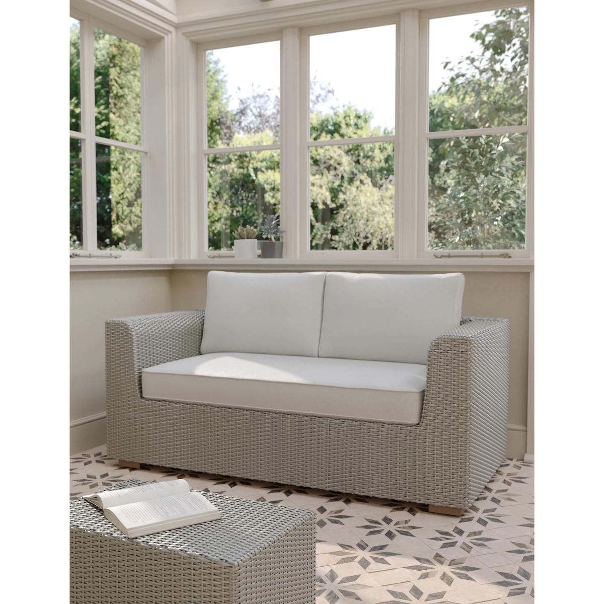 With its contemporary design and soft seating, the Marlow garden sofa will make the perfect addition to your outside space. This modern piece of furniture uses a strong metal frame for stability. It's made in a chunky, natural-looking synthetic rattan that's coated with protective paint for extra durability. The set includes comfortable cushions and is equally at home in the conservatory or garden.