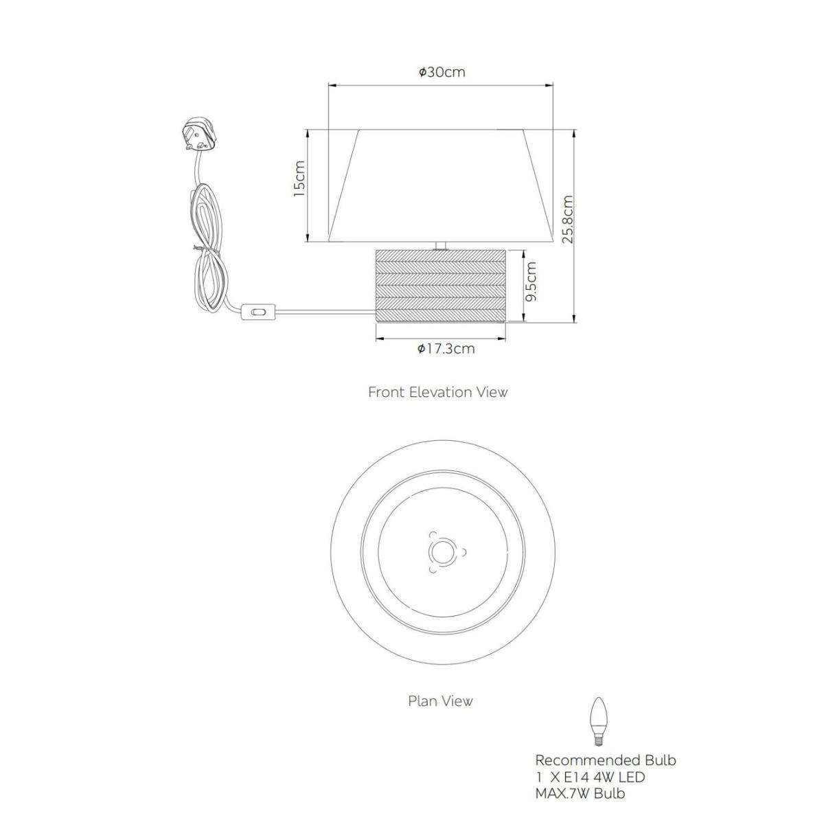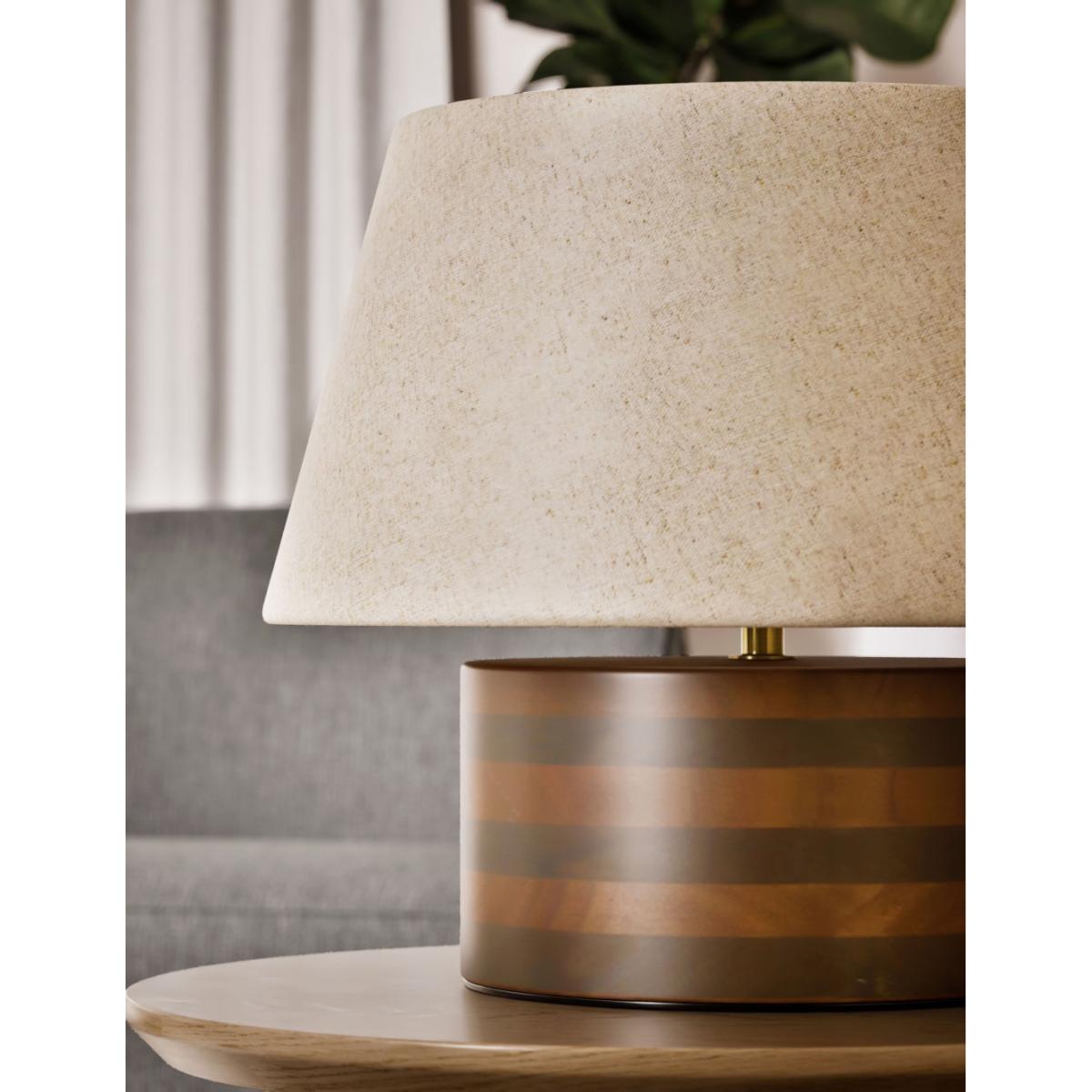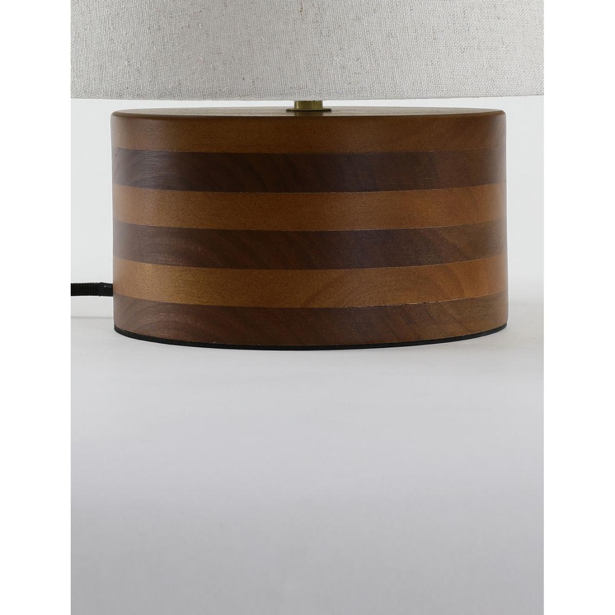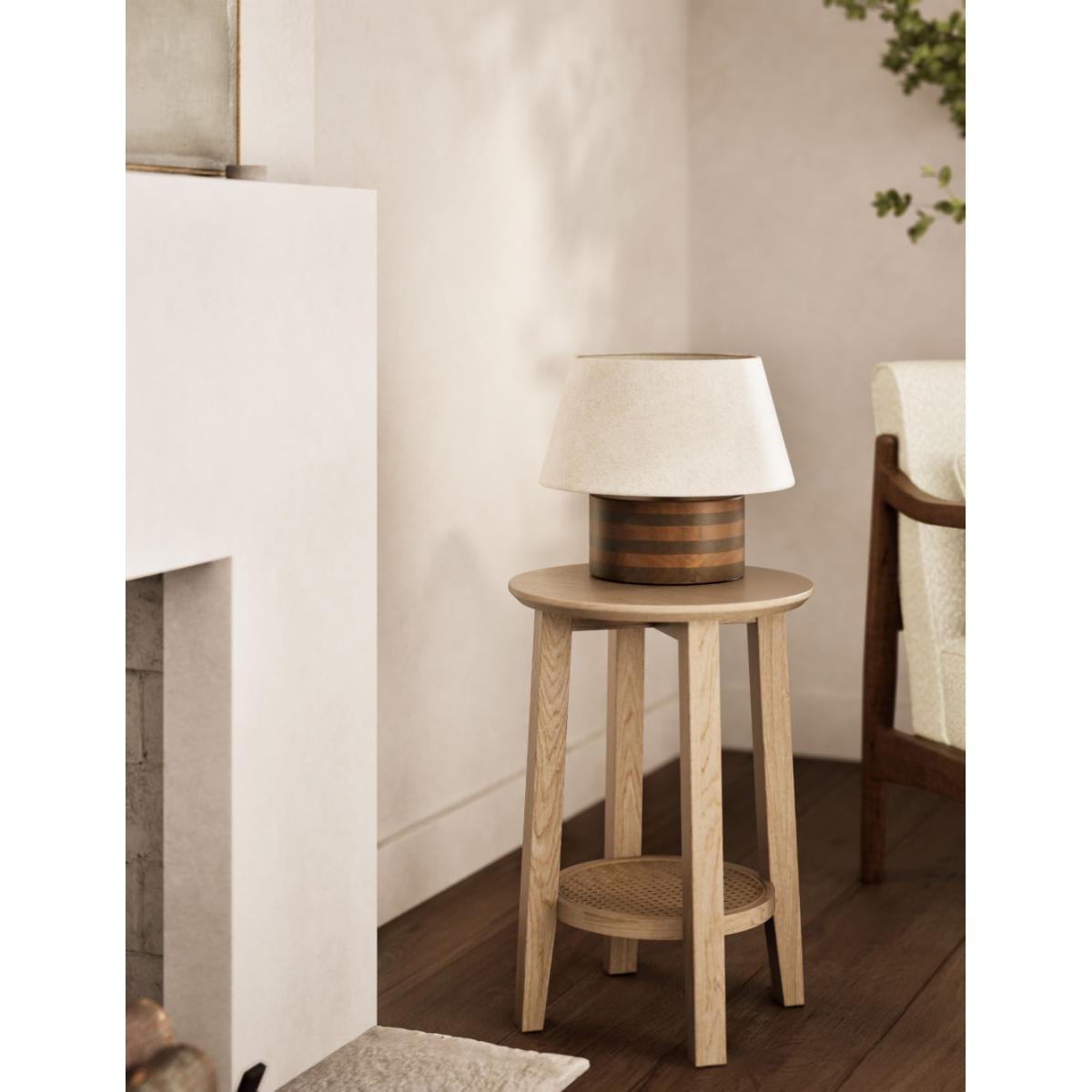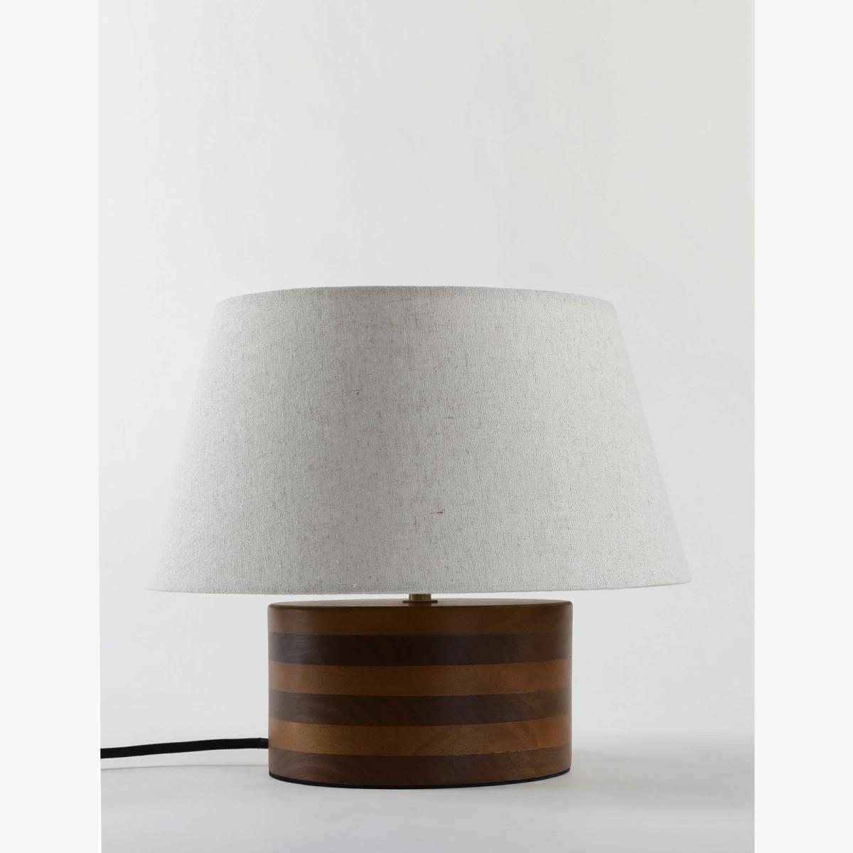 This stylish table lamp is the perfect way to add some illumination to your bedroom. It features a wide rounded base crafted from wood for a timeless look. A shallow tapered shade with subtle flecked pattern completes the design.
