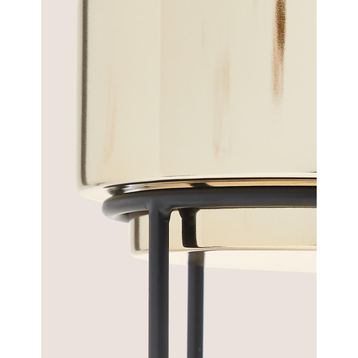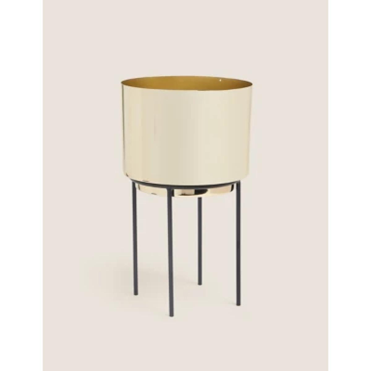 Make a stunning statement in your living space with this medium-sized planter. The gold round container sits on sleek black legs, adding to its contemporary look.