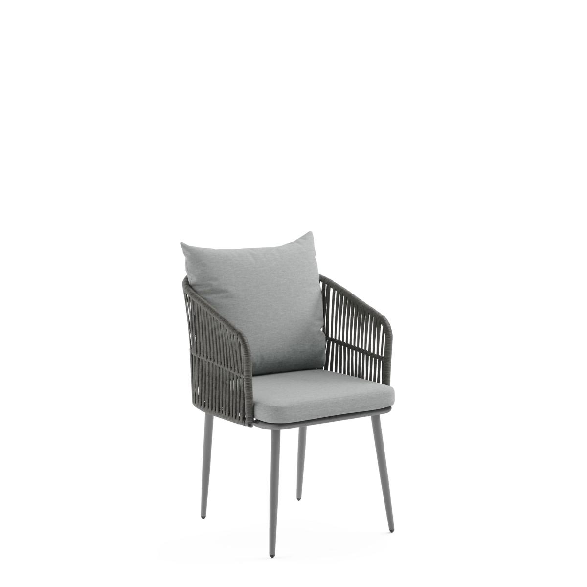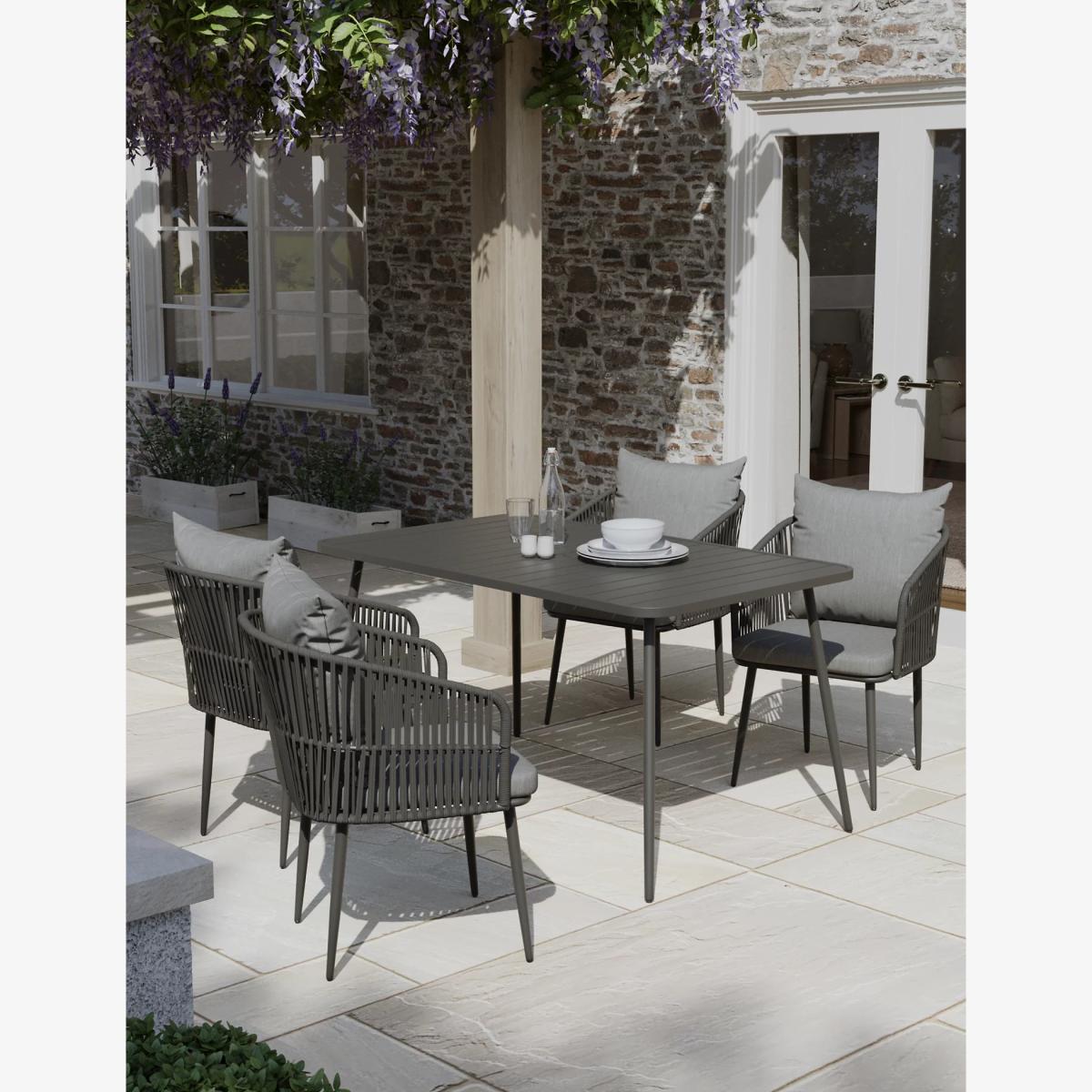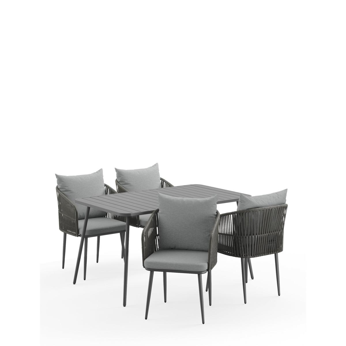 Give your garden a contemporary update with this four-seater dining set from our Melbourne range. All-weather rope adorns the back of the chairs, delivering a modern texture and hard-wearing quality. We've applied protective paint to the table and chairs' metal frame for extra durability. The seat cushions are included in the set.