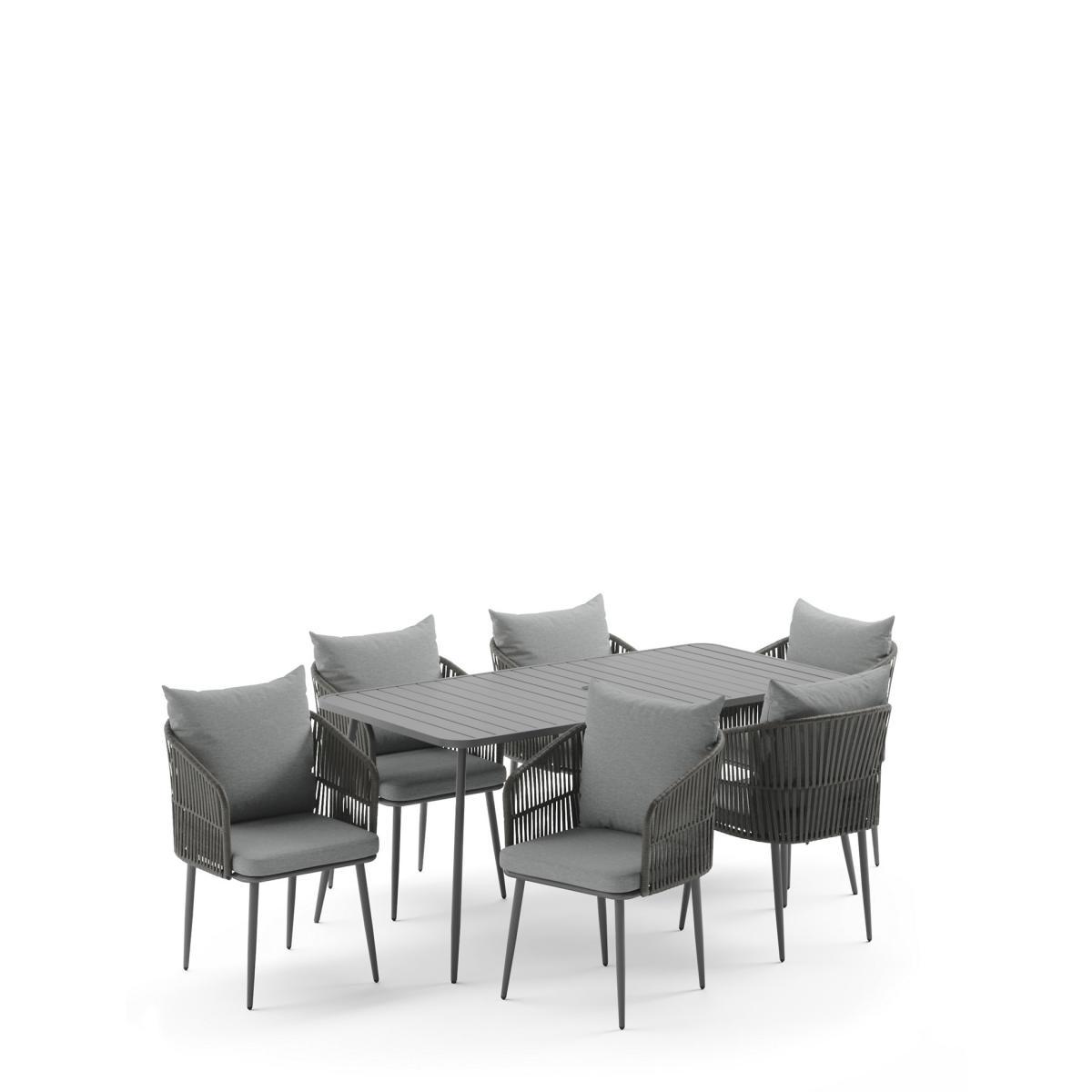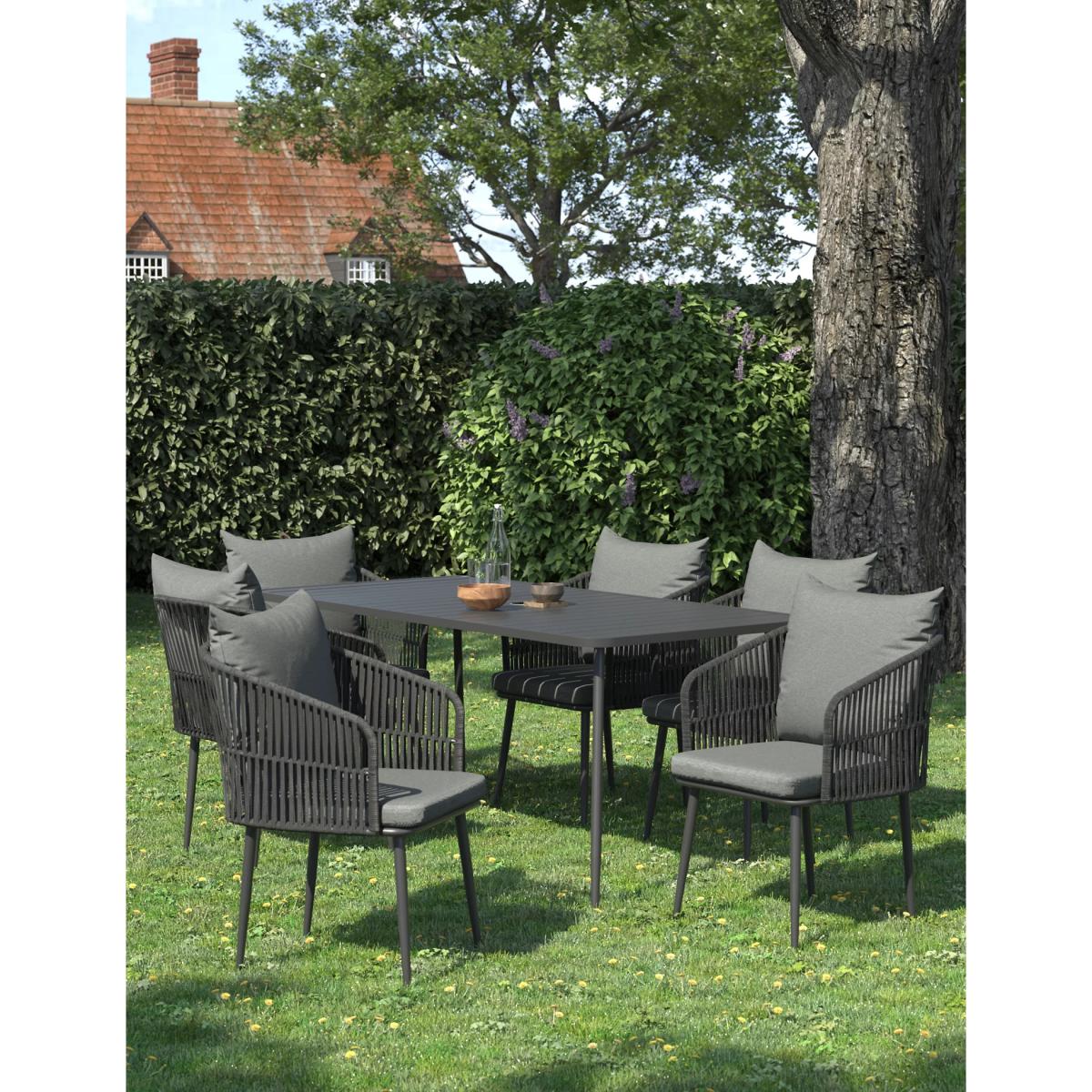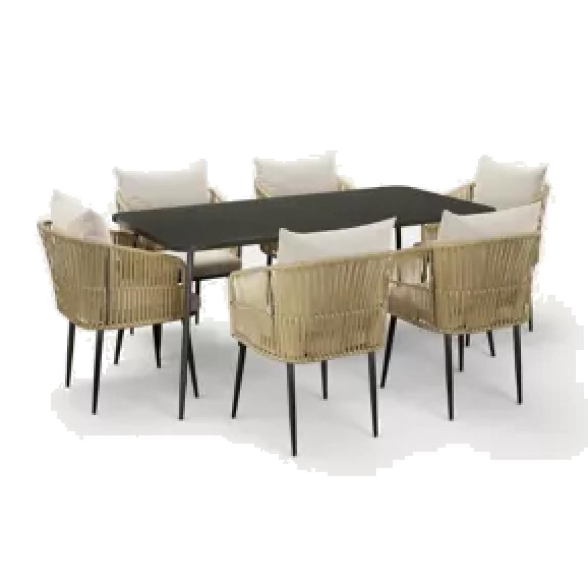 Dine alfresco in style with this modern table and chairs set from our Melbourne range. Six comfortable cushion-topped chairs sit around a rectangular table, with each piece featuring slender legs for contemporary elegance. Durable all-weather rope and protective paint on the metal frames ensure a durable finish.