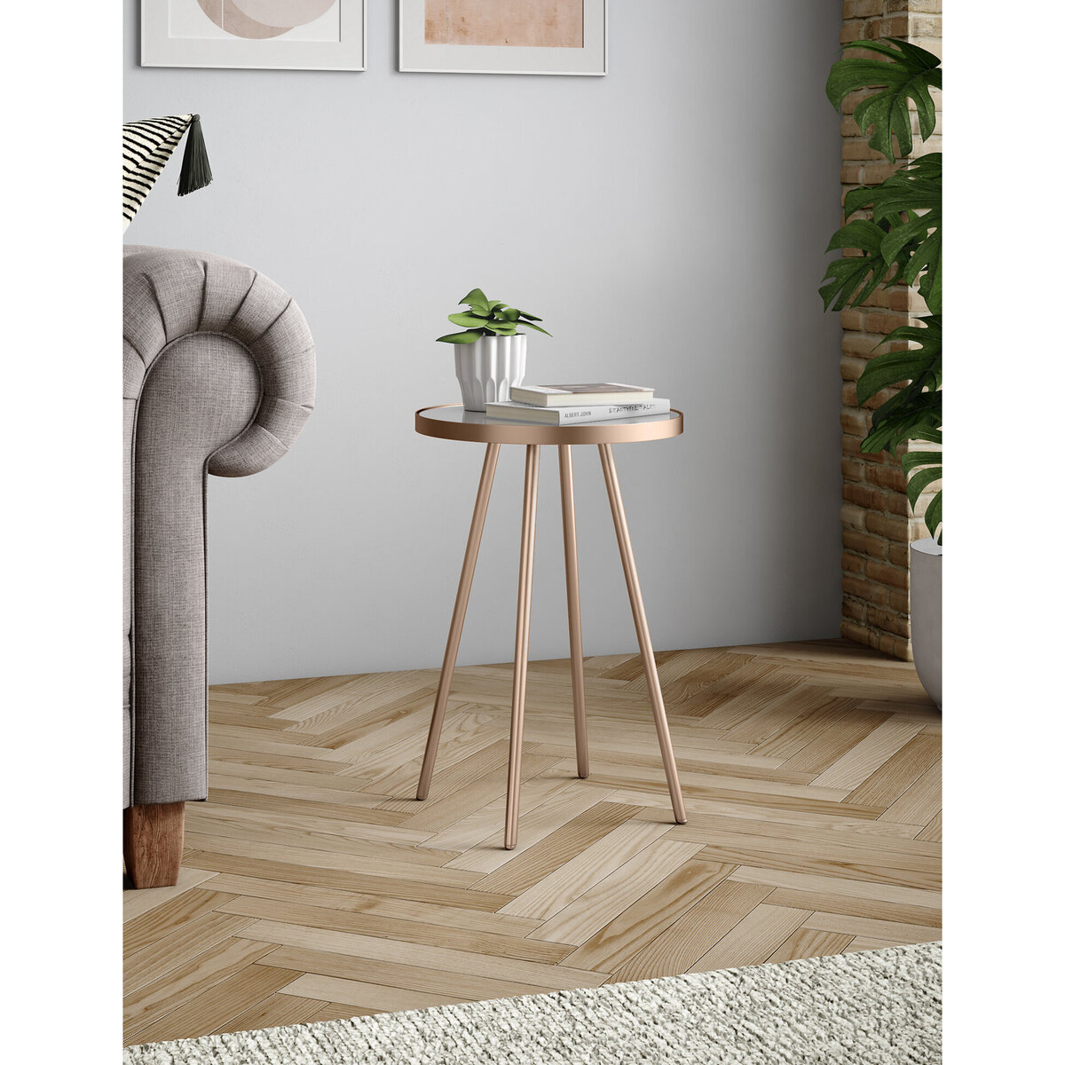 I love this copper and glass side table for its sleek, contemporary feel with a touch of warmth thanks to the metallic finish. It works particularly well in modern or minimalist interiors, where its clean lines and reflective surface can add a sophisticated element. It's versatile enough to serve as a bedside table, accent piece in a living room, or even a handy spot for a drink or book next to a sofa. Styling tips include pairing it with neutral tones for a sophisticated look, or accenting with textured accessories like soft throws or ceramics to create visual interest. Its compact size makes it an easy addition to almost any space, effortlessly adding a bit of glamour without overwhelming the room.